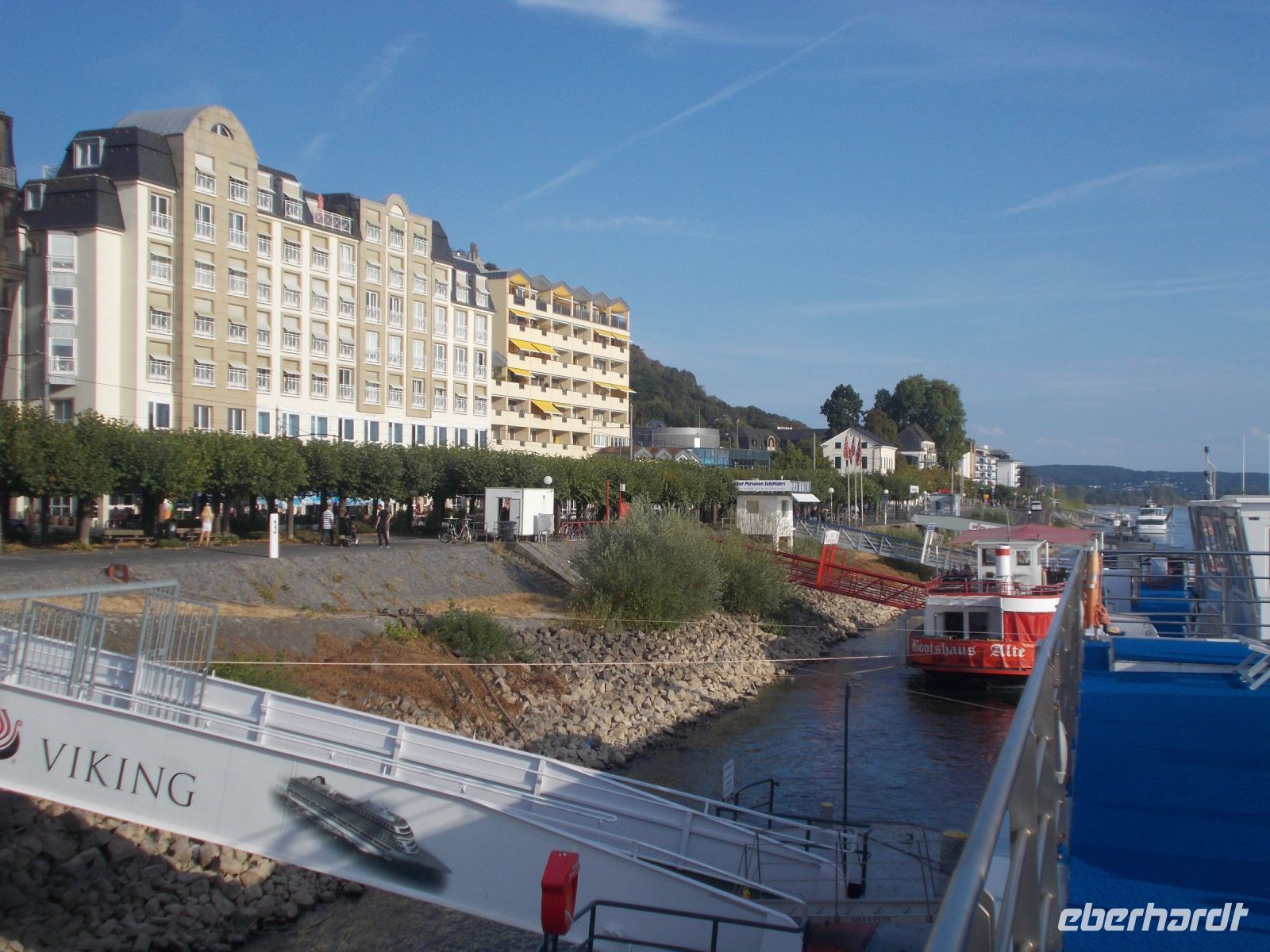 Von der Elbe an den Rhein. Unter diesem Motto starteten wir, am frühen Morgen, in Dresden.Nach einigen wenigen Zustiegen war unsere Reisegruppe komplett und wir fuhren Richtung Königswinter an den Rhein. Leider gab es bei Limburg einen Zwischenfall auf der Autobahn. Wir entschlossen uns für eine Fahrt über die Landstraße und hatten somit gleichzeitig eine gratis Rundfahrt durch den Westerwald. Wir kamen zügig voran, so das wir am Nachmittag mit Kaffee und Kuchen an Bord begrüßt wurden. Unser schwimmendes Hotel „MS Aurora“ lag an der Rheinpromenade und diese lud zu einem Abendbummel ein. Königswinter ,am Fuße des Siebengebirges – mit dem Drachenfelsen- gelegen, den man mit der Zahnradbahn erreichen kann, hat eine sehr hübsche Altstadt mit vielen Fachwerkbauten. Nach Karl Simrock soll Siegfried, in der Nibelungensage, den Drachen dort getötet haben. An Bord gab es einen ersten Empfang, dabei stellten sich der Kapitän Oskar und die Bordreiseleiterin Regina vor. Es wurde mit einem Glas Sekt auf eine „ gute Reise“ angestoßen.