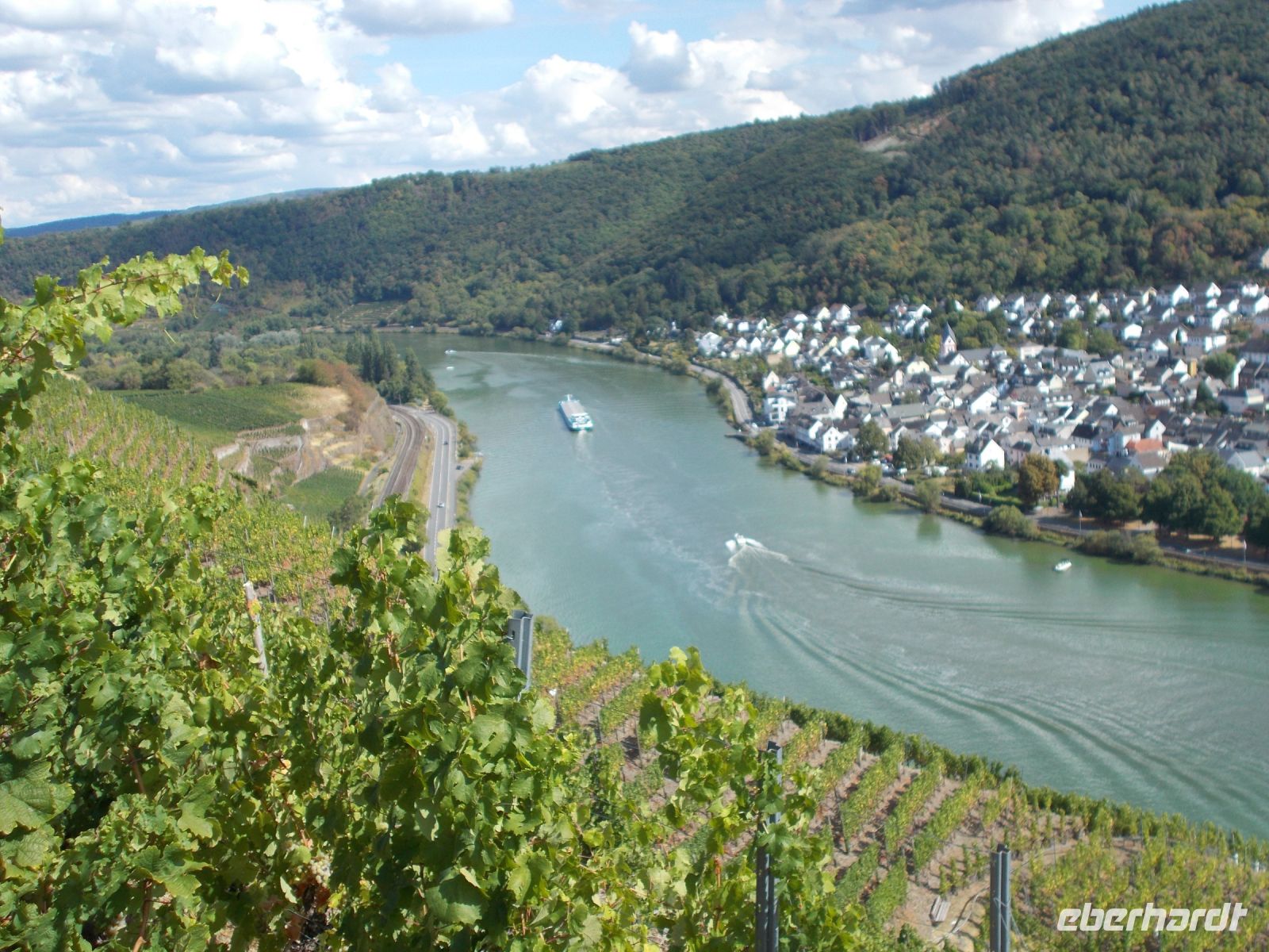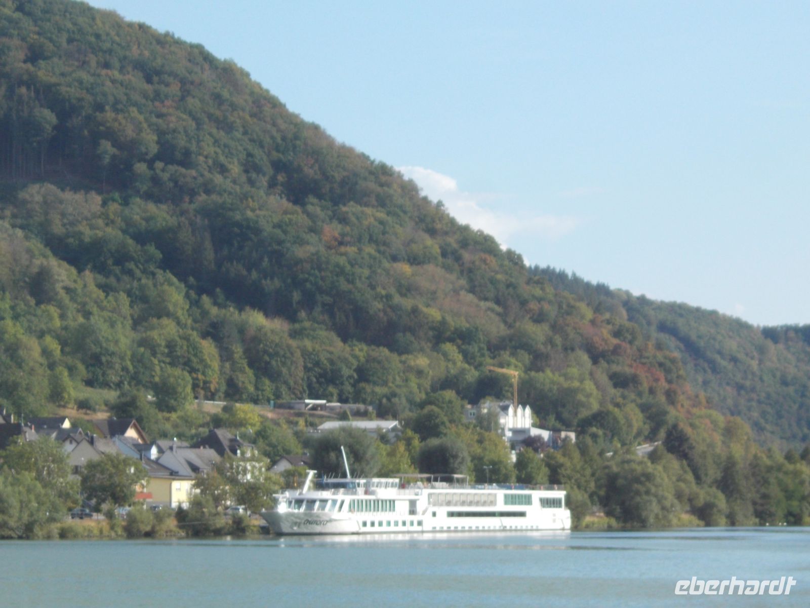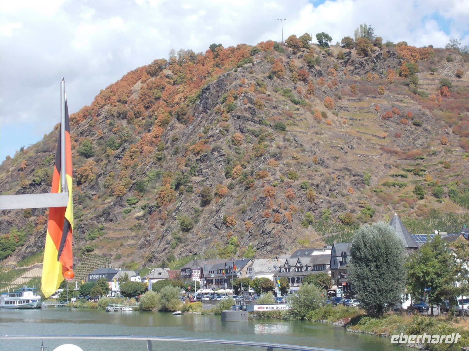 Der Maler Herbst fängt an seine Farben, hier im Moseltal, zu verteilen.Wir sitzen, bei etwas kühleren Temperaturen, auf dem Sonnendeck und genießen noch einmal die vorbeiziehende Landschaft. Auf der einen Seite grüßt der Hundsrück,- auf der anderen Seite die Eifel,- geteilt durch die sanft fließende Mosel. Überall sind die Weinfeste in vollem Gange und die Gäste feiern freudig mit. In Winningen wird das älteste Weinfest gefeiert und nicht nur die Weinkönigin sondern auch die Weinhexe wird hier, nach altem Brauch, gekürt. Auch wir besuchten einen Winzer der Region und labten uns am Moselwein. Zuvor war eine Weinbergwanderung geplant und bei „Hochsommerlichen Temperaturen“ war dies für einige Gäste schon eine Strapaze. Wir konnten nur die Arbeit, in den Weinbergen von der Pflanzung, über Pflege, bis zur Lese, bewundern. Völlig „ erschöpft “wurden wir mit dem köstlichen Moselwein, des Weingutes Weyh, erfrischt. So manches Fläschchen, des gute Tropfens, gesellte sich zum Bus und trat mit uns die Heimreise an. Leider war es unser letzter Abend an Bord. Kapitän Oscar verabschiedete sich, mit seiner gesamten Crew, mit einem Glas Sekt von uns. Zum Abschluss unserer Reise wurden wir mit einem Feuerwerk erfreut, welches am Ufer der Mosel gezündet wurde. Nun hieß es aber wirklich - Koffer packen !