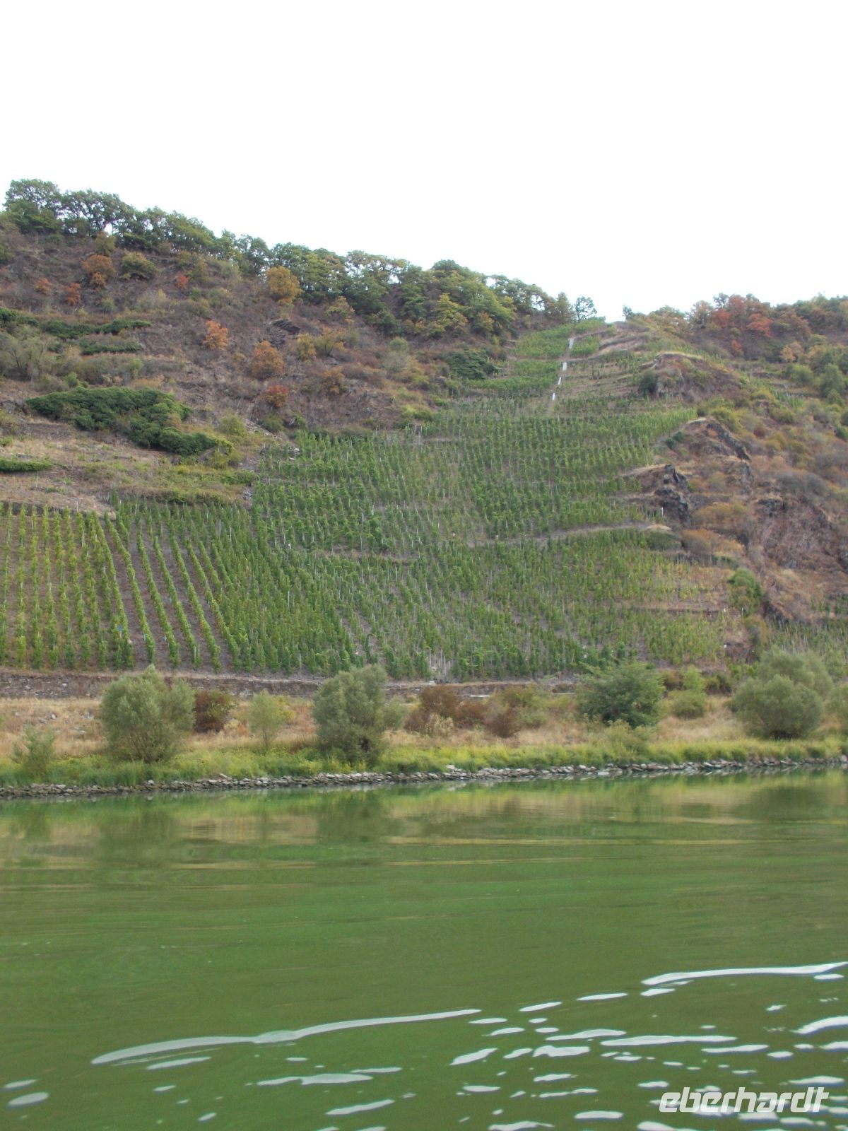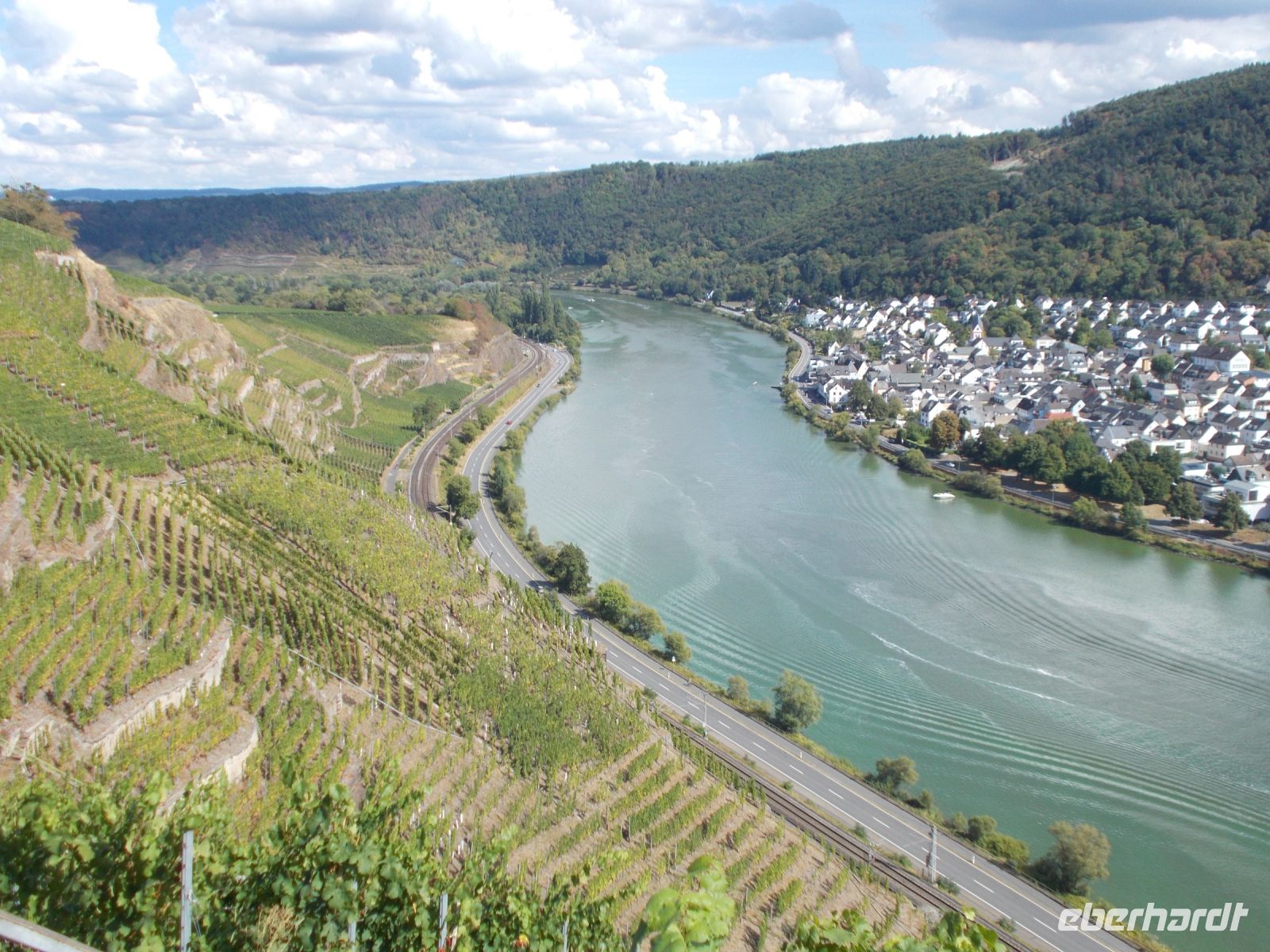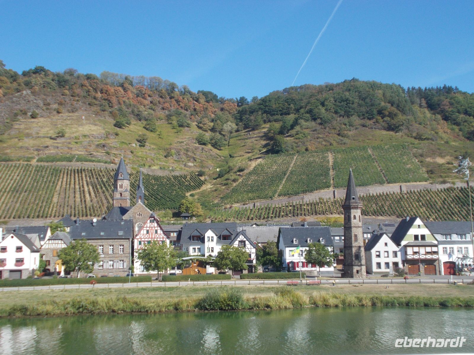 Der Maler Herbst fängt an seine Farben, hier im Moseltal, zu verteilen.Wir sitzen, bei etwas kühleren Temperaturen, auf dem Sonnendeck und genießen noch einmal die vorbeiziehende Landschaft. Auf der einen Seite grüßt der Hundsrück,- auf der anderen Seite die Eifel,- geteilt durch die sanft fließende Mosel. Überall sind die Weinfeste in vollem Gange und die Gäste feiern freudig mit. In Winningen wird das älteste Weinfest gefeiert und nicht nur die Weinkönigin sondern auch die Weinhexe wird hier, nach altem Brauch, gekürt. Auch wir besuchten einen Winzer der Region und labten uns am Moselwein. Zuvor war eine Weinbergwanderung geplant und bei „Hochsommerlichen Temperaturen“ war dies für einige Gäste schon eine Strapaze. Wir konnten nur die Arbeit, in den Weinbergen von der Pflanzung, über Pflege, bis zur Lese, bewundern. Völlig „ erschöpft “wurden wir mit dem köstlichen Moselwein, des Weingutes Weyh, erfrischt. So manches Fläschchen, des gute Tropfens, gesellte sich zum Bus und trat mit uns die Heimreise an. Leider war es unser letzter Abend an Bord. Kapitän Oscar verabschiedete sich, mit seiner gesamten Crew, mit einem Glas Sekt von uns. Zum Abschluss unserer Reise wurden wir mit einem Feuerwerk erfreut, welches am Ufer der Mosel gezündet wurde. Nun hieß es aber wirklich - Koffer packen !