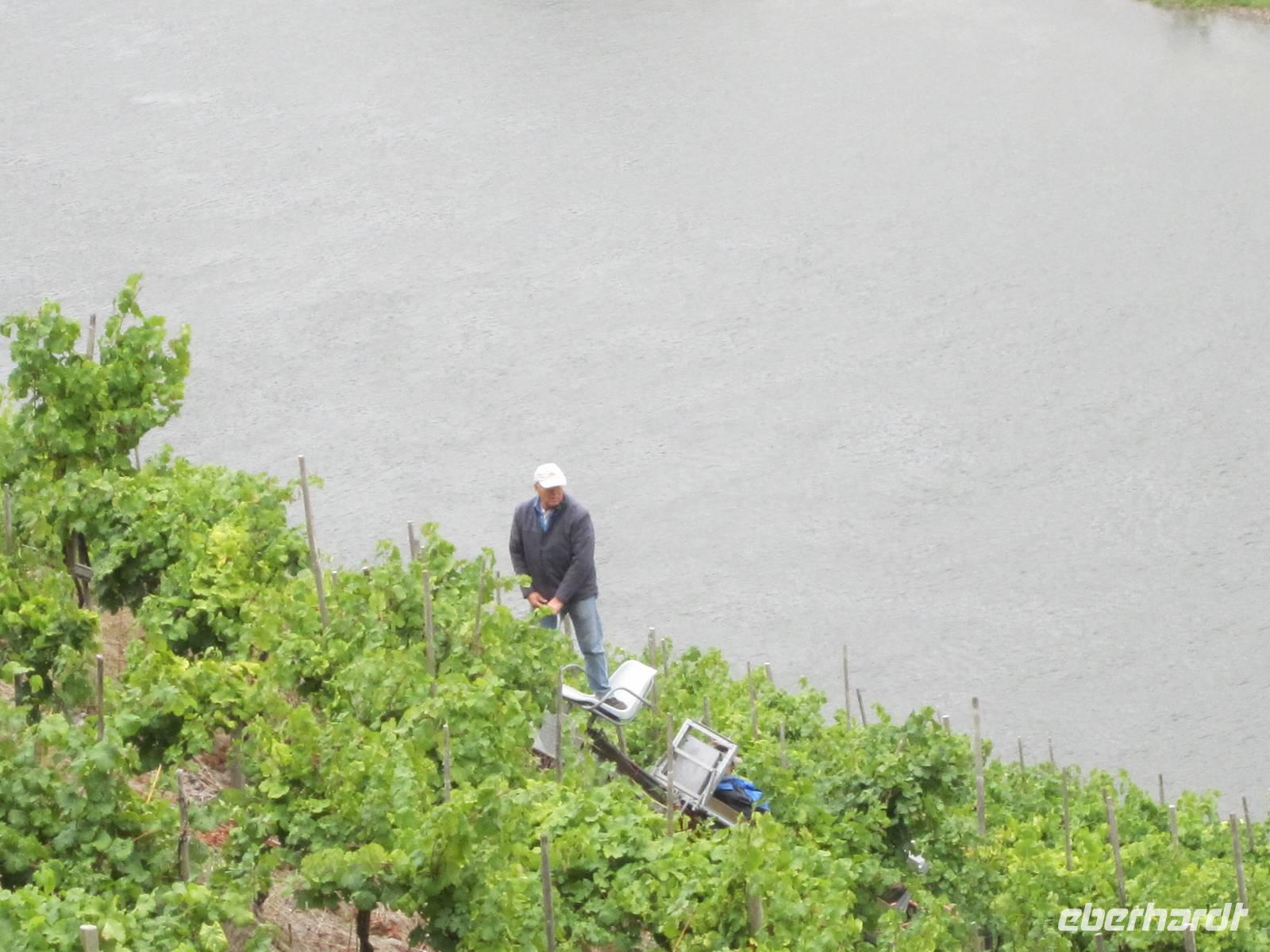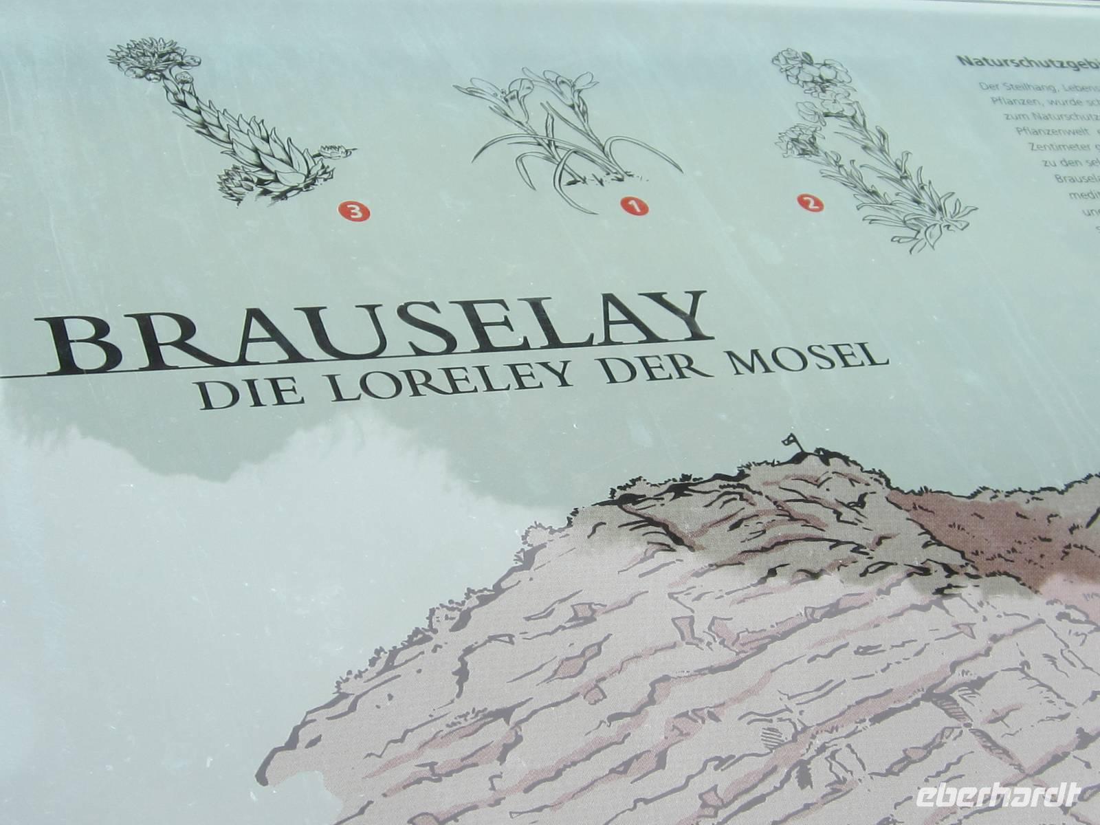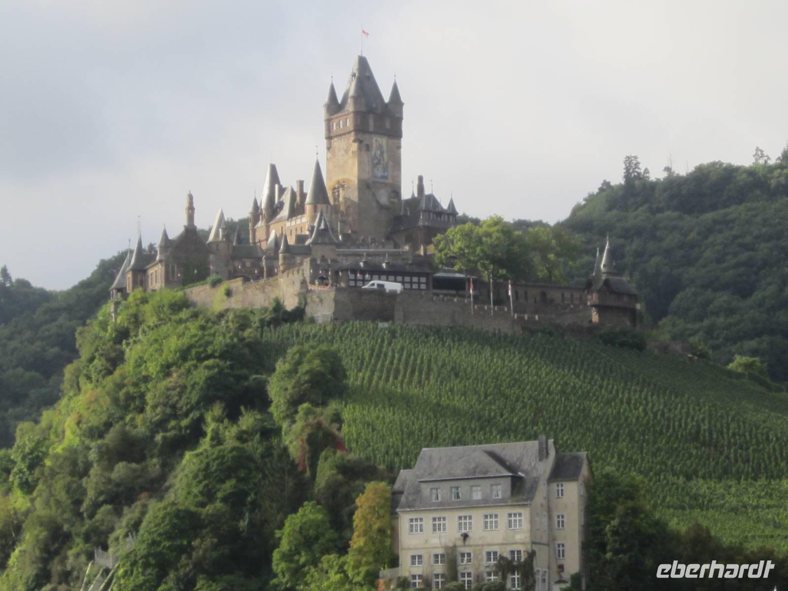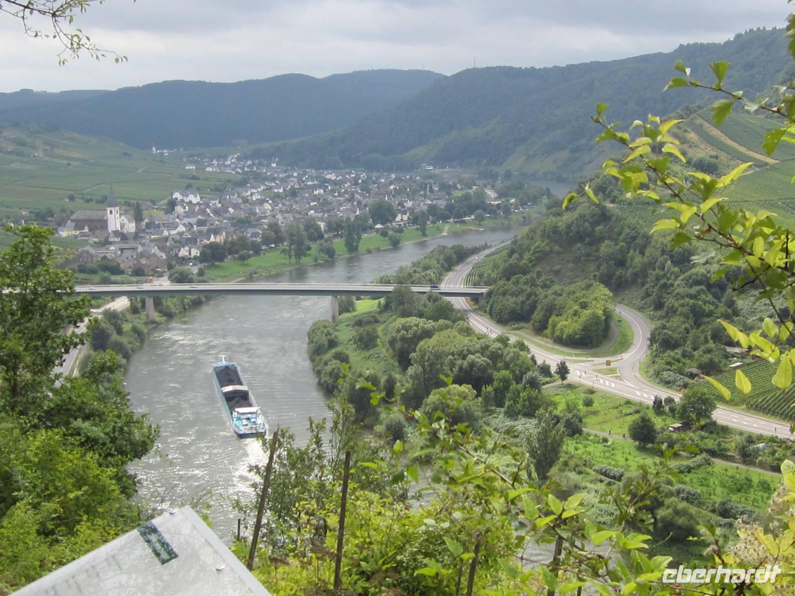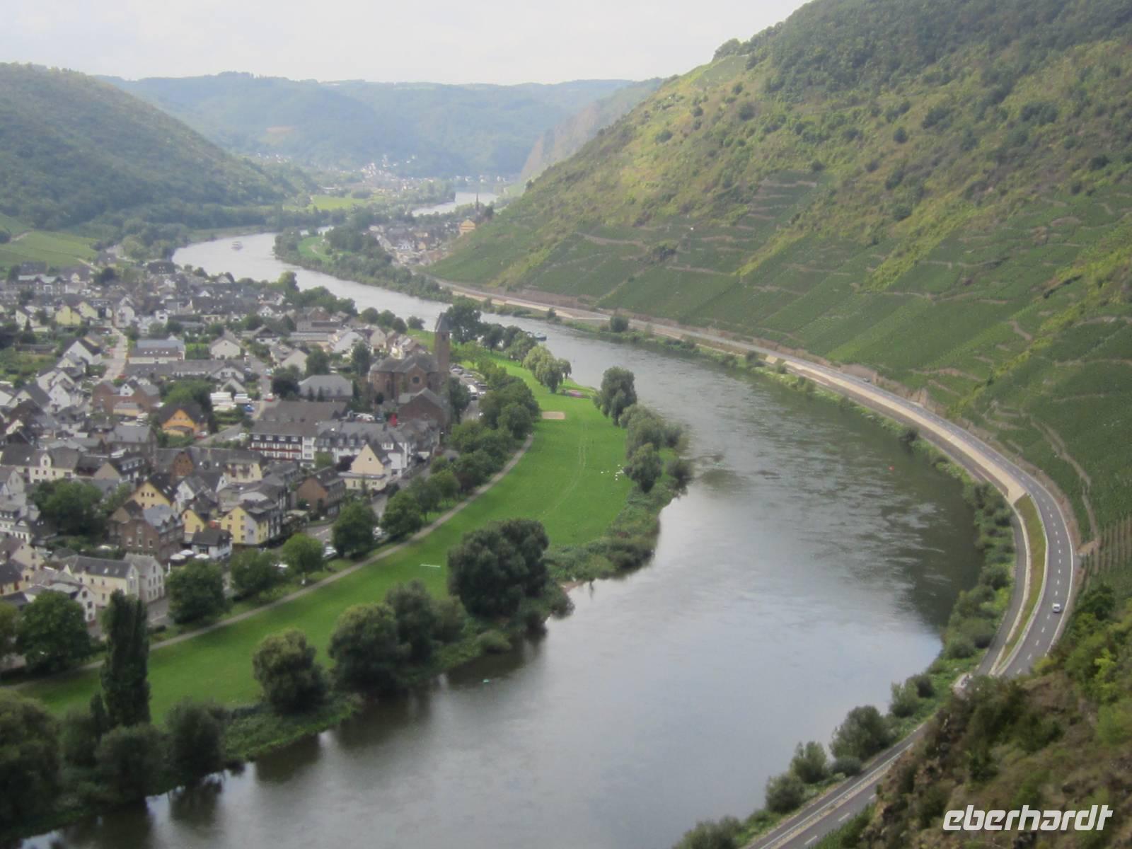 Überall regnet es, aber über uns hat sich blauer Himmel aufgetan. Cochem ist einfach zauberhaft. Majestätisch erhebt sich die Reichsburg über den Ort. Die Cochemer waren klug genug, den Berliner Fabrikanten Jakob Louis Ravené, der sich in diese Gegend verliebt hatte, hier im 19. Jahrhundert investieren zu lassen und profitieren heute noch von diesem zauberhaften Blickfang. Die Burg begleitet uns lange auf unserer Wanderung zum Brauseley-Felsen, der Loreley der Mosel. Hier kann man seltene Pflanzen wie Felsengoldstern, Goldlack, Mauerpfeffer, Dachhauswurz und Beifuß-Wimpernperlgras und Tiere finden.. Nicht zu vergessen Buchsbaum, der sich in den quarzitischen Sandsteinbänken und weichen Schieferlagen auch sehr wohl zu fühlen scheint. Wildschweine treffen wir zum Glück nicht, aber einige Ziegen laufen gemütlich auf einer höher gelegenen Straße entlang, die sind wohl ausgebüchst. Die ordentlich gesetzten Weinreben an den Steilhängen beeindrucken uns sehr, aber diese Arbeit... Wir entdecken ein übliches Transportsystem, das über Japan und die Schweiz an die Mosel gelangte, die Monorackbahn und genießen versöhnlich unsere Wanderrast mit einer unvergleichlichen Aussicht auf die mäanderartige Mosel. Weiter geht es auf dem Apollopfad, vorbei am Kloster Herbrach Richtung Valwig-Ernst-Bruttig (BREVA). In Ernst angekommen, freuen wir uns im "Windbeutel" auf Kaffee und Kuchen, informieren uns im Eichamt und kehren dann beim Winzer Georg Andres Söhne zu einer vergnüglichen Weinprobe ein.