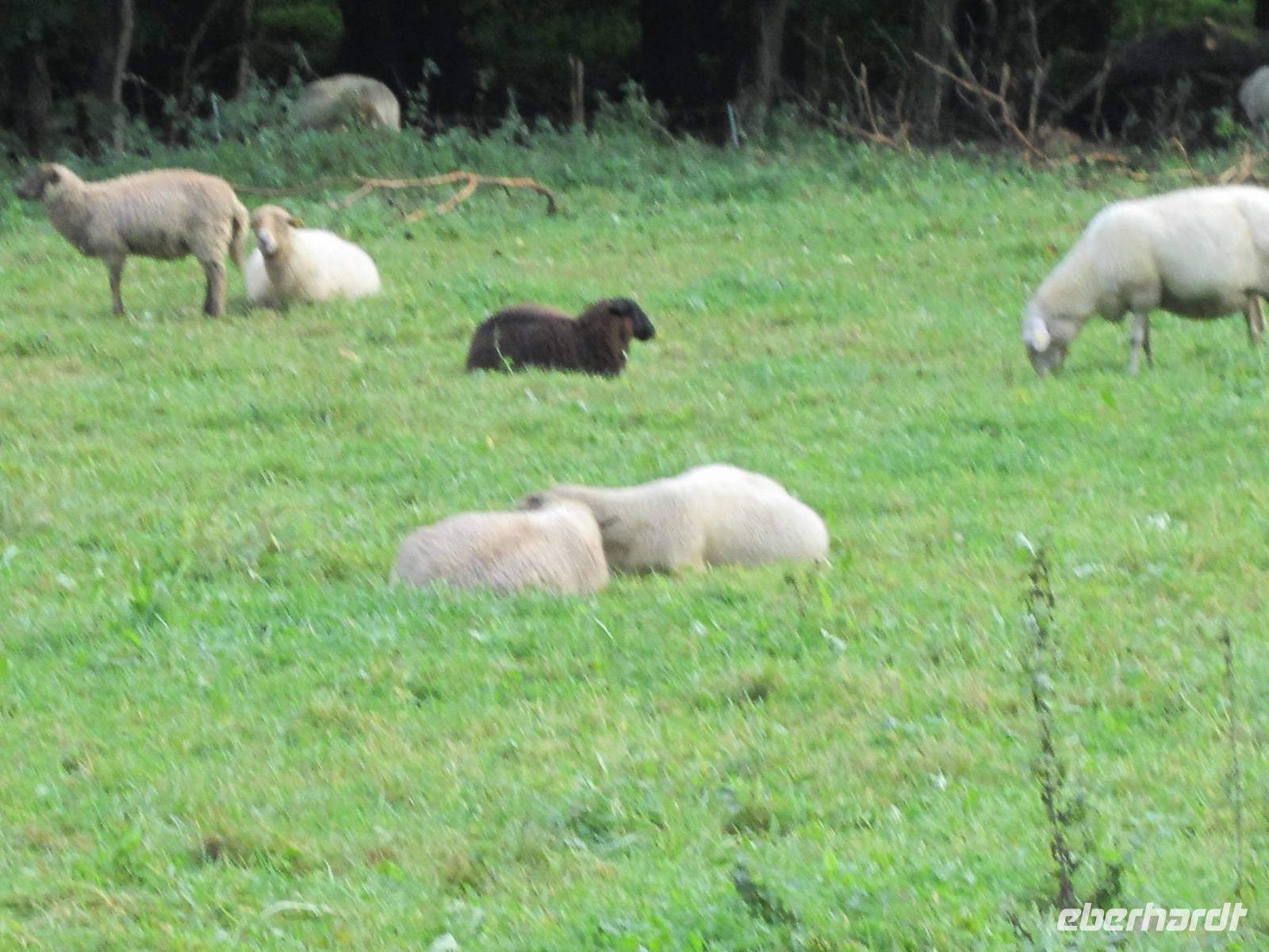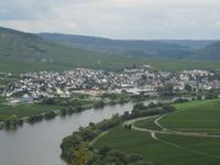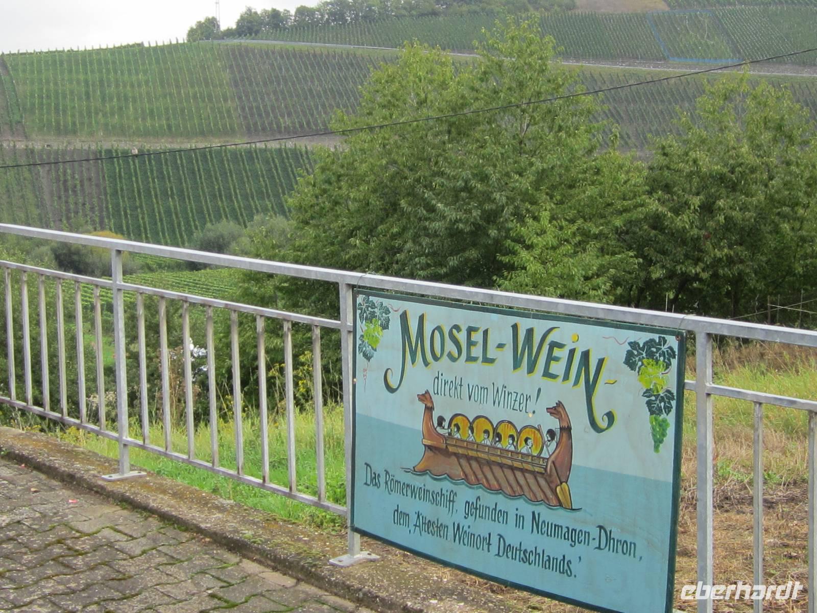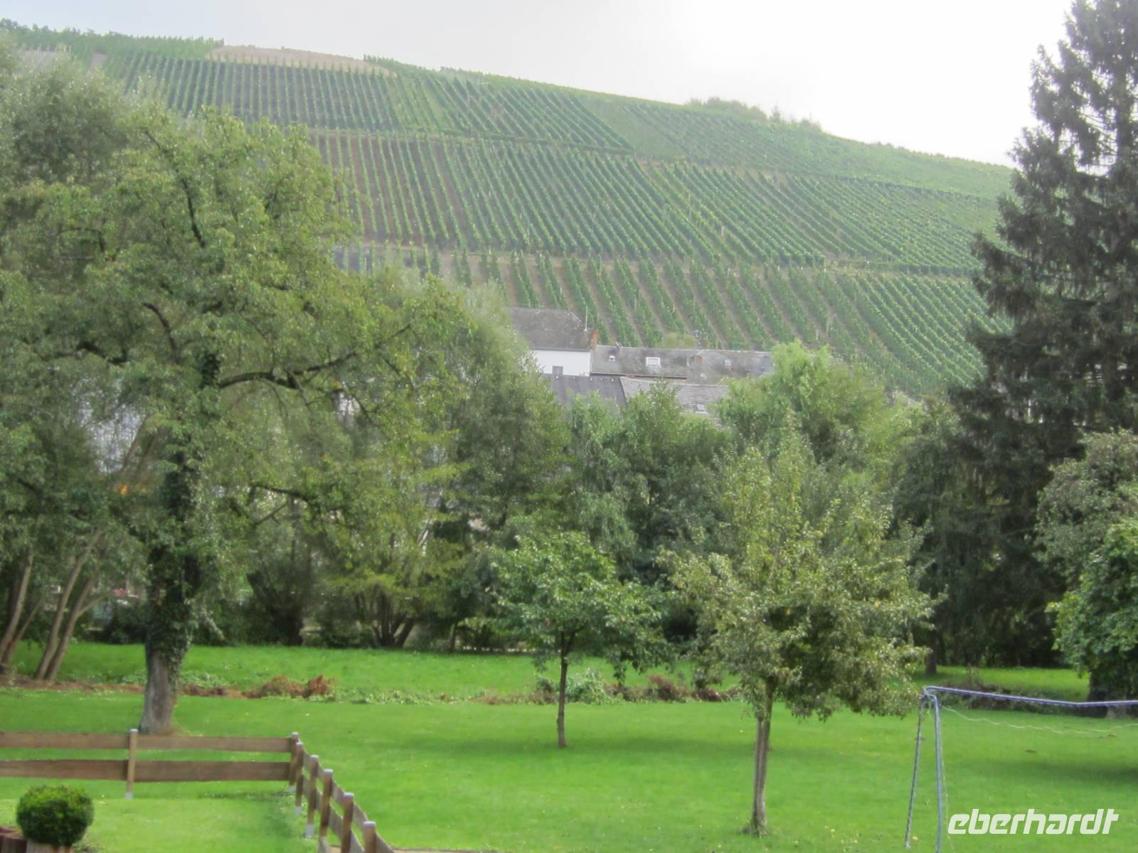 Heute wandern wir nach einem kräftigen Frühstück planmäßig weiter. Mit Anja haben wir uns in Neumagen-Dhron für eine Ganztageswanderung verabredet. Das Wetter spielt mit und wir steuern zuerst die Papiermühle an. Dazu geht es durch reizvolle Dhrontal, vorbei an grasenden Rindern, Schafen und Pferden, die uns neugierig und verwundert angucken, als seien wir die Attraktion des Tages. Die Papiermühle betrachten wir uns nur von weitem, denn es geht hinauf nach Dhrönchen, vorbei am Bach auf die Zummethöhe. Der Ausblick auf die Moselschleife von hier aus ist einfach betörend. Begeistert von dieser Aussicht auf Leiwen und Trittenheim treten wir unsere Mittagspause im Zummethof an. Danach spendiert Anja noch ein selbstgemachtes Baldrian-Schnäpschen, natürlich nur zur Verdauung, und nun geht es wieder hinab durch die Weinberge. Trittenheim weiß von seiner exponierten Lage und lockt, mit Strauß-Wirtschaft und zahlreichen Schänken zum Einkehren. Aber wir wandern aus dem Ort heraus, wieder mitten durch die Weinberge bis zum Jüdischen Friedhof, der von 1896-1938 genutzt wurde und wo heute nur noch 19 Grabstelen erhalten sind. Die Weinberge sind hier besonders schön und erinnern an die "Goldene Zeit" des Moselweins um 1900, als er Modewein war, äußerst beliebt und stark nachgefragt. Hier gedeihen am besten weiße Trauben für den beliebten Riesling, vereinzelt aber auch verlockende blaue.