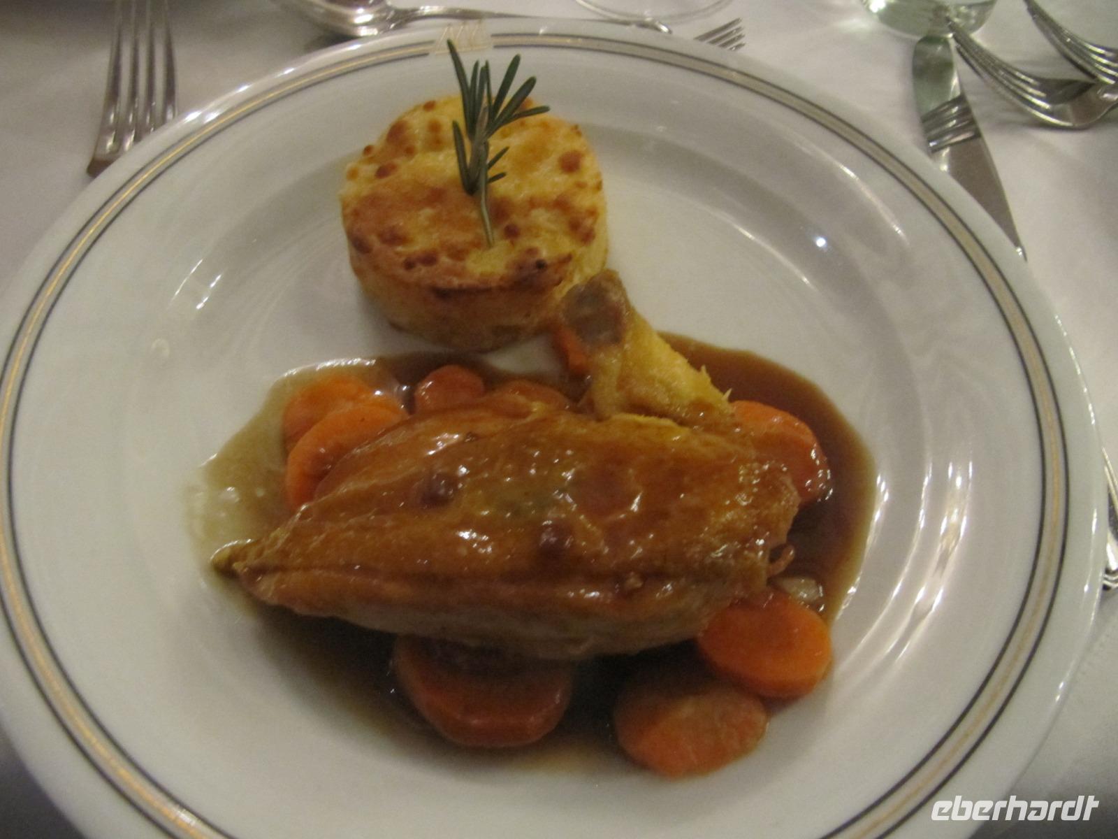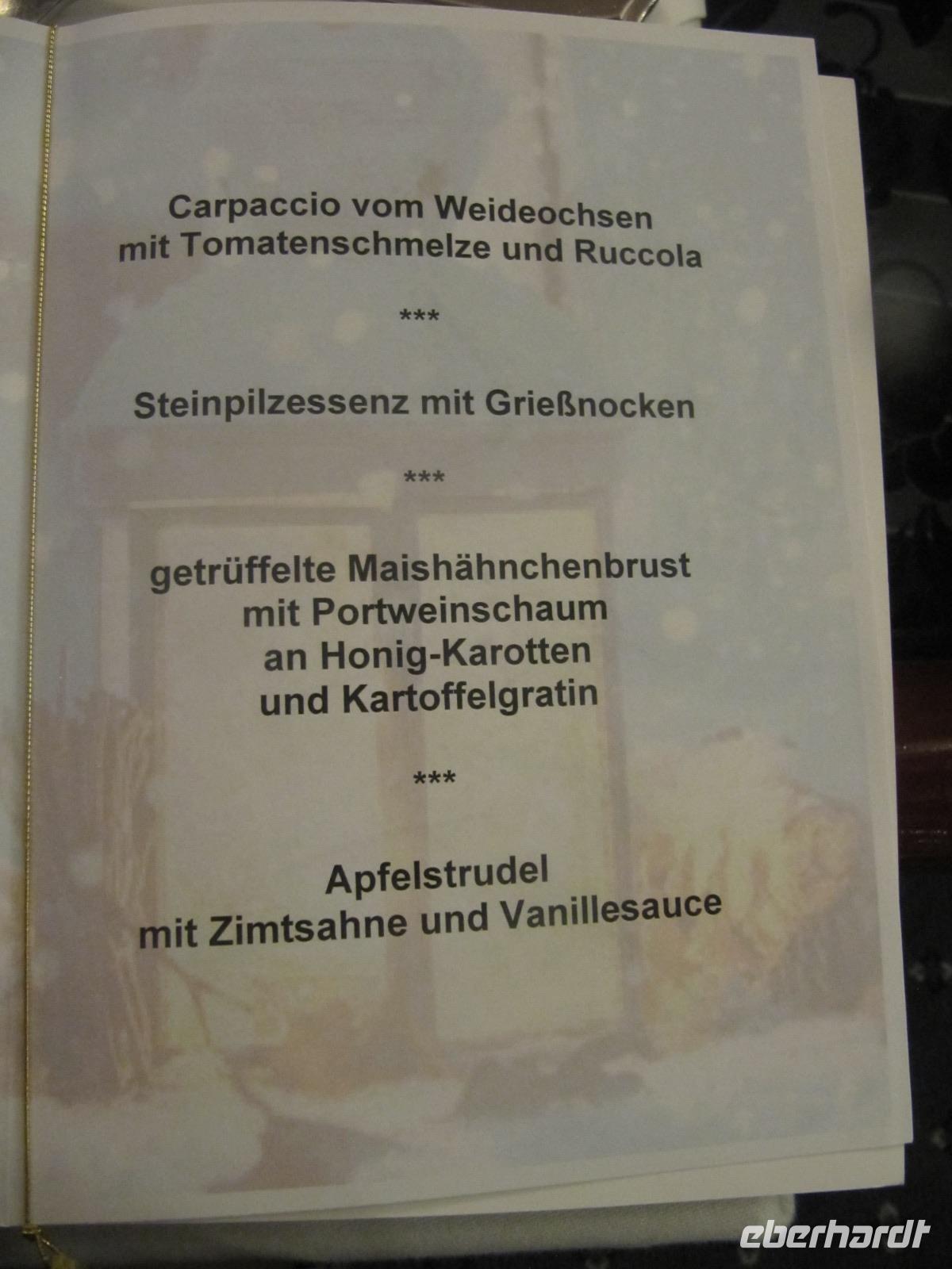 Schließlich nehmen wir unsere Plätze im Rôtisserie Restaurant ein, die ersten Kellner bringen uns bereits ein Glas Sekt zum Anstoßen und der Abend kann beginnen. Wir werden mit Ochsencarpaccio, Steinpilzessenz, Maispoularde und Apfelstrudel verwöhnt, verwickeln einander in interessante Gespräche und lassen so den Heiligen Abend stimmungsvoll ausklingen.