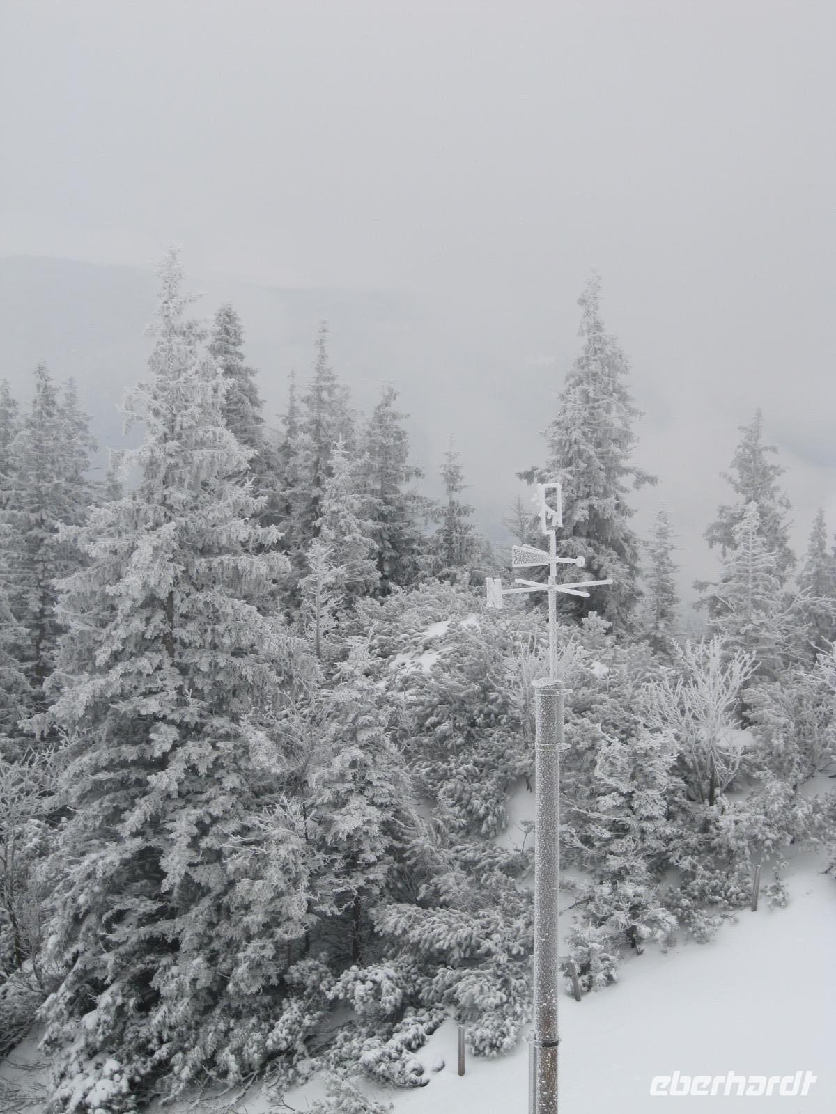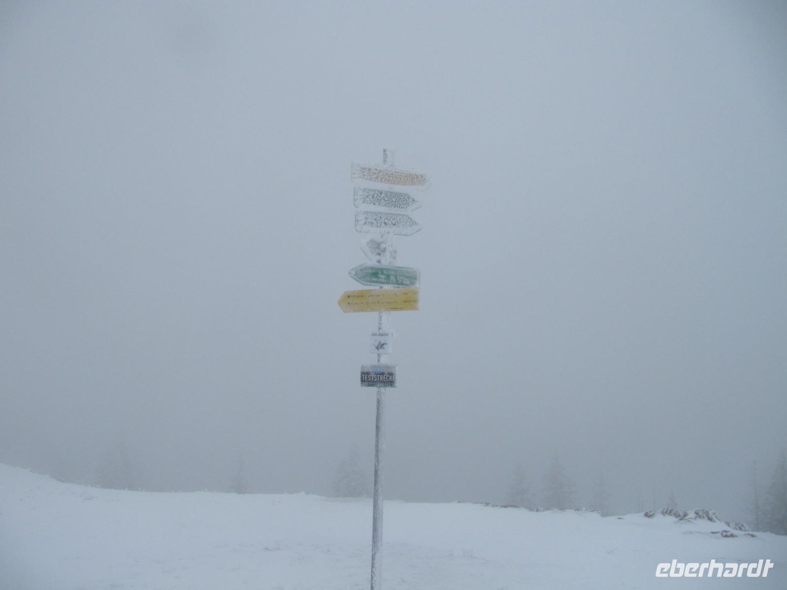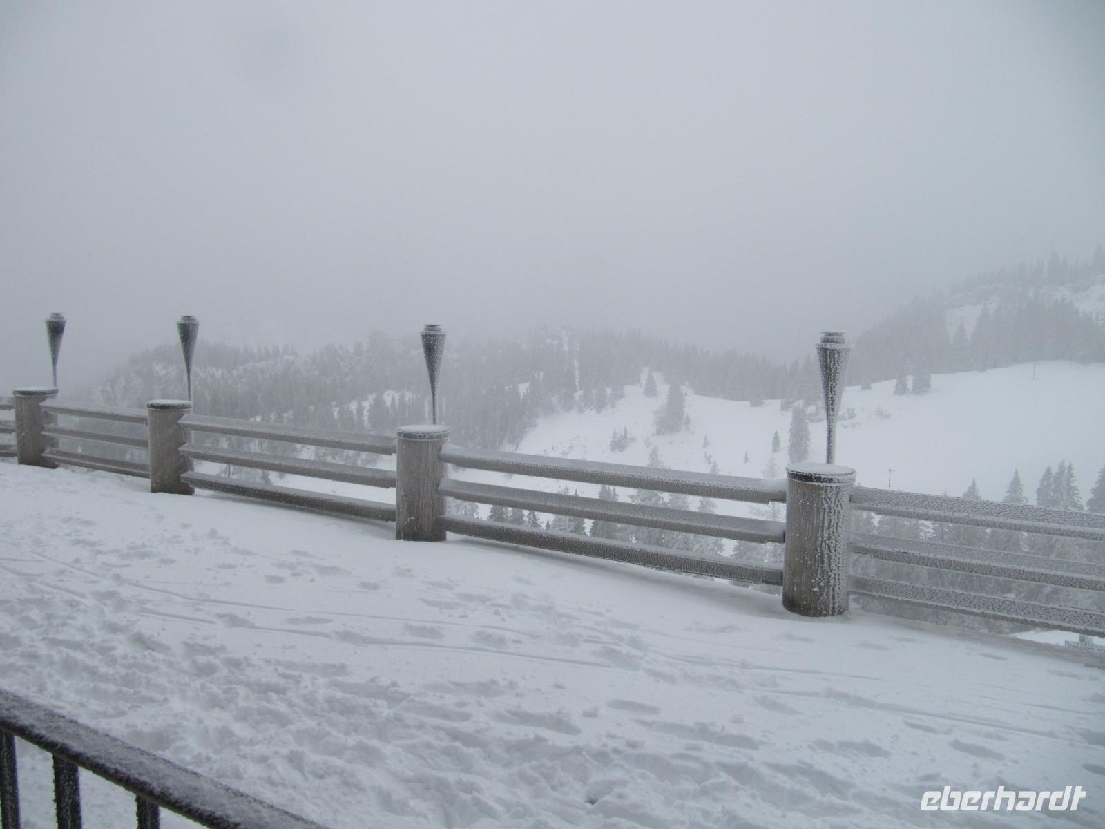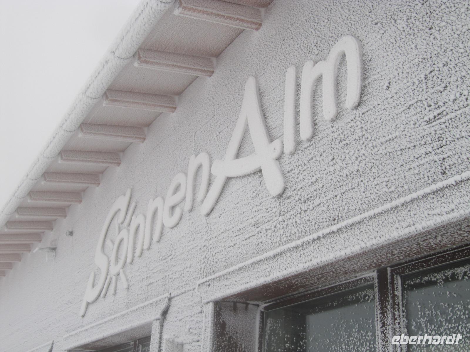 Unser Fahrer Werner bringt uns hinein ins Chiemgau, es ist kein Regen in Sicht und trotz den Wolken am Himmel stimmen uns die ersten schneebedeckten Berge, die wir in der Ferne entdecken können, zuversichtlich. Angekommen in Aschau bringt uns die Kampenwandbahn in die Höhe. In 14 Minuten überqueren wir fast 1000 Meter Höhe. Bald tauchen wir in die Wolken ein, die uns bereits von unten den Blick auf die Kampenwand verdeckt haben. Es fühlt sich an, als schweben wir durch ein weißes Meer, bis letztendlich die Bergstation in Sicht kommt. Oben angekommen ist das erste, was man merkt die bittere Kälte: An der Bergstation sind nur etwa -6°. Viel mehr gibt es auf den ersten Blick nicht zu entdecken: Der Gipfel ist in dicken Nebel getaucht und als die ersten Gäste sich auf den Weg zur Sonnenalm begeben, verschwinden auch Ihre Gestalten im weißen Nichts.