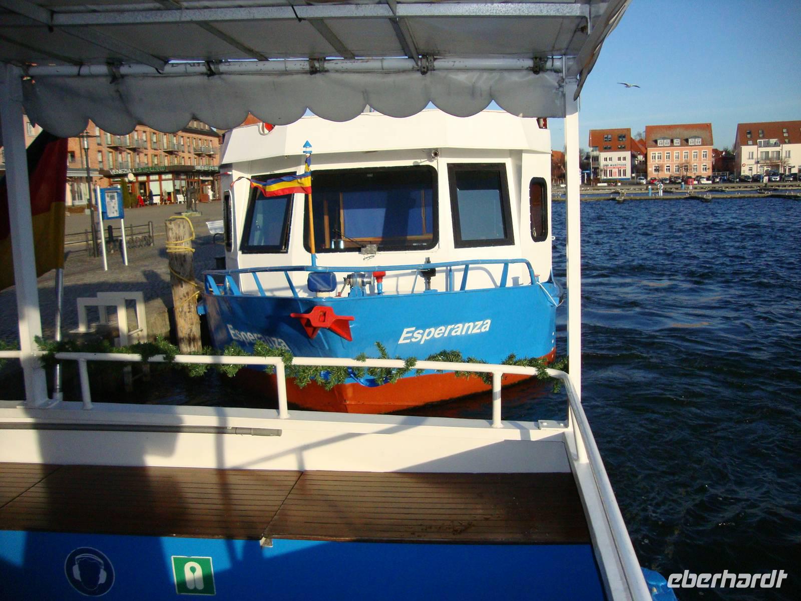 Mit mehreren Reisebussen, welche für Eberhardt-Travel und Gemeinsam Schöner Reisen am Flughafen in Dresden zum Jahreswechsel zu den verschiedensten Ferienzielen unterwegs waren, starteten auch wir mit unserem 4-Sterne Reisbus der Fa. Kreisel und unserem Chauffeur, Klaus Küchel, zum Jahresausklang an die Müritz. Das Wetter zeigte sich von der besten Seite und in Dessau nahmen wir unseren letzten Reiseteilnehmer an Bord. In flotter Fahrt ging es auf dem Berliner Ring bis zum Dreieck Wittstock und weiter Richtung Waren, wo wir 15.00 Uhr unser Ziel, das Hotel "AMSEE", gelegen am Tiefwarensee, erreichten. Sehr herzlich und nett wurden wir von der Managerin und den Mitarbeitern begrüßt. Nach dem Bezug der Zimmer trafen wir uns alle, auch die Gäste welche mit dem eigenen PKW angereist waren, in der Lobby des Hotels zur Begrüßung. Ich stellte in kurzen Worten das Programm vor und danach fuhren wir mit unserem Reisebus nochmals in die Nähe der Altstadt Warens. Herr Schulz, in der Uniform eines Nachtwächters, empfing unsere Reisegruppe am Busparkplatz. Nach der freundlichen Begrüßung machten wir uns auf den Weg, die schöne Altstadt zu entdecken. Vorbei am "Müritzeum", von dem Morgen noch die Rede sein wird, liefen wir durch die Richterstrasse, am Haus des Scharfrichters entlang, bis zum Stadthafen. Hier trifft man sich, um Neuigkeiten austauschen oder nach den Schiffen zu schauen, welche festgemacht haben. Weiter führte uns der Weg bis zum Marktplatz,mit dem schön sanierten Rathaus. Die Dämmerung setzte ein und geschäftiges Treiben war überall zu spüren. Durch die Fußgängerzone, vorbei am Fischtor, spazierten wir bis zum Cafe' "Müritz", wo uns ein wohlschmeckender Glühwein serviert wurde. Nach dem Aufenthalt im gemütlichen Cafe' fuhren wir mit unserem Reisebus zurück in unser Hotel "AMSEE", wo wir das erste Mal vom vorzüglichem und sehr attraktiv angerichtetem Büffet zu Abend essen konnten.