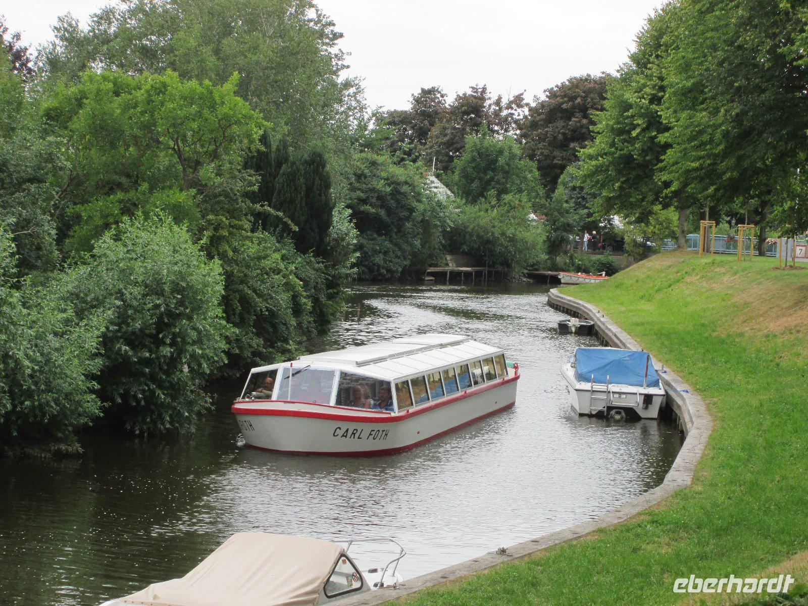 "Klein Amsterdam" oder "Klein Venedig" wird die zwischen Eider und Treene liegende und von Friedrich III. gegründete Stadt wegen der vielen Sielzüge und Grachten gern bezeichnet. Das somit eine Grachtenrundfahrt nicht fehlen darf, ist verständlich. Auf einer 1stündigen Bootstour ging es auf "Stadtrundfahrt", vorbei an Kirchen, Museen und dem Marktplatz mit den schönen Treppengiebelhäusern und den typischen Hausmarken.