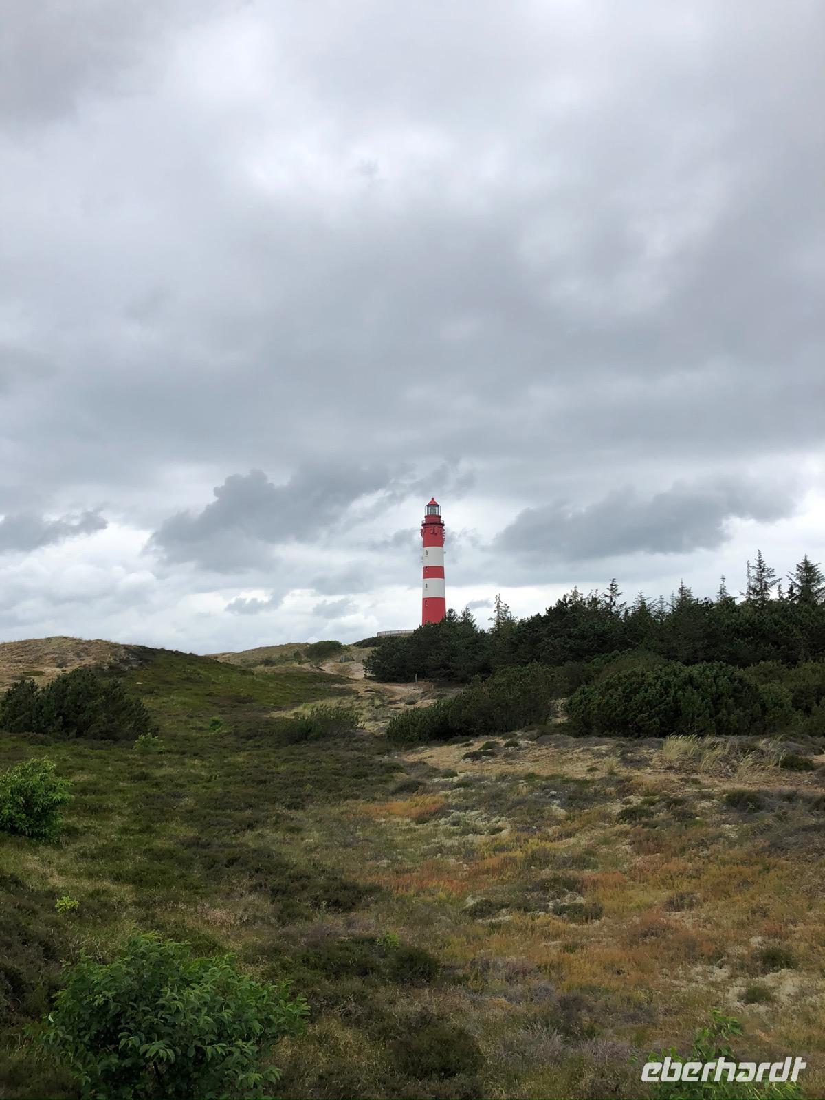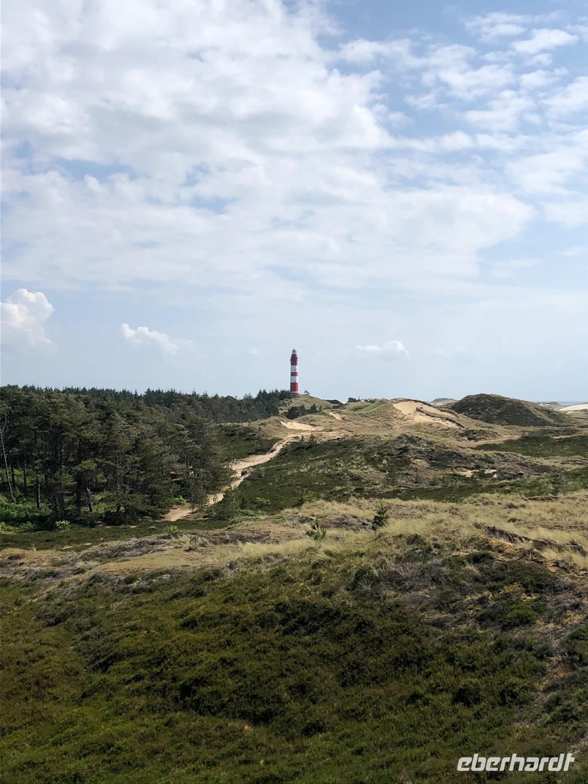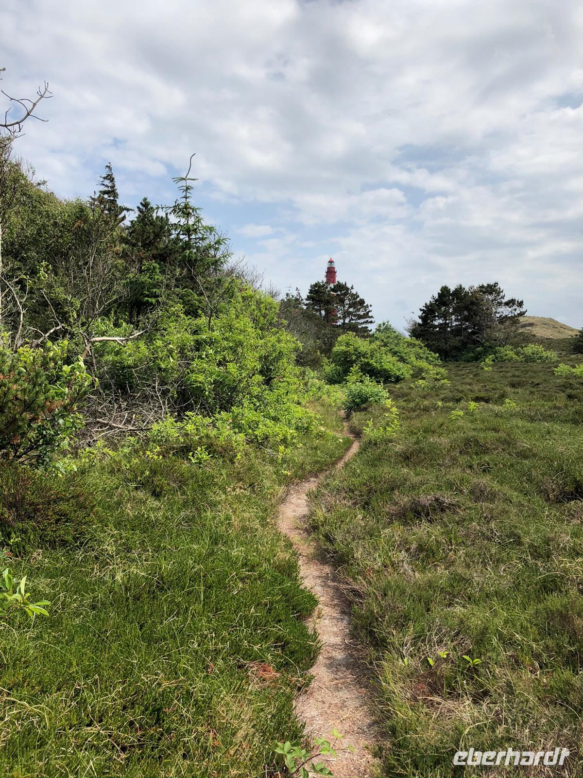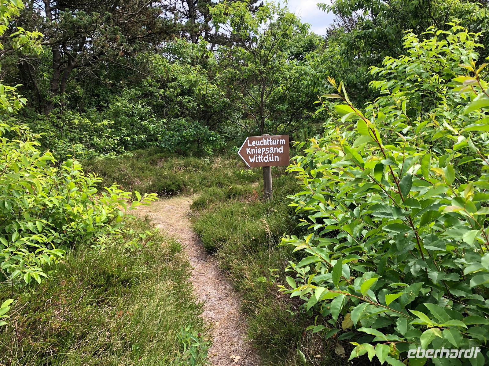 So schlugen wir den Bohlenweg in die Dünen ein. Den Leuchtturm von Amrum klar im Blick sollten wir nun laut Hinweisschild links lang laufen. Unsere Wetterfee war glücklicherweise auch daueronline mit Wanderkarte vernetzt zur Stelle und bestätigte das Schild. Am Ende des ausgeschilderten, wild verwachsenen Weges allerdings konnten wir alle herzhaft lachen, sind wir doch wieder auf unserem anfänglichen Waldweg herausgekommen. Aber da ja bekanntlich alle Wege nach Rom führen, haben wir das weggelächelt und dann auch entschieden, den Leuchtturm rechts liegen zu lassen, um noch den traumhaften Strand von Amrum zu erreichen im doch sehr knappen Zeitfenster einer Tagestour.