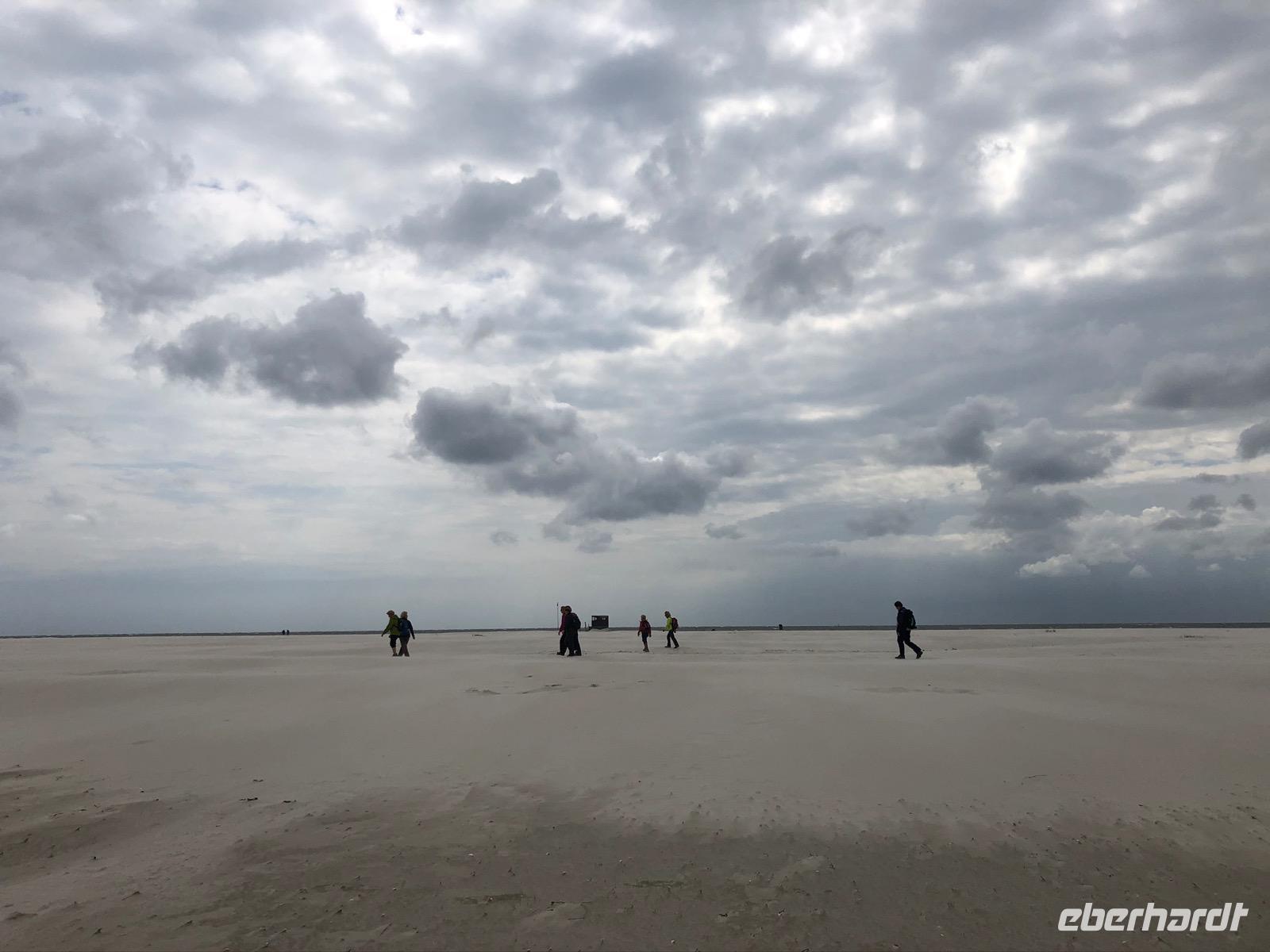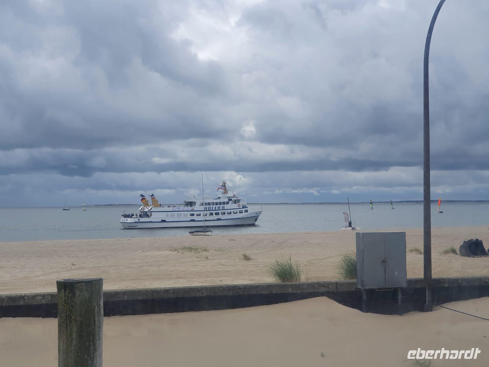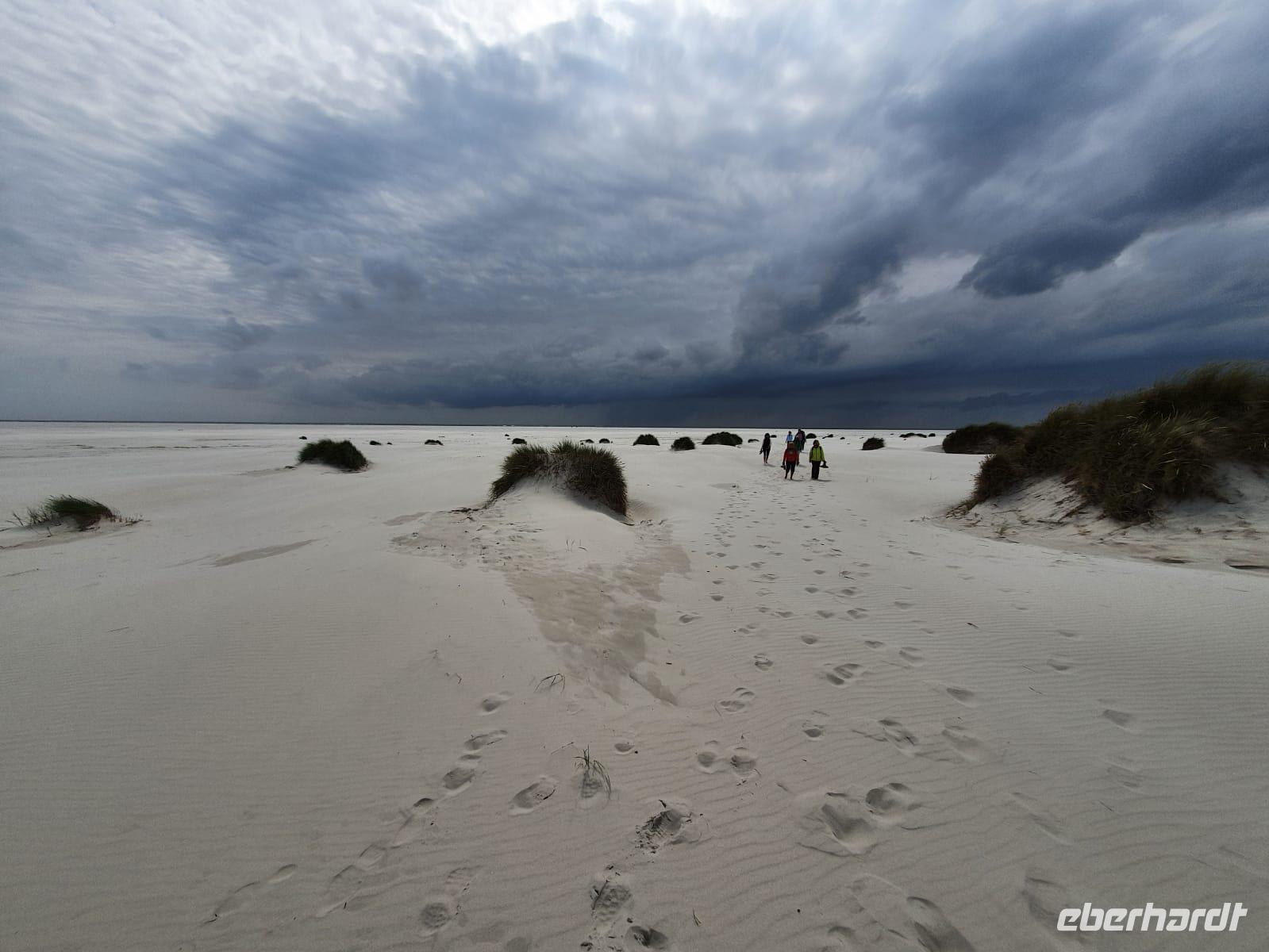 Unsere Gruppe verteilte sich beim Marsch über den Strand und ich denke, jeder hat es für sich aufgesogen. Unfassbar schöne Fotos wurden gemacht und mit den vom Wind getriebenen Regenwolken im Rücken sind wir Wittdün näher gekommen. Und ungefähr an dieser Stelle, bei Ortseingang Wittdün, erlebte unsere Wetterfee auch ihre Freisprechung: pünktlich gegen 17 Uhr sagte sie uns Regen voraus und genau so kam es. Der Himmel regengrau, goss es für ein paar Minuten ganz intensiv und wir flüchteten verabredet in den Ort, um uns 15 Minuten vor Abfahrt des Schiffes im Hafen wieder zu treffen. Bemüht, all meine Gäste hoffentlich zusammen in die richtige Richtung gelotst zu haben, bildete ich wohl die Nachhut auf dem Weg vom Strand in den Ort. Doch spätestens dort dann angekommen, konnten wir feststellen, dass aus uns schon die gute Truppe geworden ist, denn irgendwie fanden wir uns alle am hiesigen Eisstand wieder.Nordseeluft macht hungrig und müde. An Tag 1 war das schon zu erkennen, aber noch nicht so stark zu fühlen.
