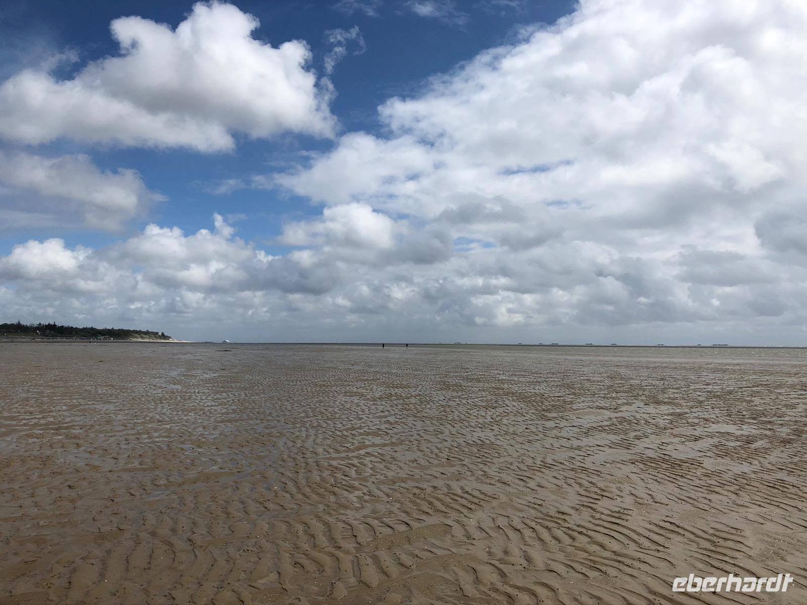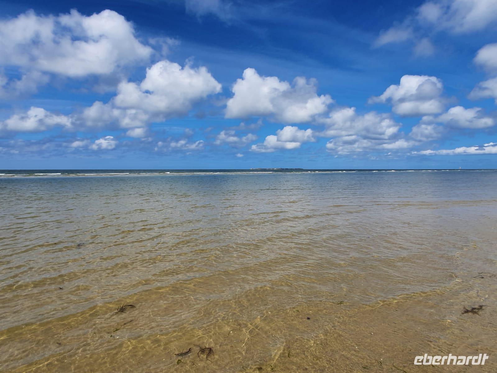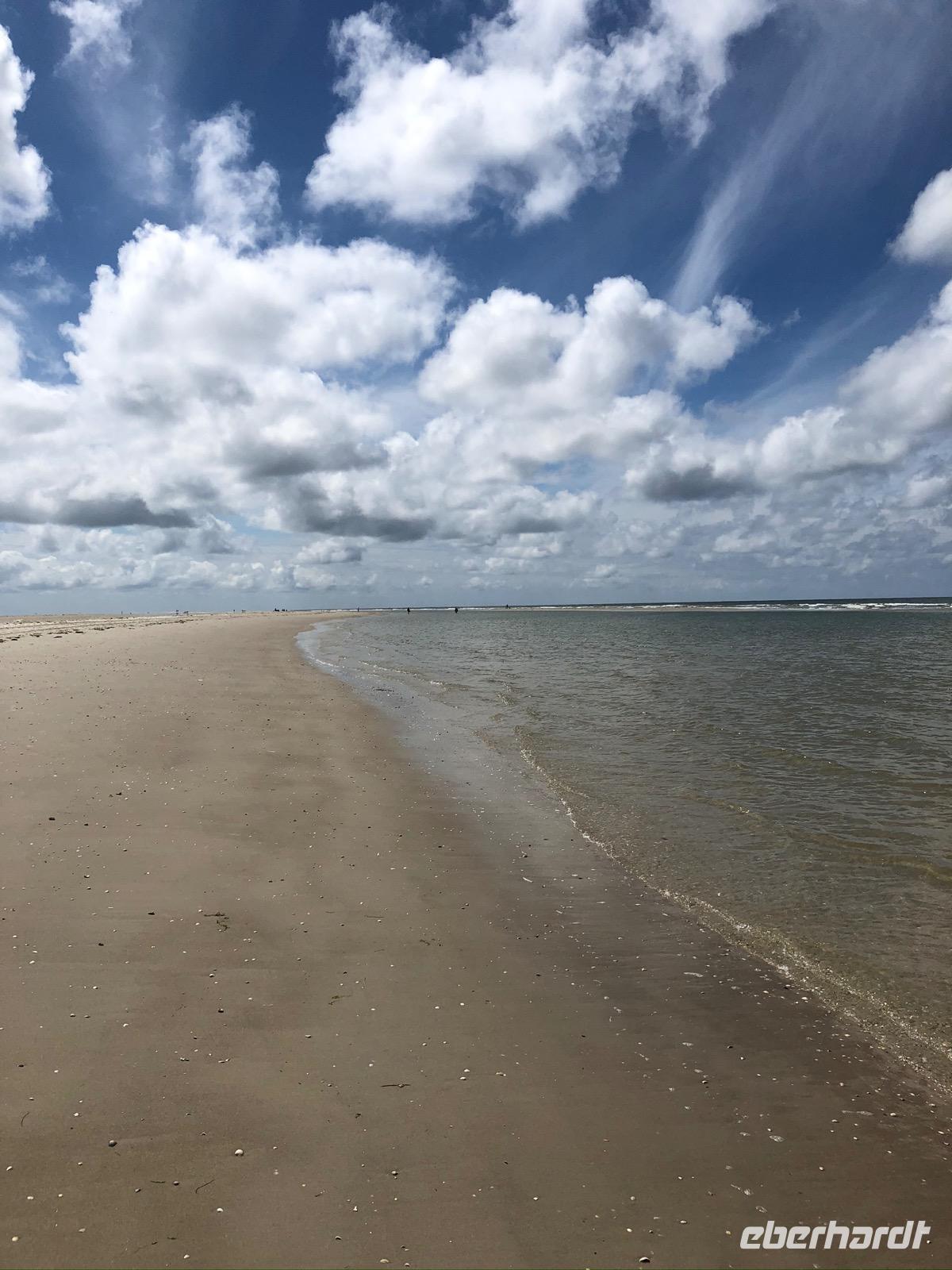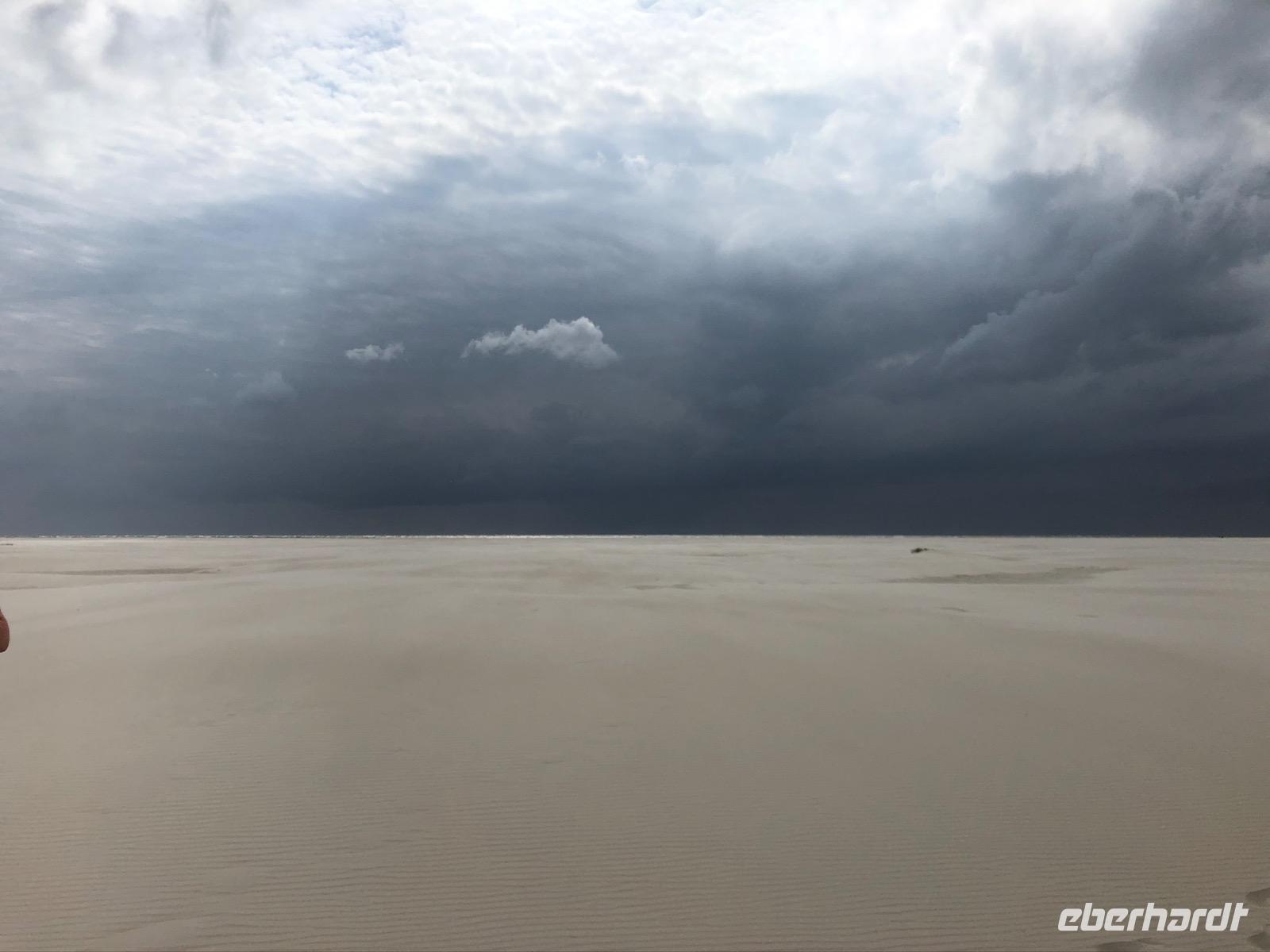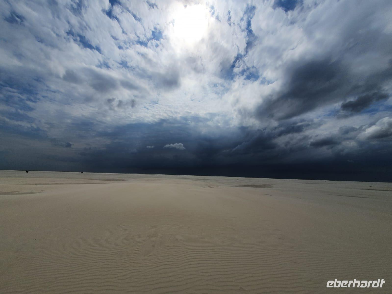Der Kniepsand ist eine Besonderheit der Insel. Es handelt sich dabei um eine sehr langsam wandernde Sandbank, von daher eigentlich der Insel nicht zugehörig. Jedoch ist diese der Insel vorgelagerte Sandbank auf West für deren Sicherheit im Wind- und Gezeitenablauf enorm wichtig. So liegt Amrum bereits seit Jahrhunderten stabil ohne nennenswerte Verwerfungen an der dem Meer zugewandten Westseite. Und auch optisch ist diese Sandbank ein Nordseetraum. Montag mit bedrohlichen Regenwolken ebenso fantastisch wie nun heute fast wolkenfrei unter blauem Himmel.