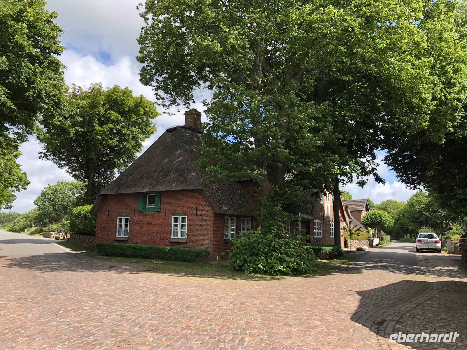 Nieblum gilt als der schönste Ort auf Föhr, wobei wir, denke ich, gefühlt fast jeden Ort jenseits von Wyk auf unserer Busreise entzückend in Architektur und friesischem Ambiente empfunden haben.Nur ein paar Minuten in Nieblum winkte bereits unsere Fischbrötchenbeauftragte mit eben diesem in der Hand. Ich denke, dass wir fast alle nacheinander in dem kleinen reetgedeckten Friesenhäuschen mit den blau-weiss-verzierten Fliesen im Ladenraum Fischbrötchen erworben haben. Und sie schmeckten so frisch und authentisch wie der ganze Ort wirkte.