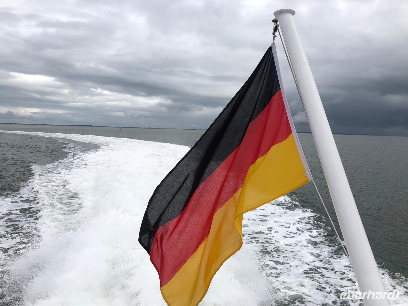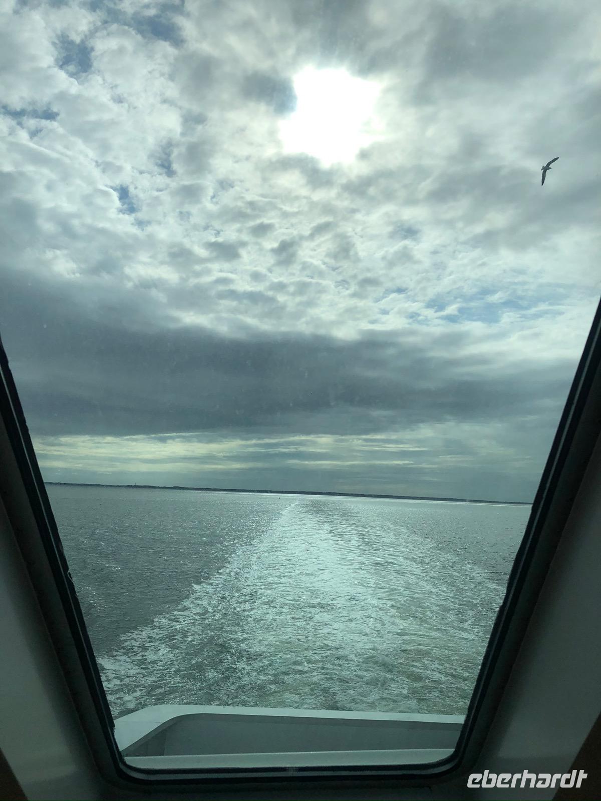 Die Fahrt ging nach Amrum zum Umstieg auf ein Schnellboot in Richtung Hörnum auf Sylt. Und als meine Gäste offensichtlich trotz Nieselregen und tief hängenden Wolken ebenso freudig grienend achternaus die kraftvoll schnelle Fahrt auf Deck geniessen konnten wie ich, war ich sehr beruhigt. Wir standen also fast so begeistert wie ein kleiner Junge neben uns und sahen im Fahrtwind Sylt entgegen.