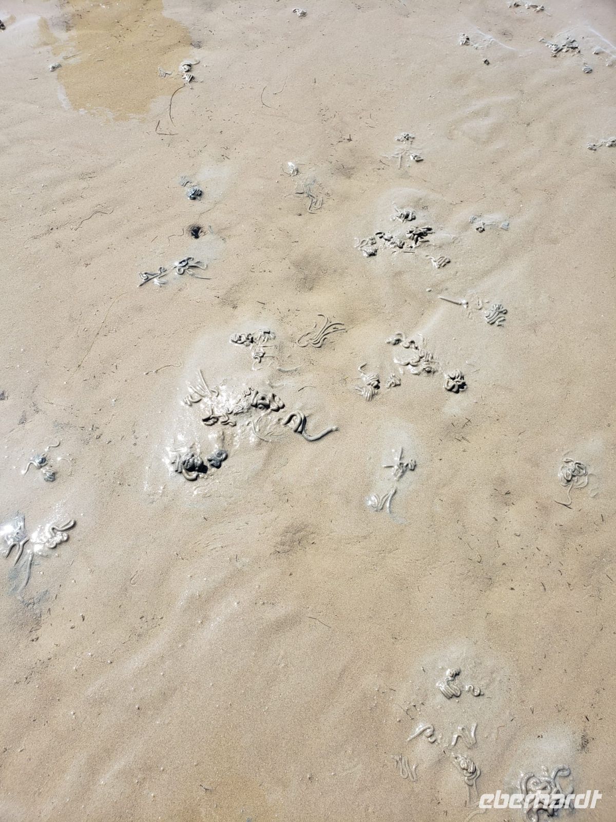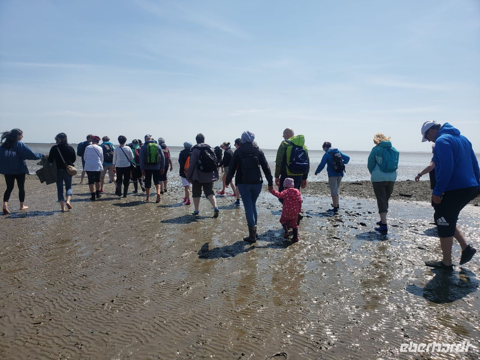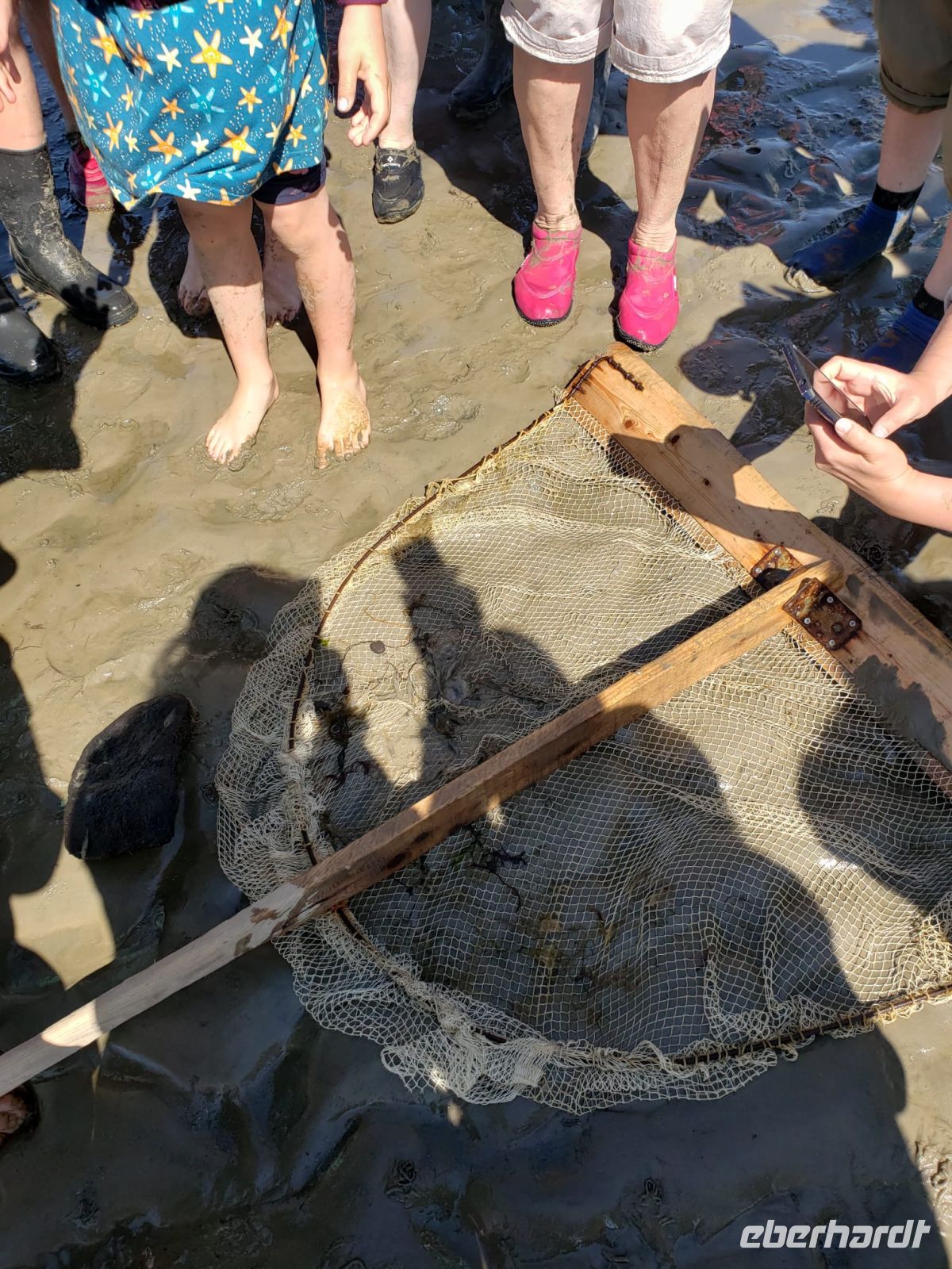 Am Nachmittag sind wir alle aufgeregt. Wir machen eine Wattwanderung, die darf hier an der Nordsee natürlich nicht fehlen. Unser Wattführer gibt sich viel Mühe, erzählt viel Wissenswertes, auch die Kinder in der Gruppe hören bis zum Schluss gebannt zu. Wir sehen den Wattwurm und verschiedene Muschelarten. Am Ende wird uns das Krabbenfischen demonstriert und dann müssen wir uns auf den Rückweg machen ... die Flut ist im Anmarsch!