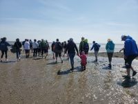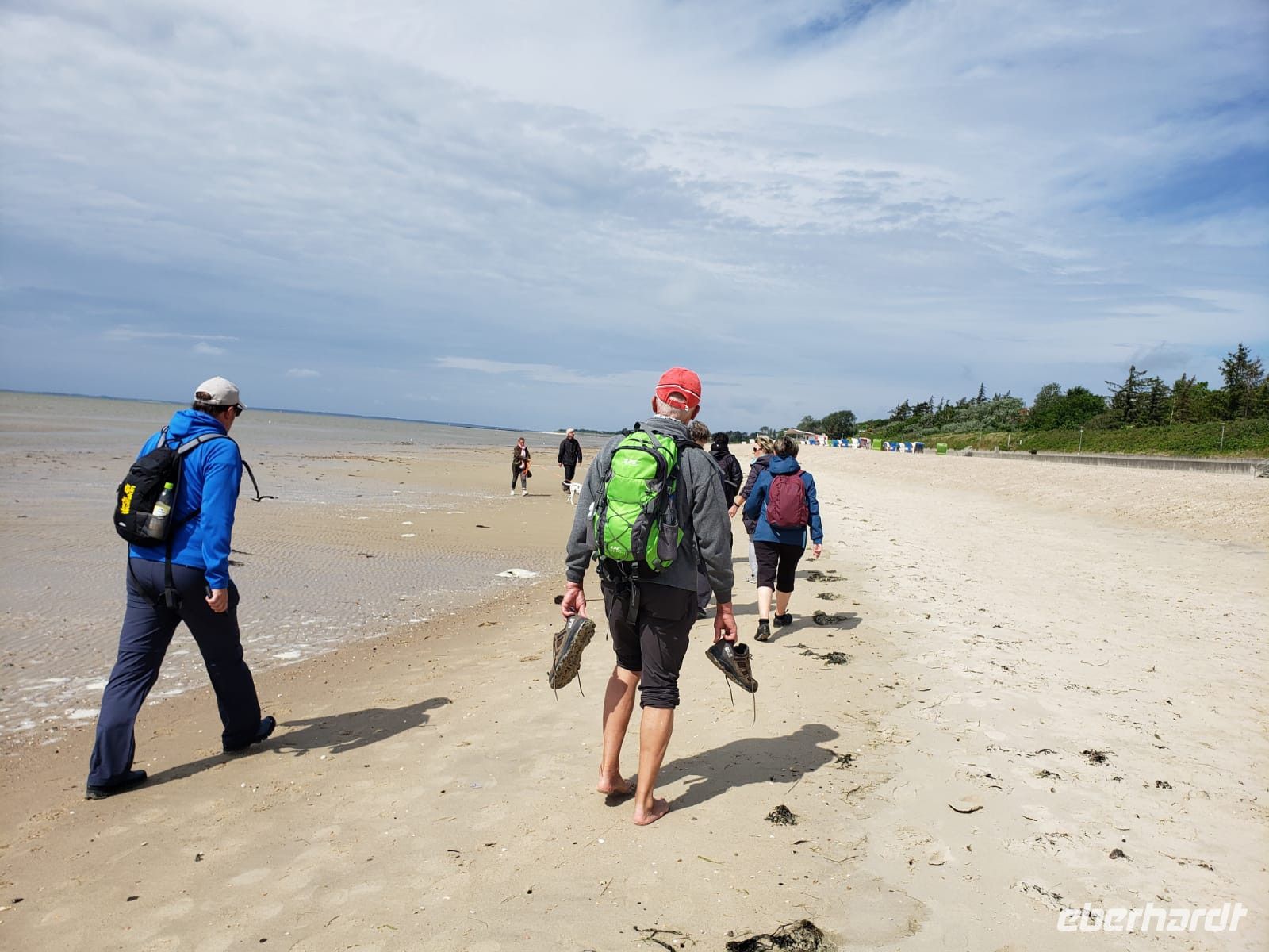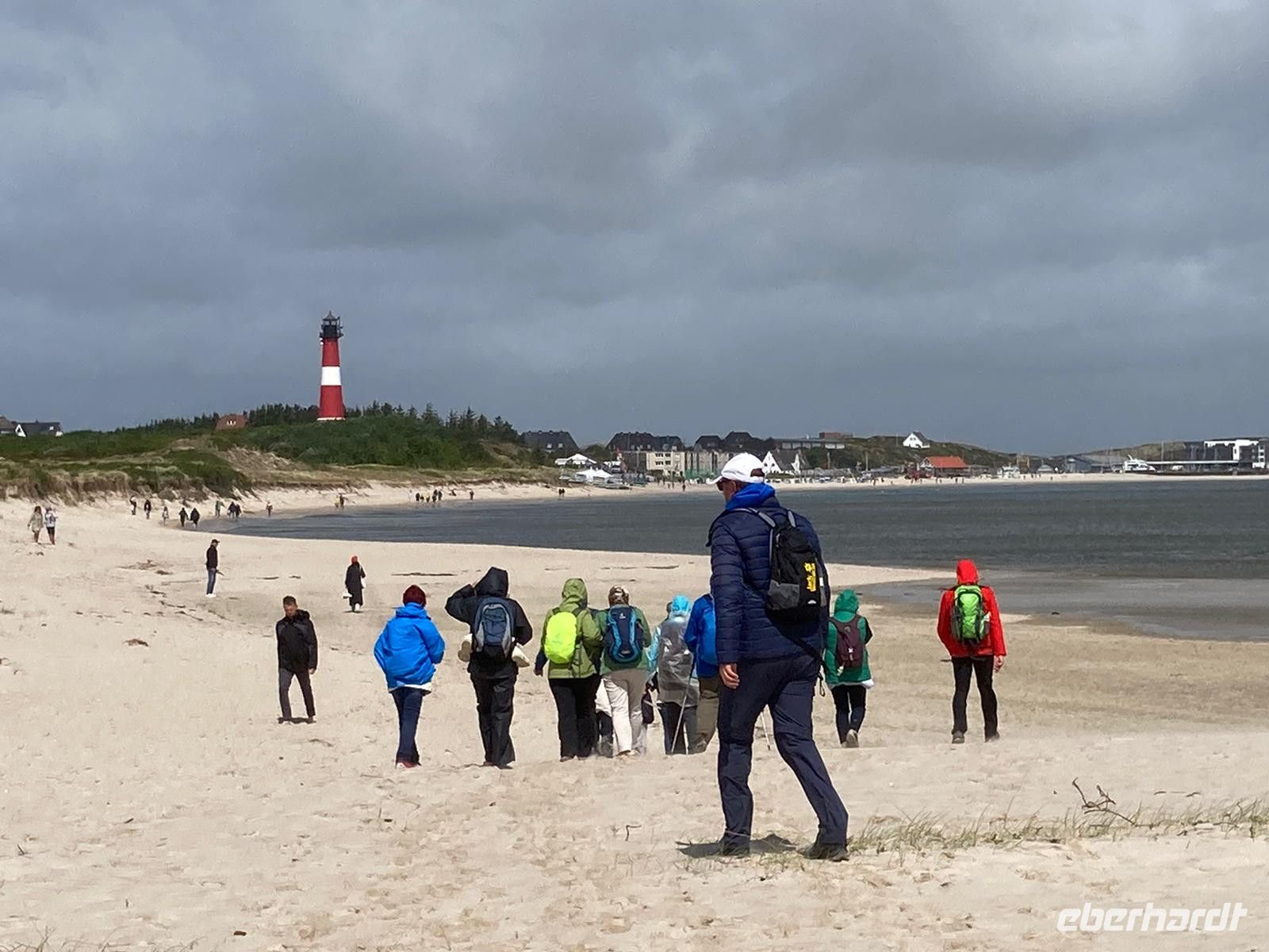Heute nehmen wir die Fähre Richtung Föhr. Zunächst geht es ein Stück durch Wyk auf Föhr, wir sehen den Glockenturm und das Quermarkenfeuer Olhörn. Einige ziehen ihre Wanderschuhe aus, um den Sand zu spüren, als wir anschließend eine ganze Weile den Strand entlang wandern.