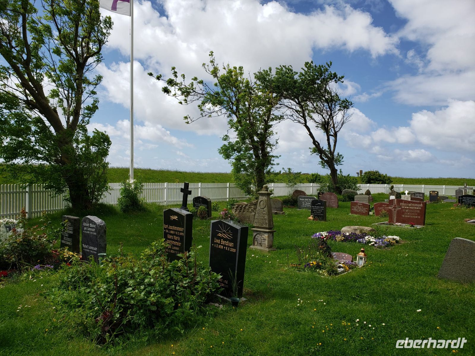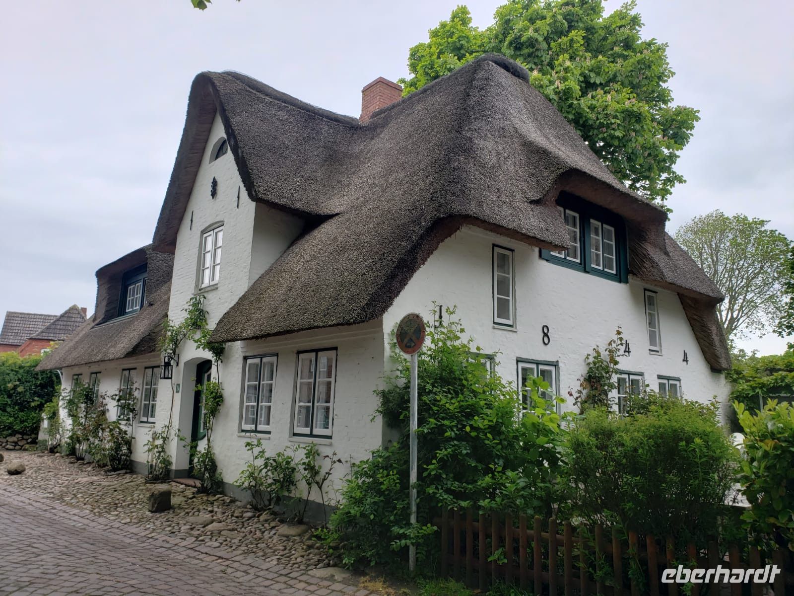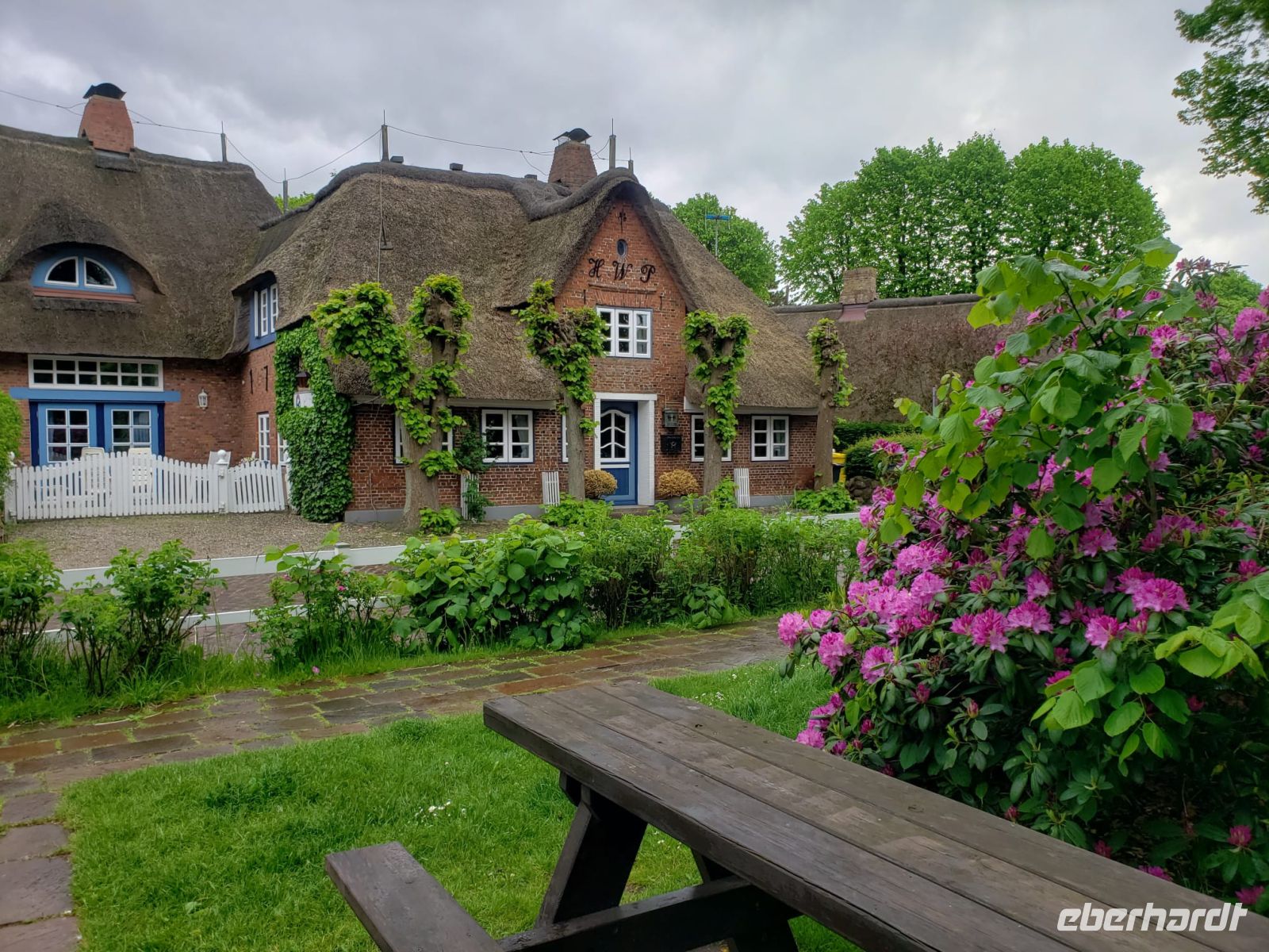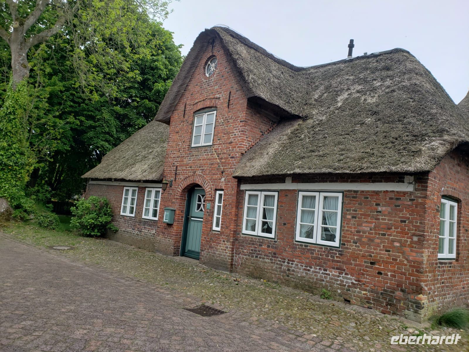 Über einen Bohlenweg geht es dann nach Nieblum, ein wunderschönes altes Dorf, so schön, dass es schon mehrere Auszeichnungen erhalten hat. Viele hübsche Kapitänshäuser kann man bewundern. In der Mittagspause nutzen viele die Gelegenheit, am Friesendom, der größten Kirche der Insel, die sprechenden Grabsteine zu sehen, die gibt es nur hier in Nordfriesland.