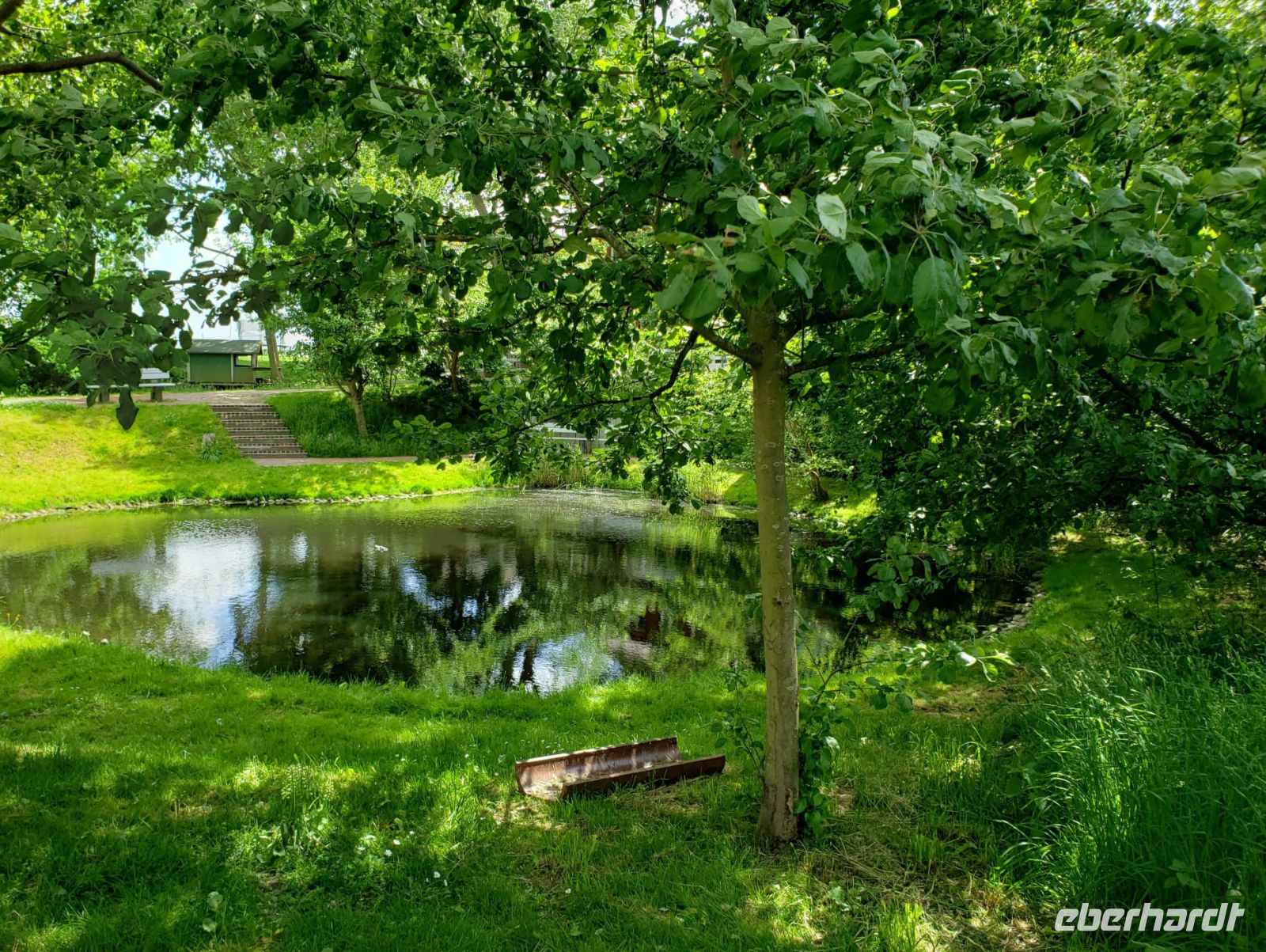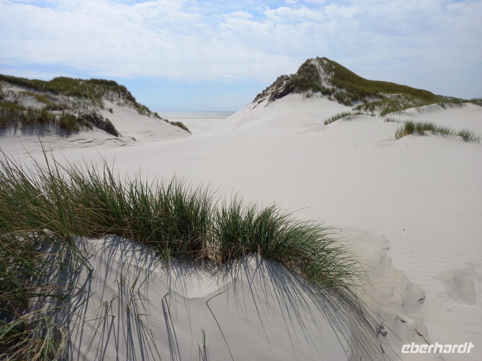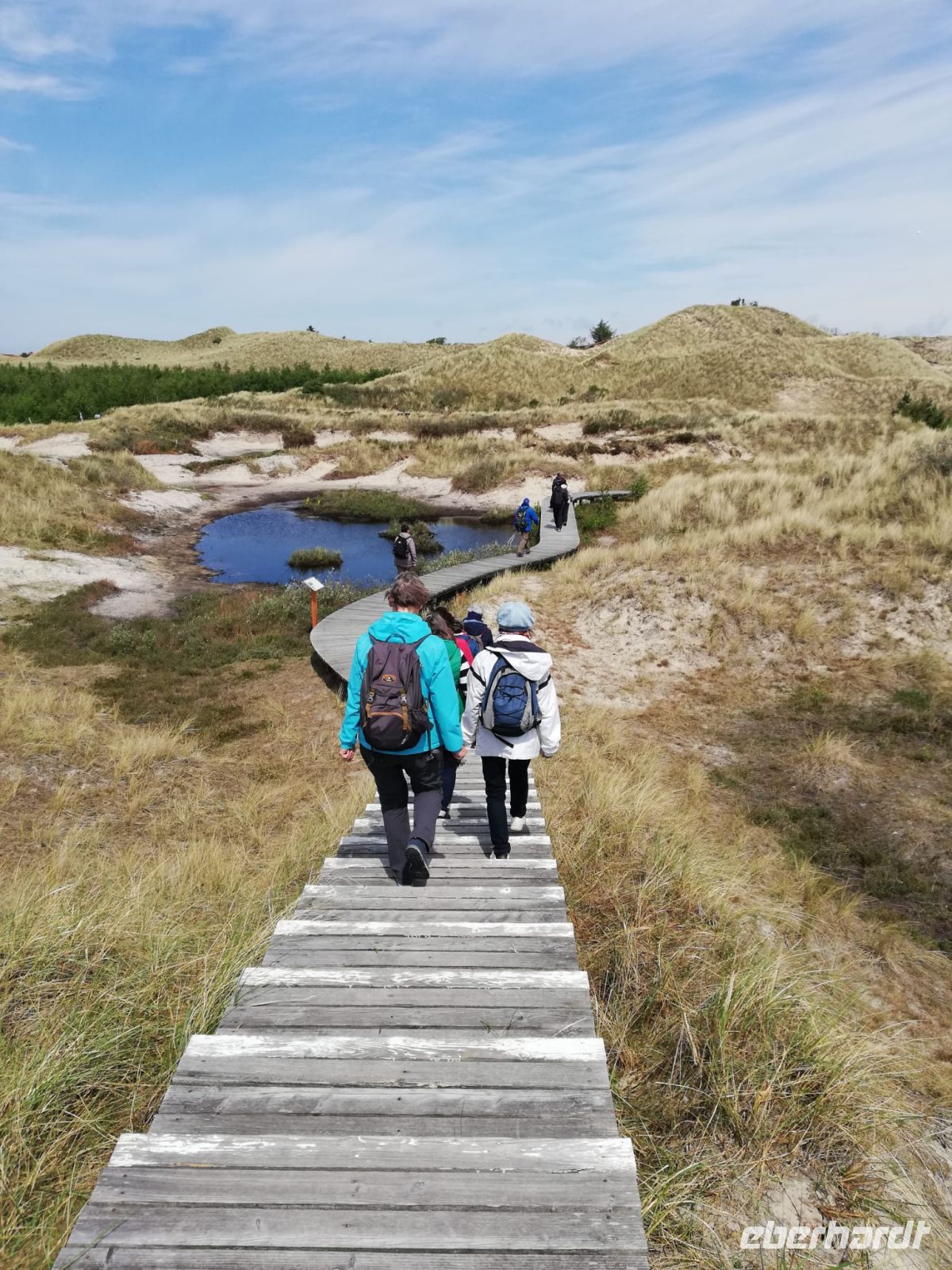 Und dann wandern wir los. Nachdem wir einen Bohlenweg gegangen sind und auf eine Aussichtsdüne gestiegen sind, kommen wir am Wriakhörnsee vorbei, wunderschön und ruhig ist es hier. Eigentlich ein perfekter Pausenplatz. Da aber die Sonne so toll scheint, gehen wir noch ein Stück weiter. Mitten in weißen Dünen mit Blick auf den berühmten Kniepsand, dem kilometerbreiten Strand von Amrum, setzen wir uns und genießen diesen ganz besonderen Pausenplatz.
