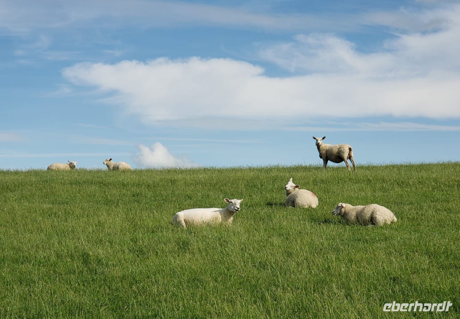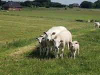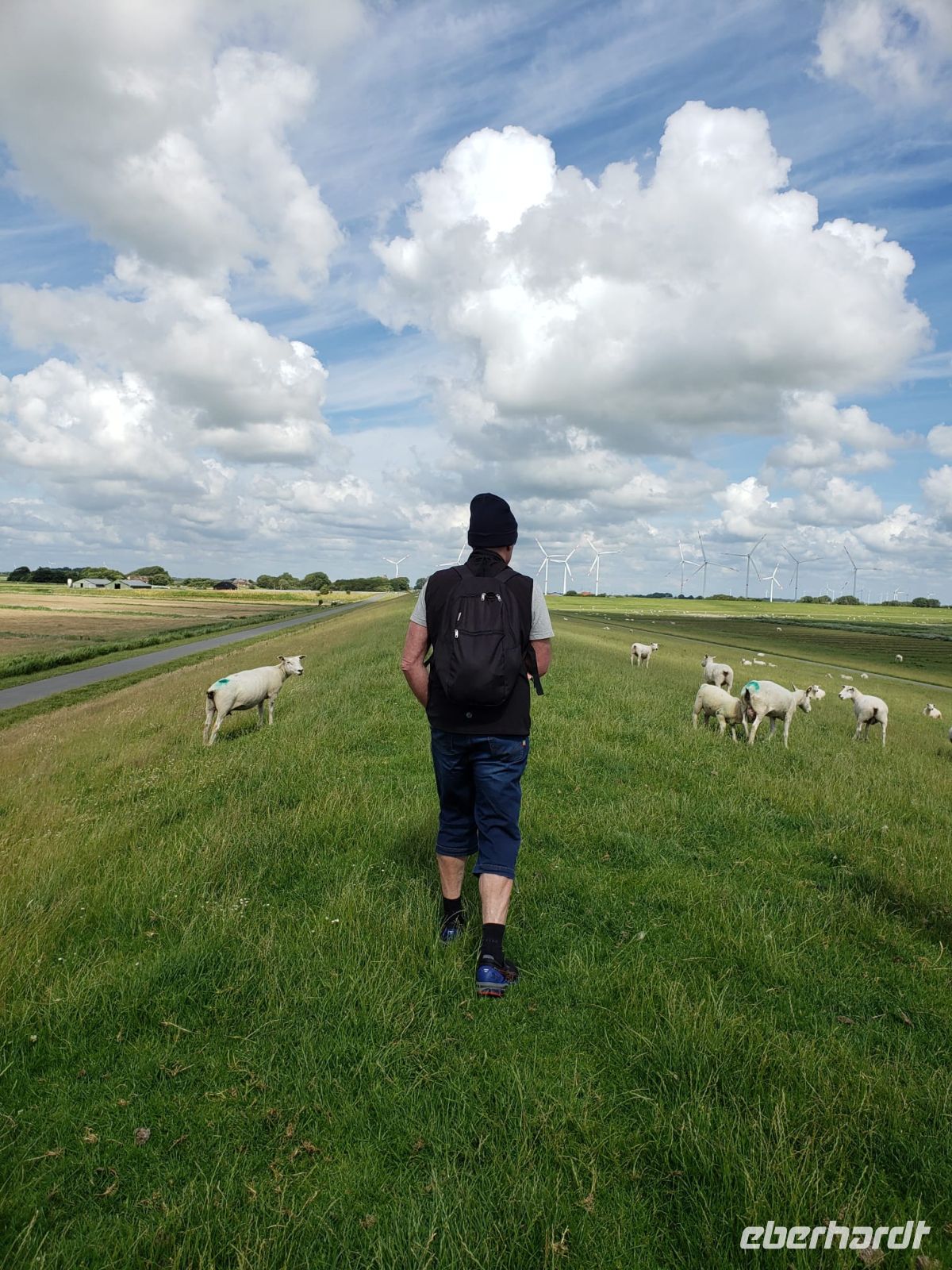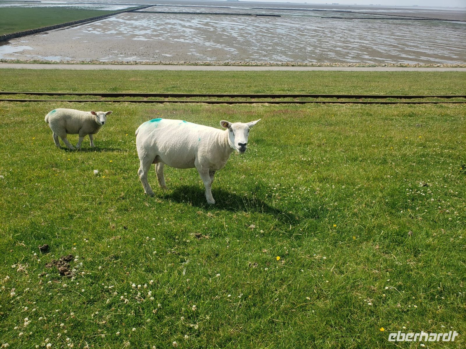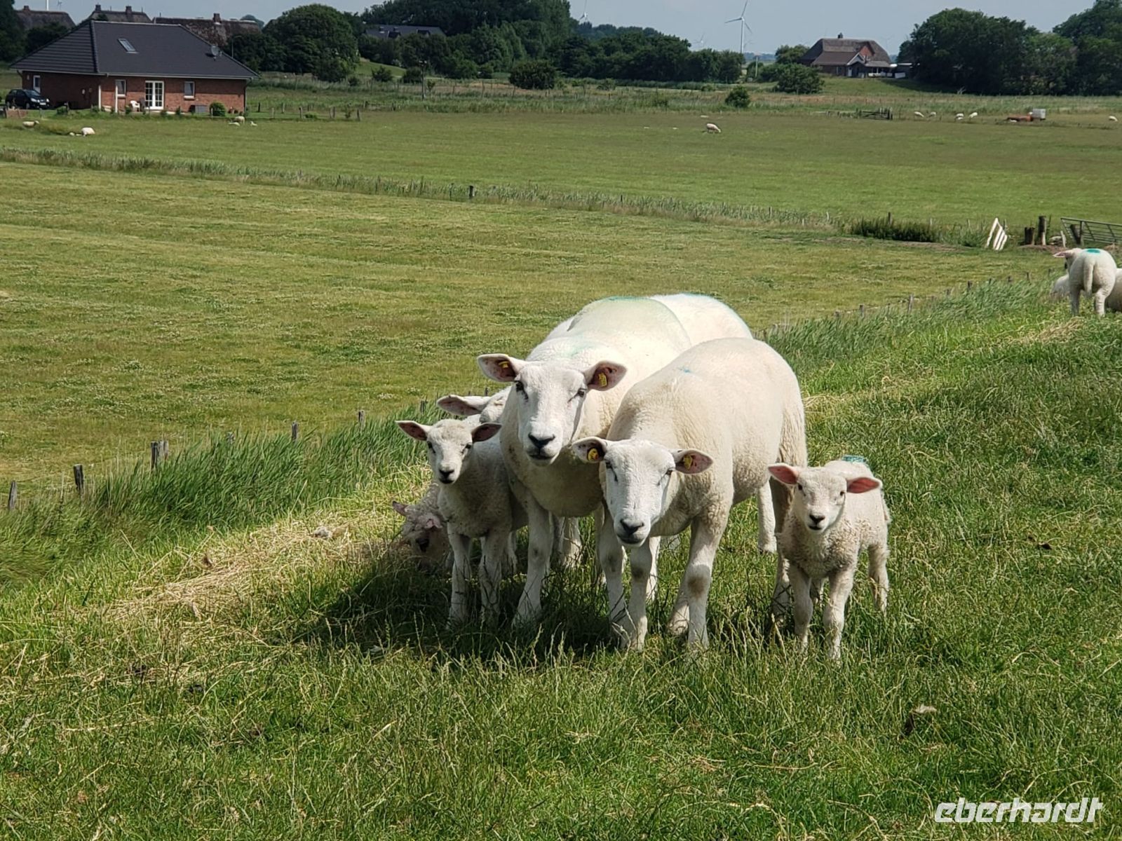 Am Nachmittag geht es über den Deichwanderweg. Wir sehen den kleinen Leuchtturm und die Kirche von Dagebüll. Wir laufen dabei durch viele Schafherden mitten hindurch!