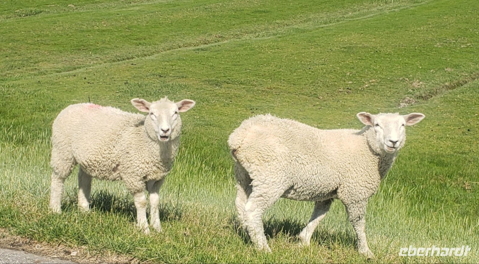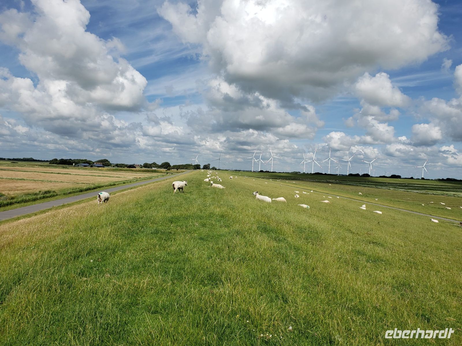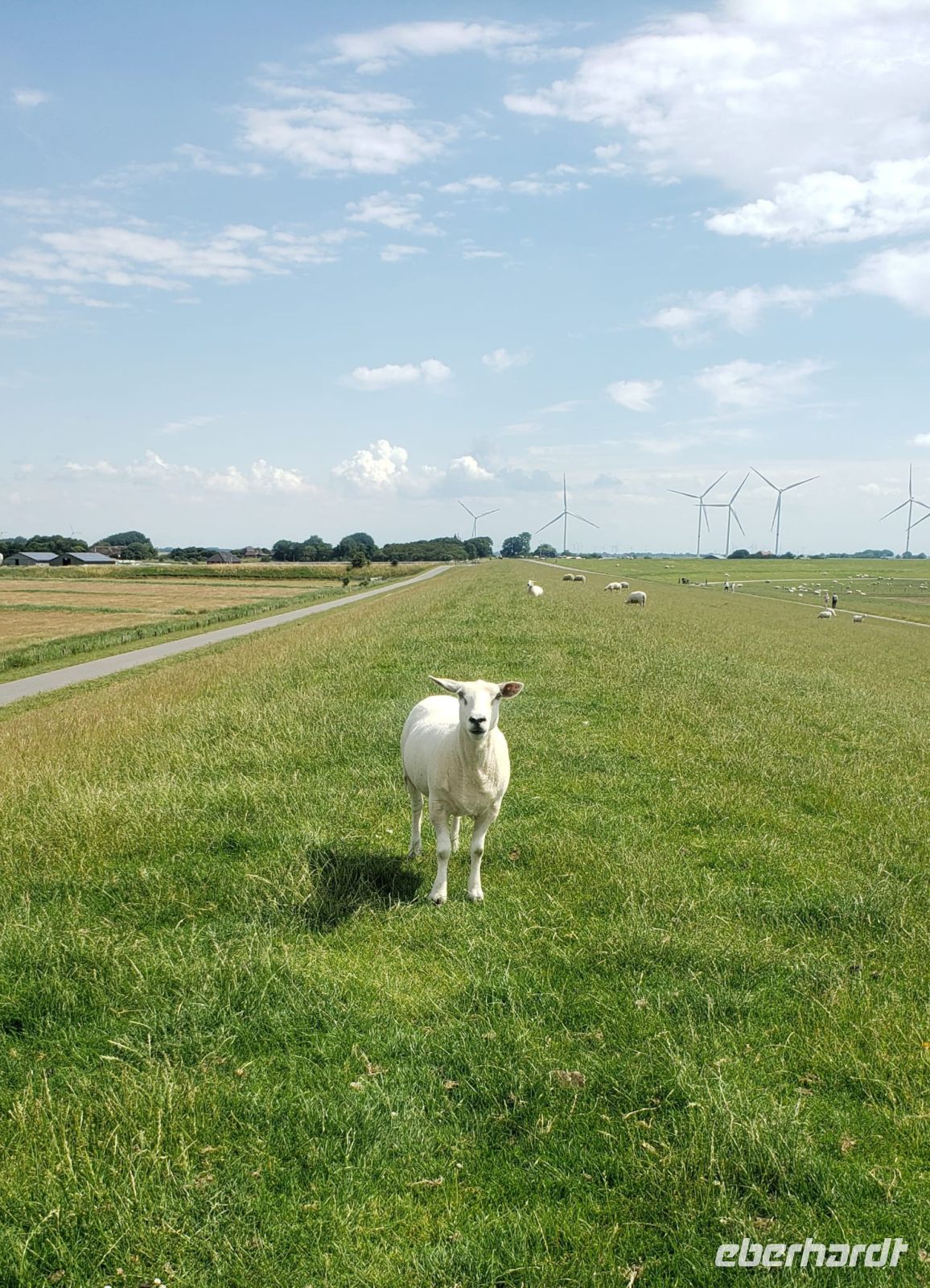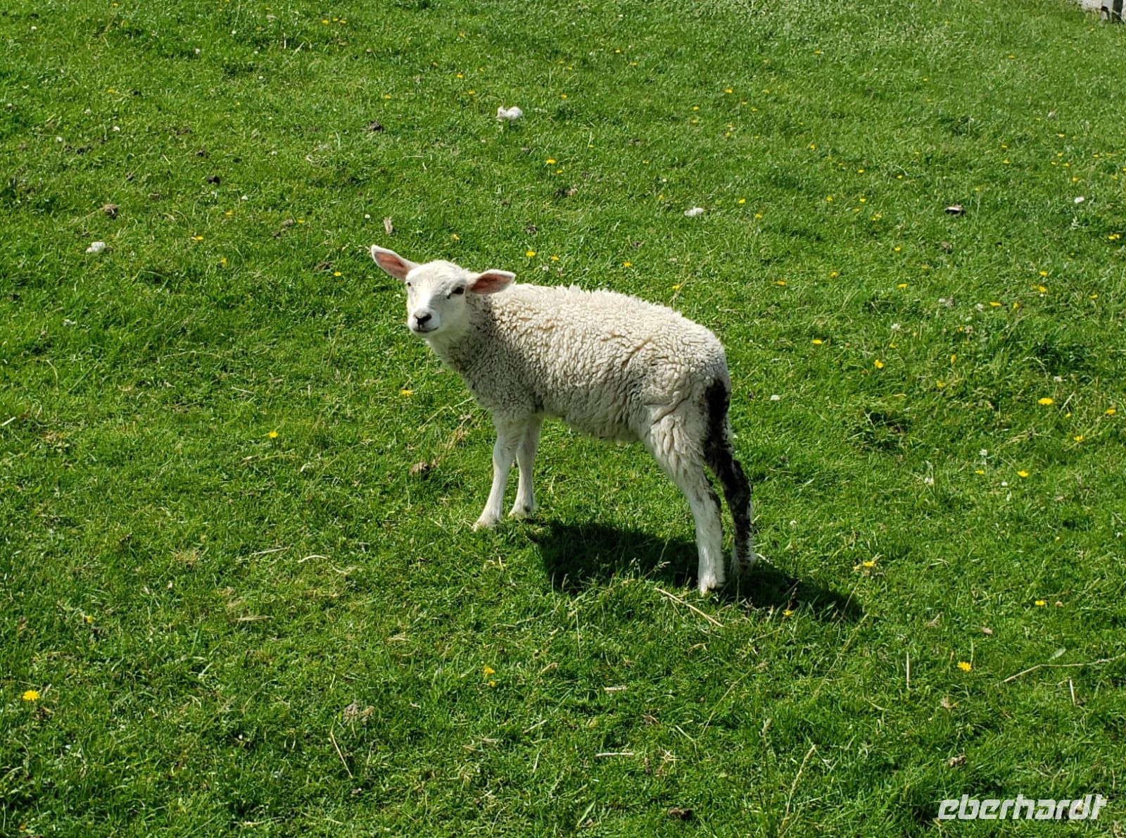 Am Nachmittag geht es über den Deichwanderweg. Wir sehen den kleinen Leuchtturm und die Kirche von Dagebüll. Wir laufen dabei durch viele Schafherden mitten hindurch!