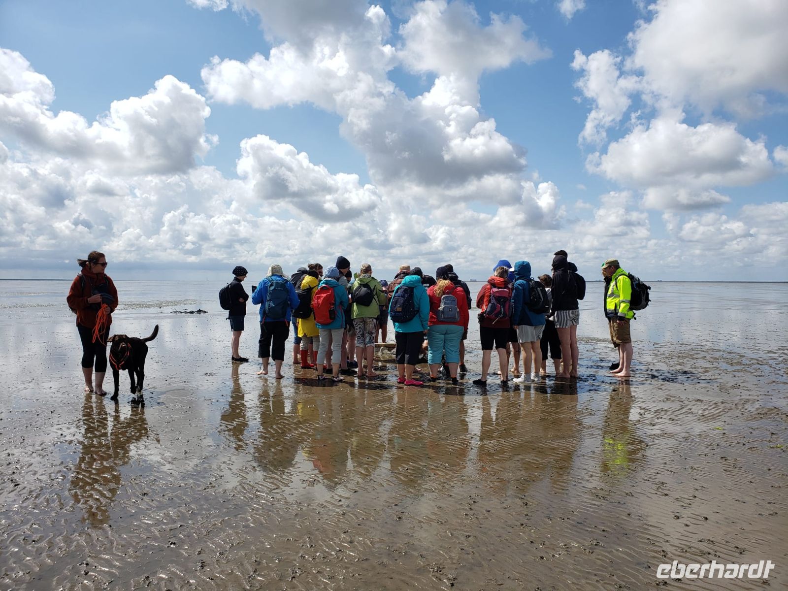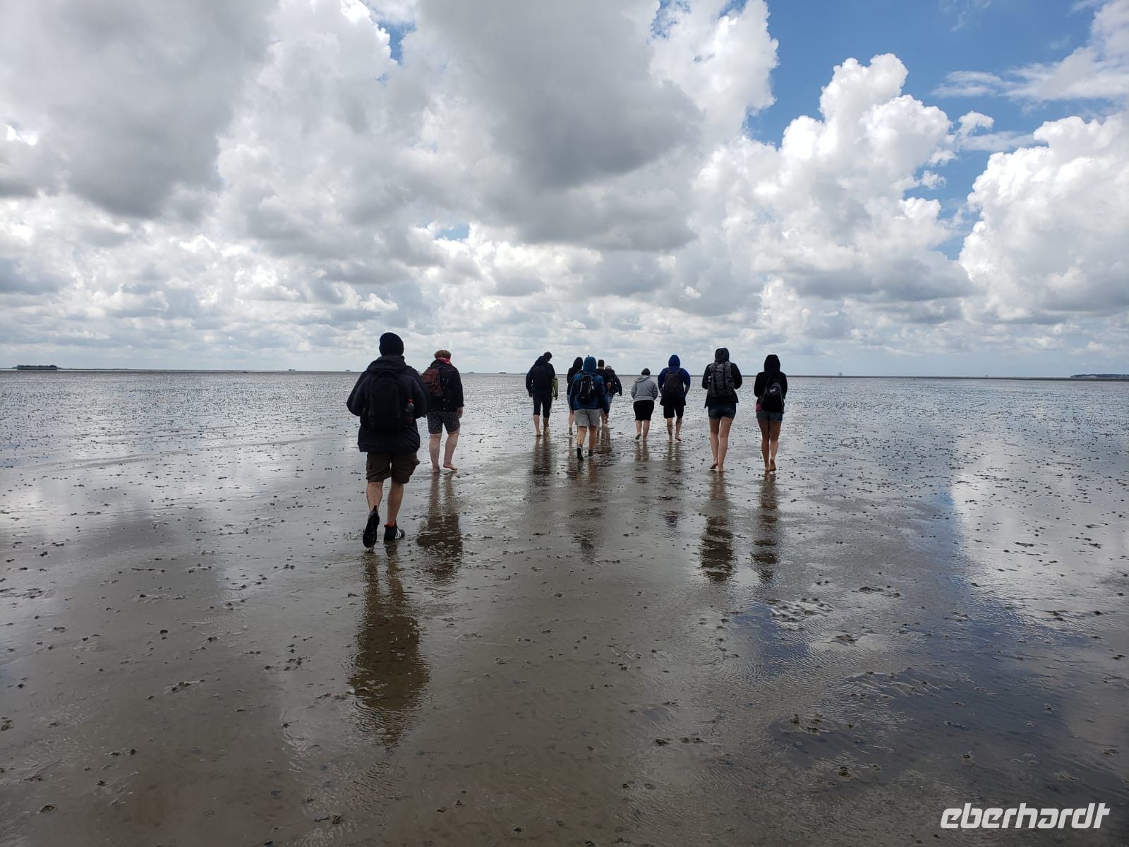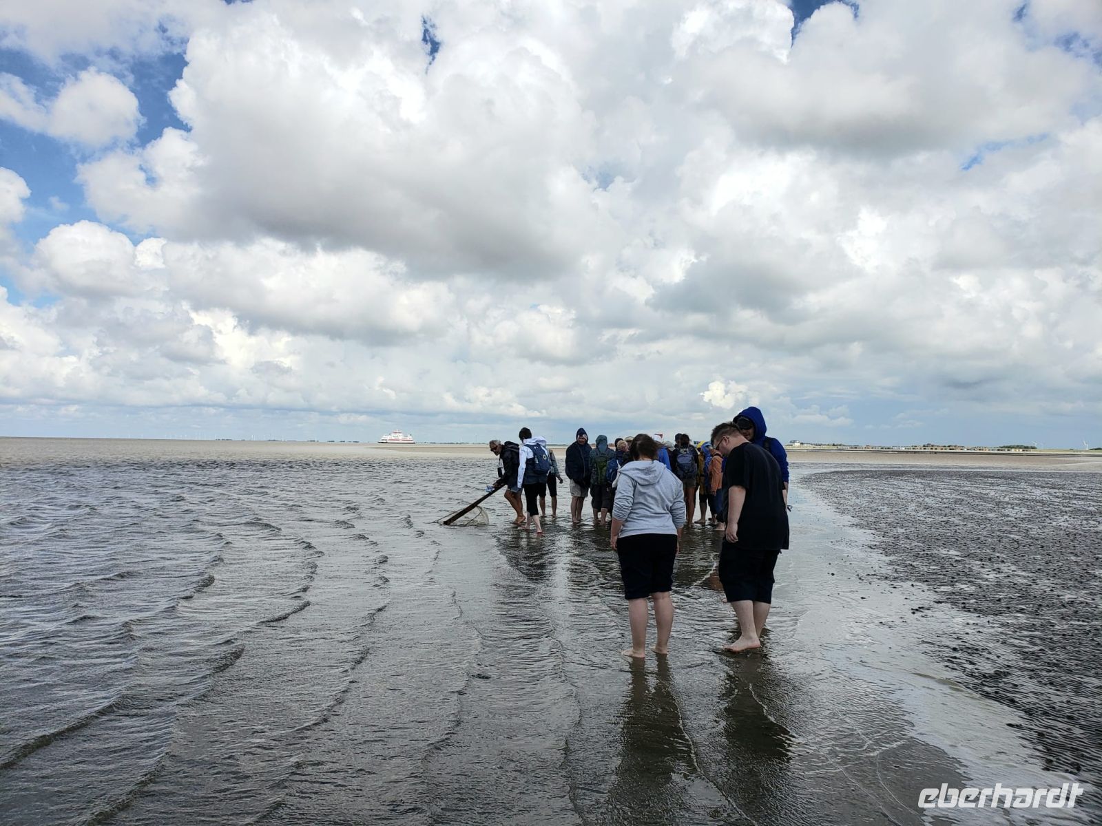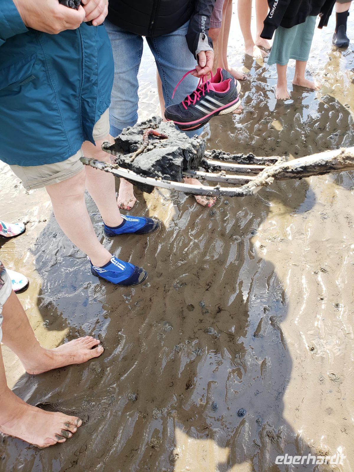 Die Sonne scheint. Am späten Vormittag heisst es, Wattschuhe oder Beachies anziehen und ab ins Watt. Herr Petersen führt uns durch das Wattenmeer und zeigt und erklärt uns viele, große und kleine Bewohner des Wattenmeeres ... Muscheln, Wattwürmer, Krabben. Gespannt hören wir ihm zu. Es ist wirklich erstaunlich, was es hier alles zu entdecken gibt.