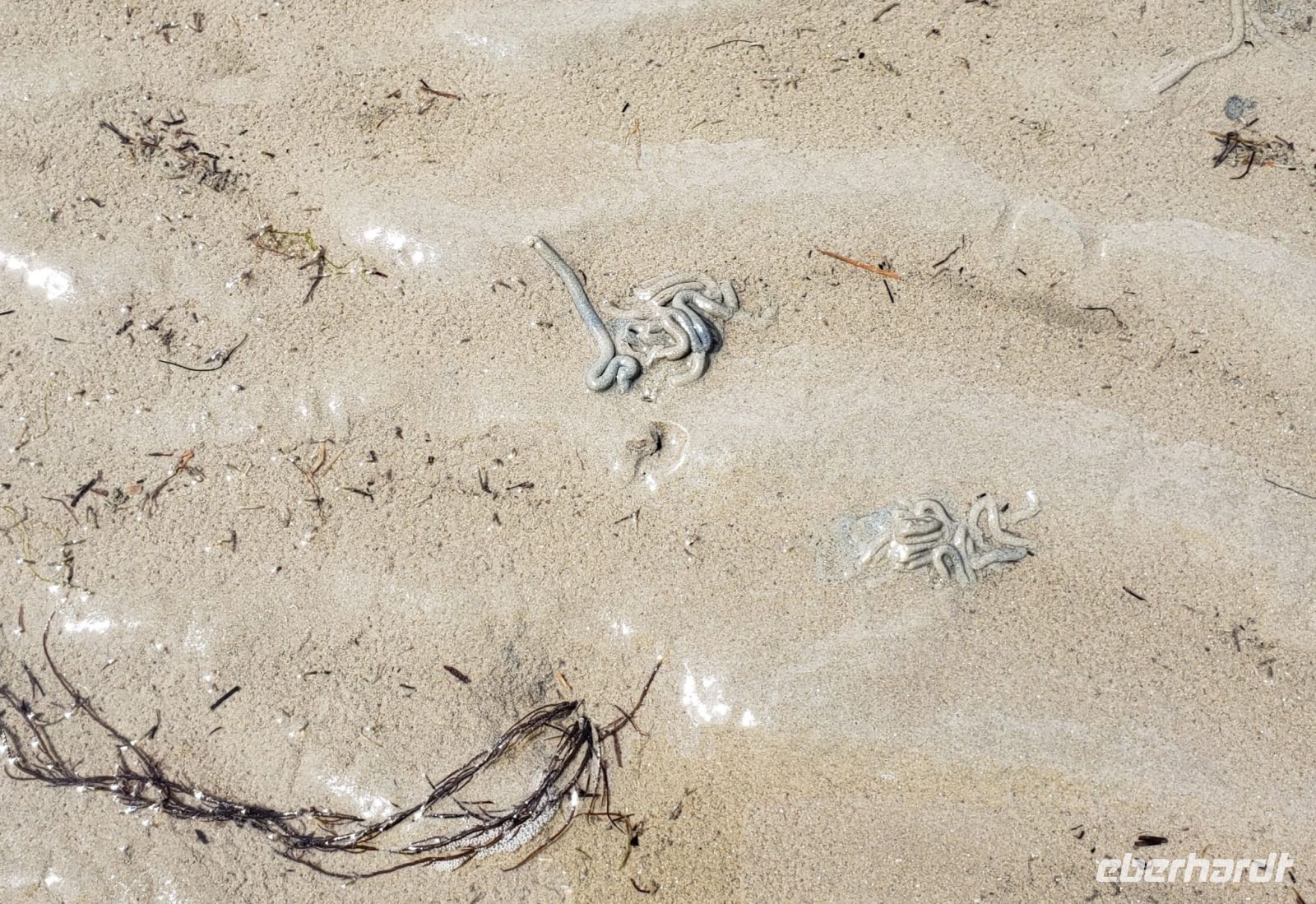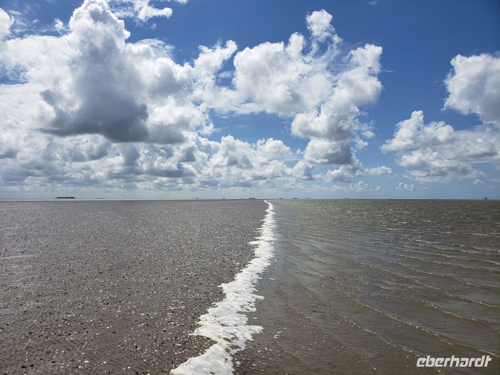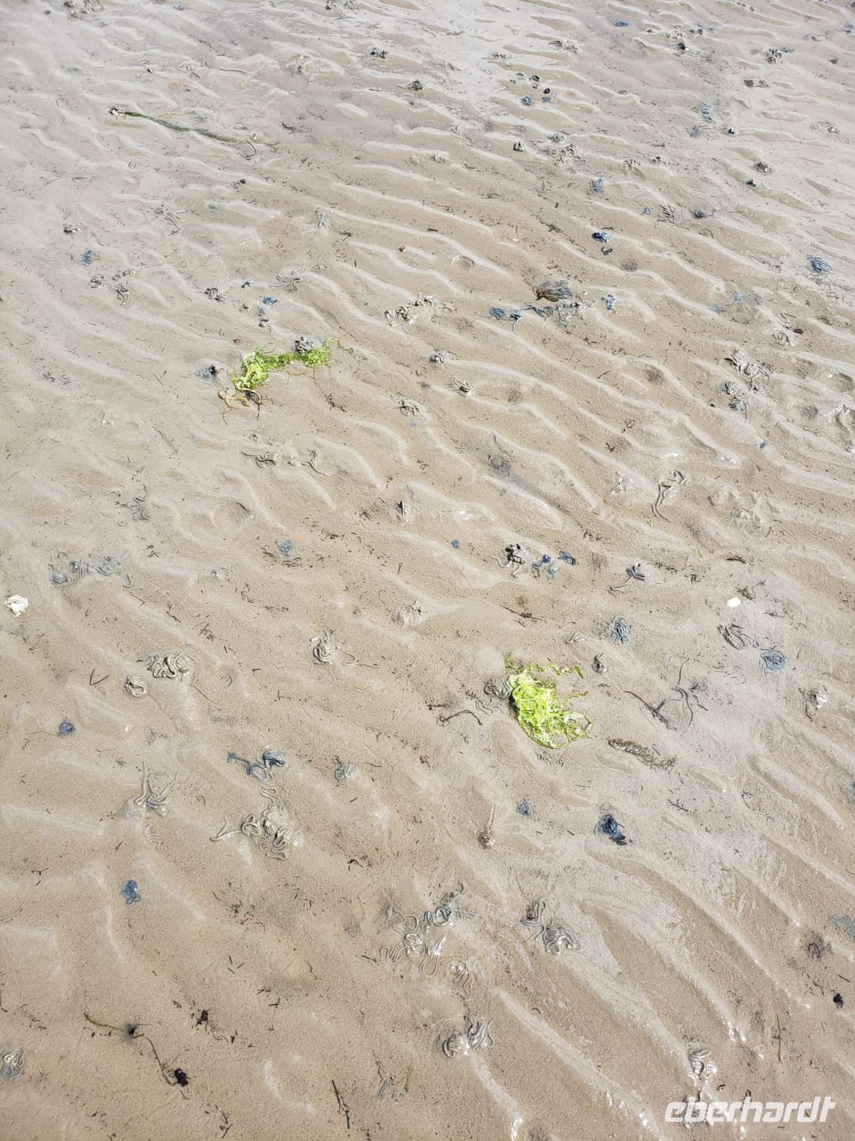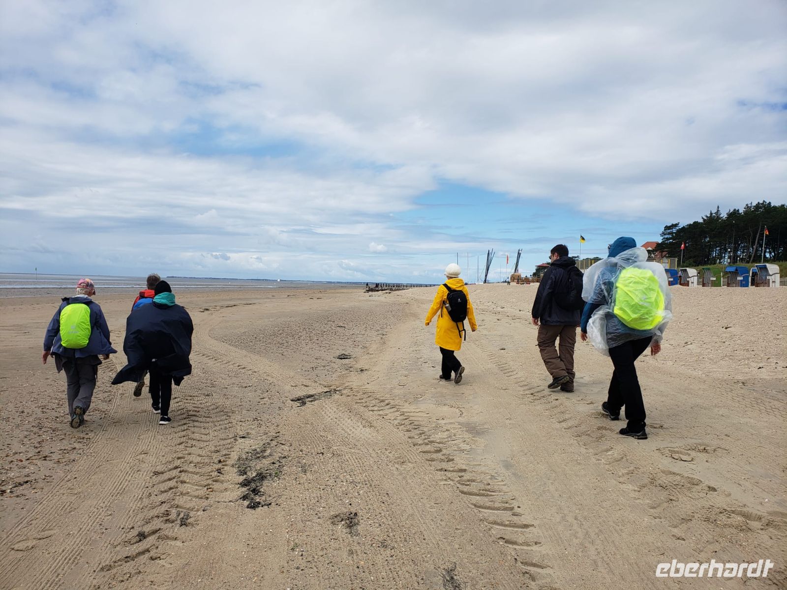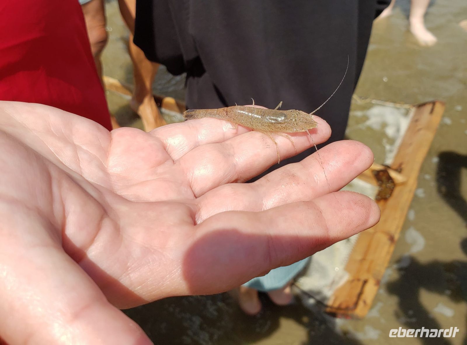 Die Sonne scheint. Am späten Vormittag heisst es, Wattschuhe oder Beachies anziehen und ab ins Watt. Herr Petersen führt uns durch das Wattenmeer und zeigt und erklärt uns viele, große und kleine Bewohner des Wattenmeeres ... Muscheln, Wattwürmer, Krabben. Gespannt hören wir ihm zu. Es ist wirklich erstaunlich, was es hier alles zu entdecken gibt.