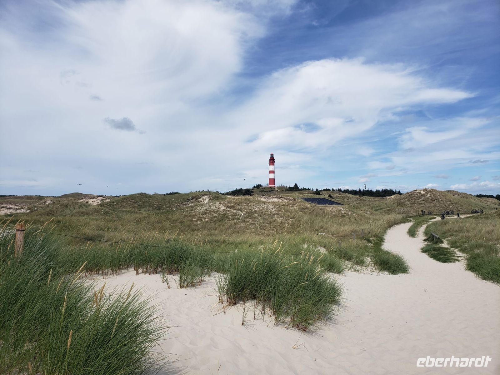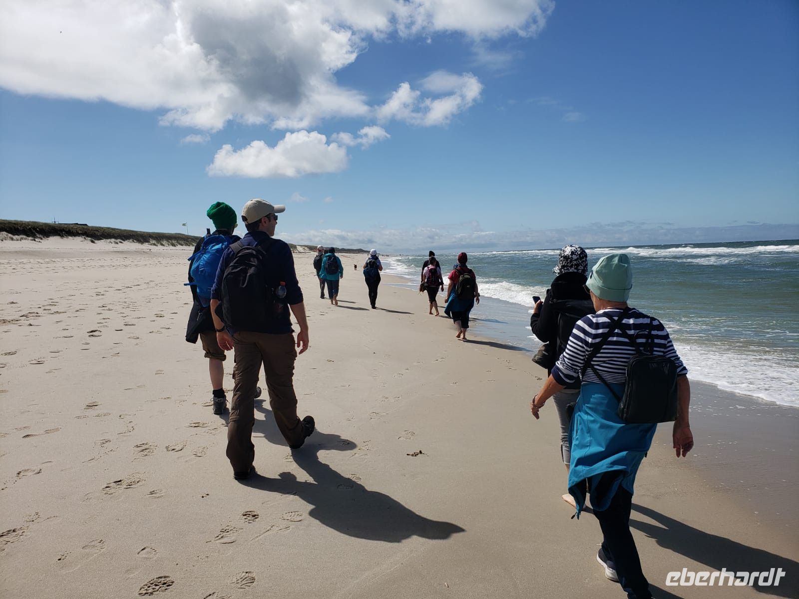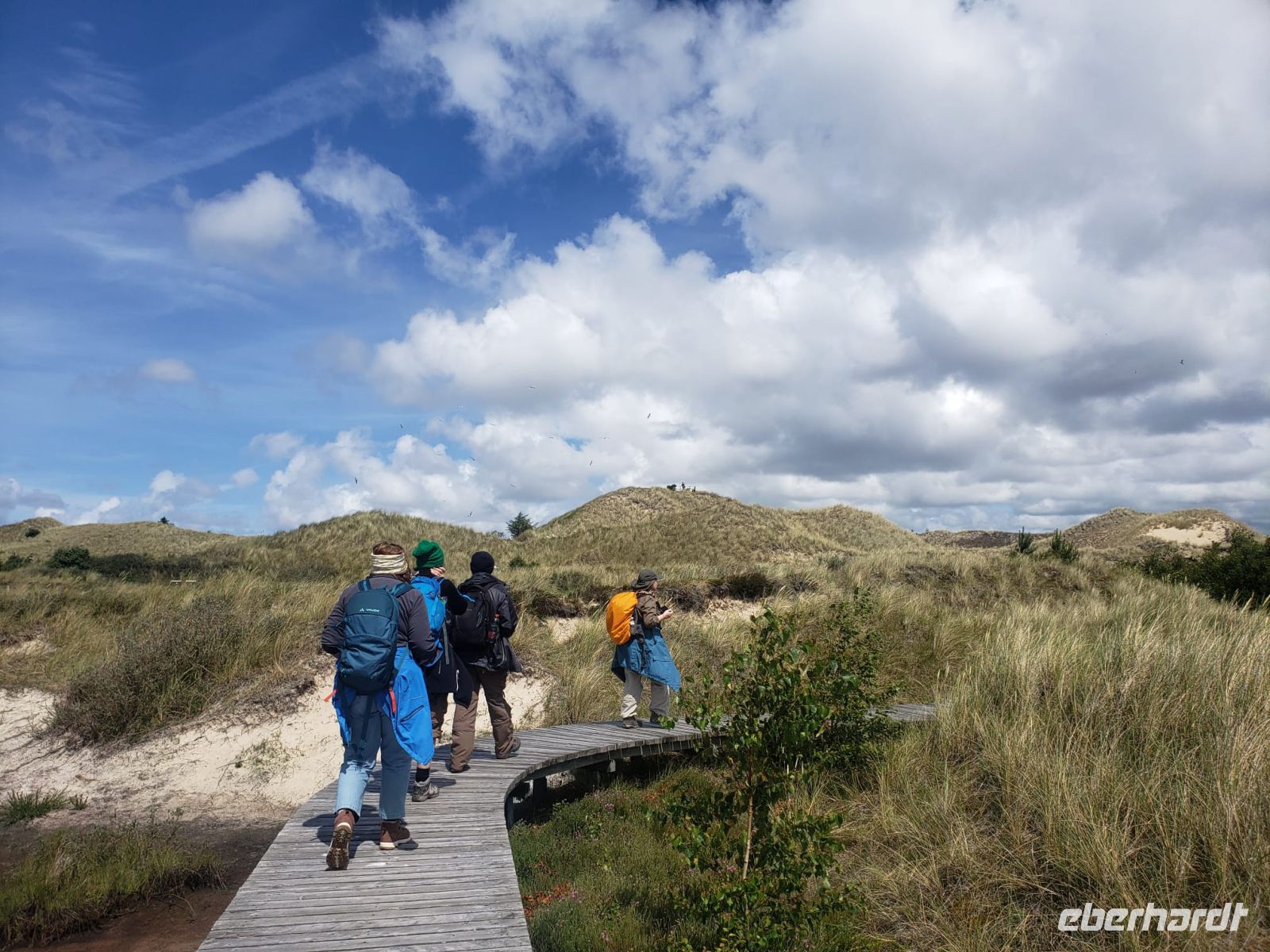 Über einen Bohlenweg besteigen wir eine Aussichtsdüne und genießen einen atemberaubenden Blick. Wir passieren den größten Süßwasser-See der Nordfriesischen Inseln, den Wriakhörnsee und sind anschließend auf dem Dünenwanderweg, mitten im Nationalpark, es ist hier einfach wunderschön. Wir laufen durch weichen, weißen, tiefen Sand. Es ist sehr anstrengend, aber etwas ganz ganz Besonderes! Unser Ziel ist der Leuchtturm. Auf einem schattigen Weg geht es zurück nach Wittdün. Einige gönnen sich hier ein Stück Friesentorte, schließlich hat man ja Urlaub!