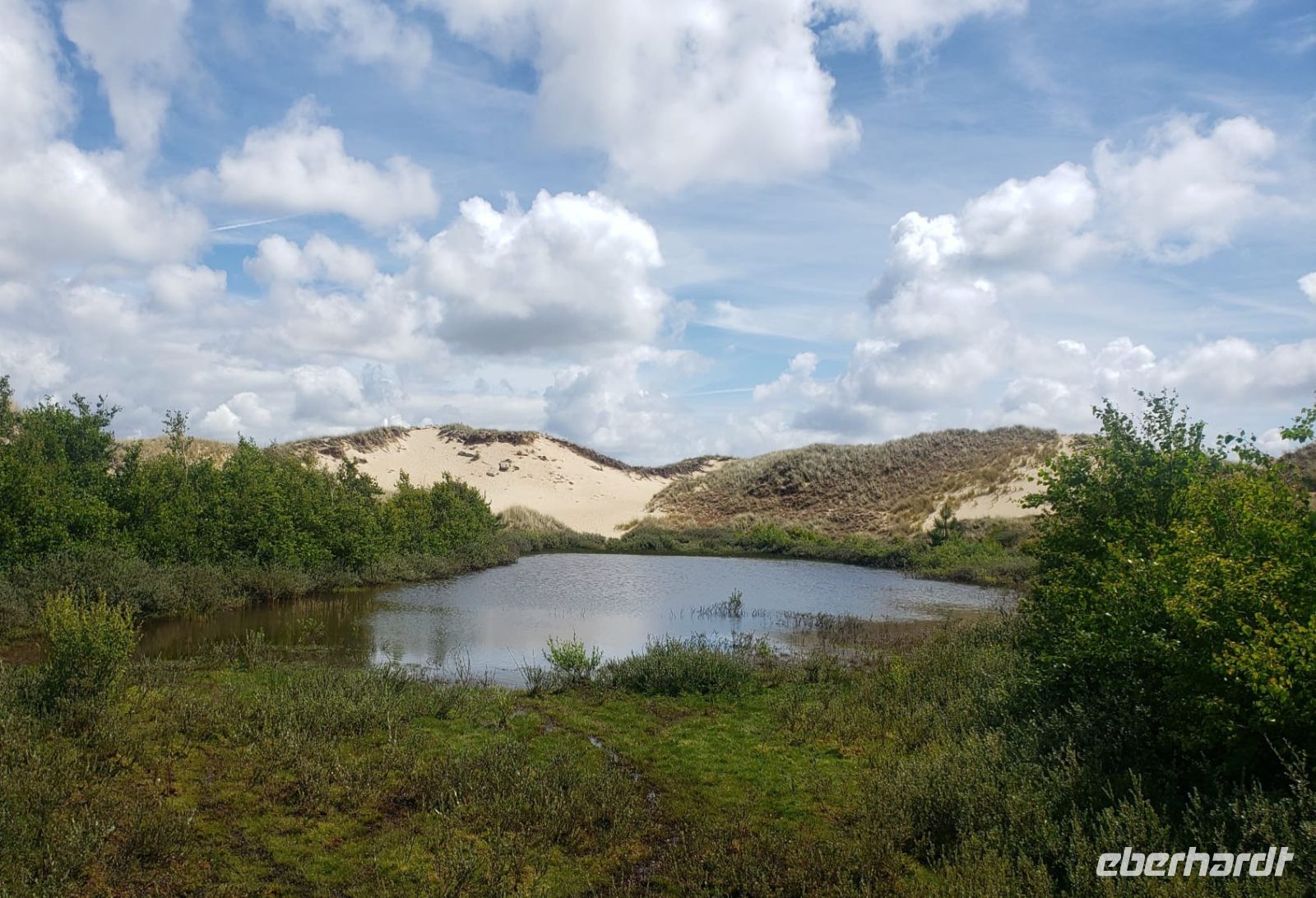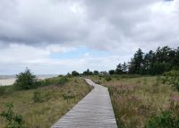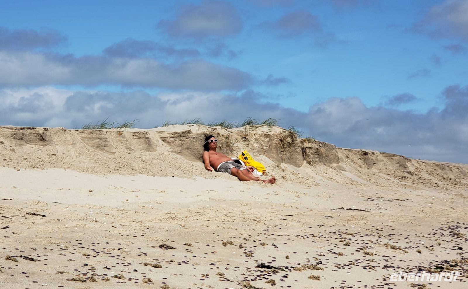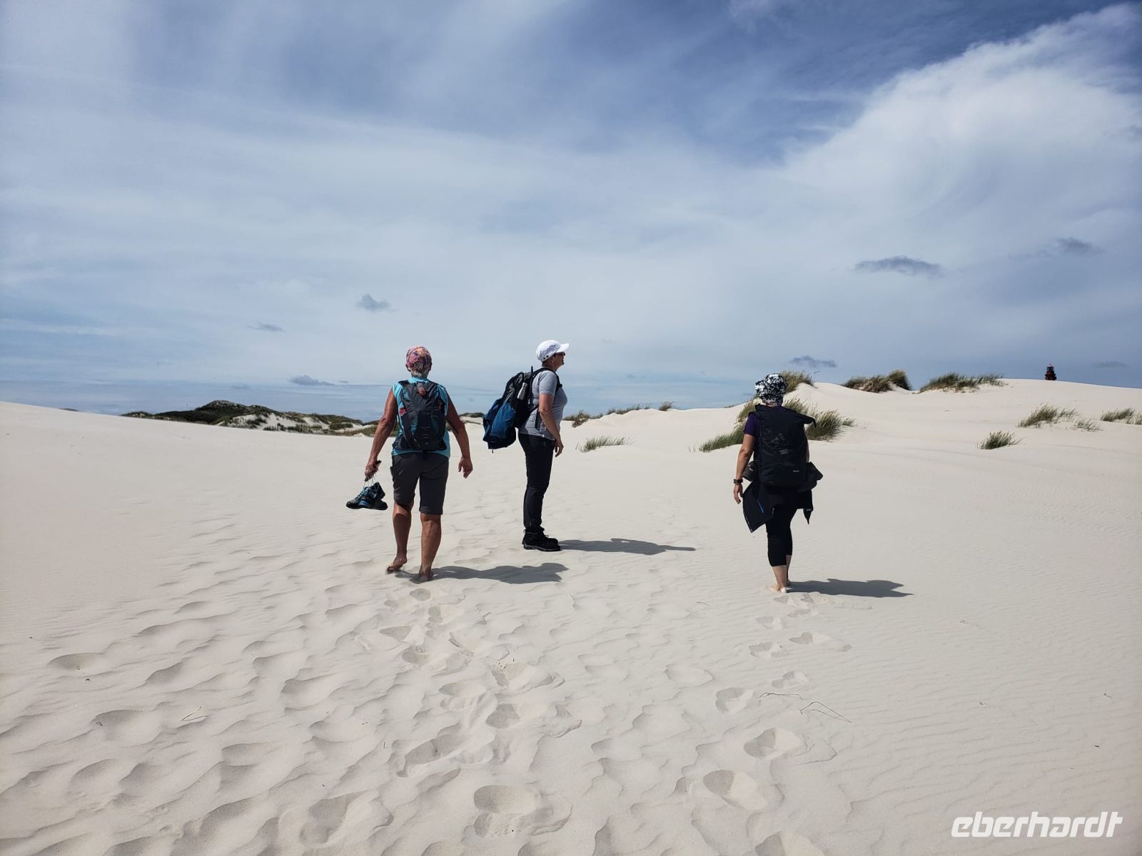 Über einen Bohlenweg besteigen wir eine Aussichtsdüne und genießen einen atemberaubenden Blick. Wir passieren den größten Süßwasser-See der Nordfriesischen Inseln, den Wriakhörnsee und sind anschließend auf dem Dünenwanderweg, mitten im Nationalpark, es ist hier einfach wunderschön. Wir laufen durch weichen, weißen, tiefen Sand. Es ist sehr anstrengend, aber etwas ganz ganz Besonderes! Unser Ziel ist der Leuchtturm. Auf einem schattigen Weg geht es zurück nach Wittdün. Einige gönnen sich hier ein Stück Friesentorte, schließlich hat man ja Urlaub!