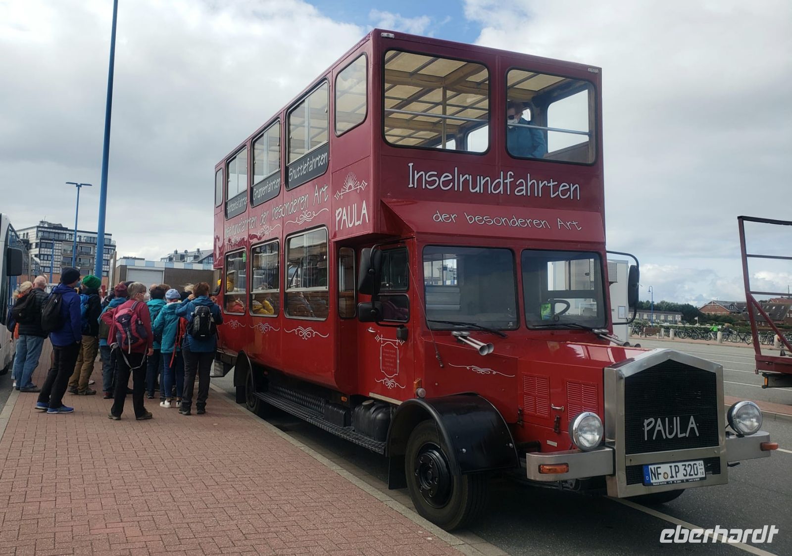 Mit einem urigen, knallroten Bus machen wir zunächst eine Inselrundfahrt und bekommen so einen tollen Gesamteindruck der Insel. Danach wandern wir los. Die Sonne lacht für uns, da freuen wir uns natürlich besonders drüber.