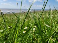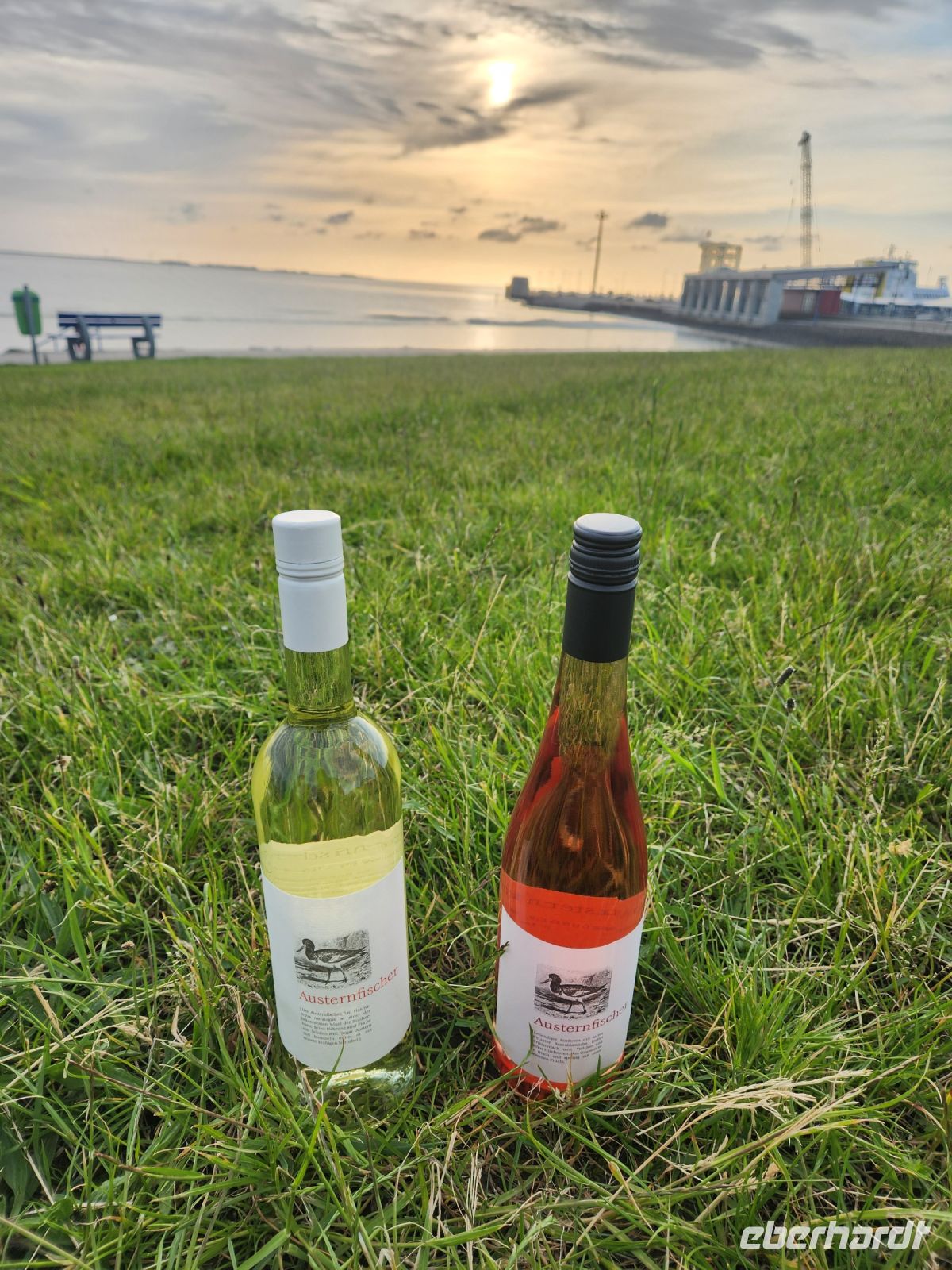 Nach dem Abendessen machen wir es uns auf der Wiese am Badedeich gemütlich und trinken Wein zum Sonnenuntergang.