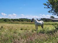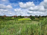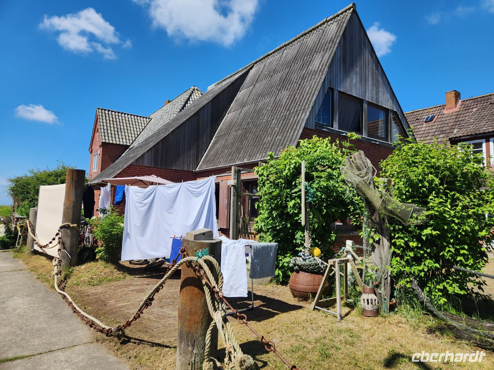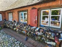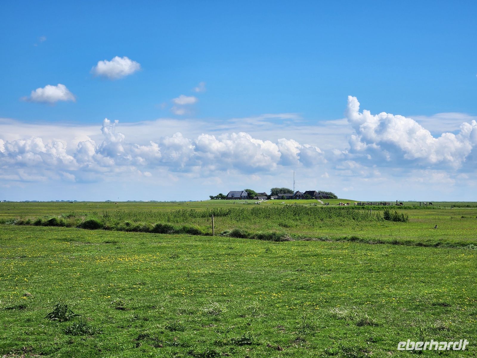 Heute ist ein freier Tag, aber der Tag ist einfach zu schade, um nur in der Sonne im Strandkorb zu liegen. Eine Dame aus unserer Reisegruppe mietet sich ein Fahrrad, um sich ganz in Ruhe die Umgebung von Dagebüll anzuschauen. Sie besucht die Süder-Waygaard Warft mit ihren vielen alten reetgedeckten Häusern und liebevoll gepflegtenVorgärten. Auf dem Rückweg fährt sie am Hauke-Haien-Koog vorbei, einem Vogelschutzgebiet.