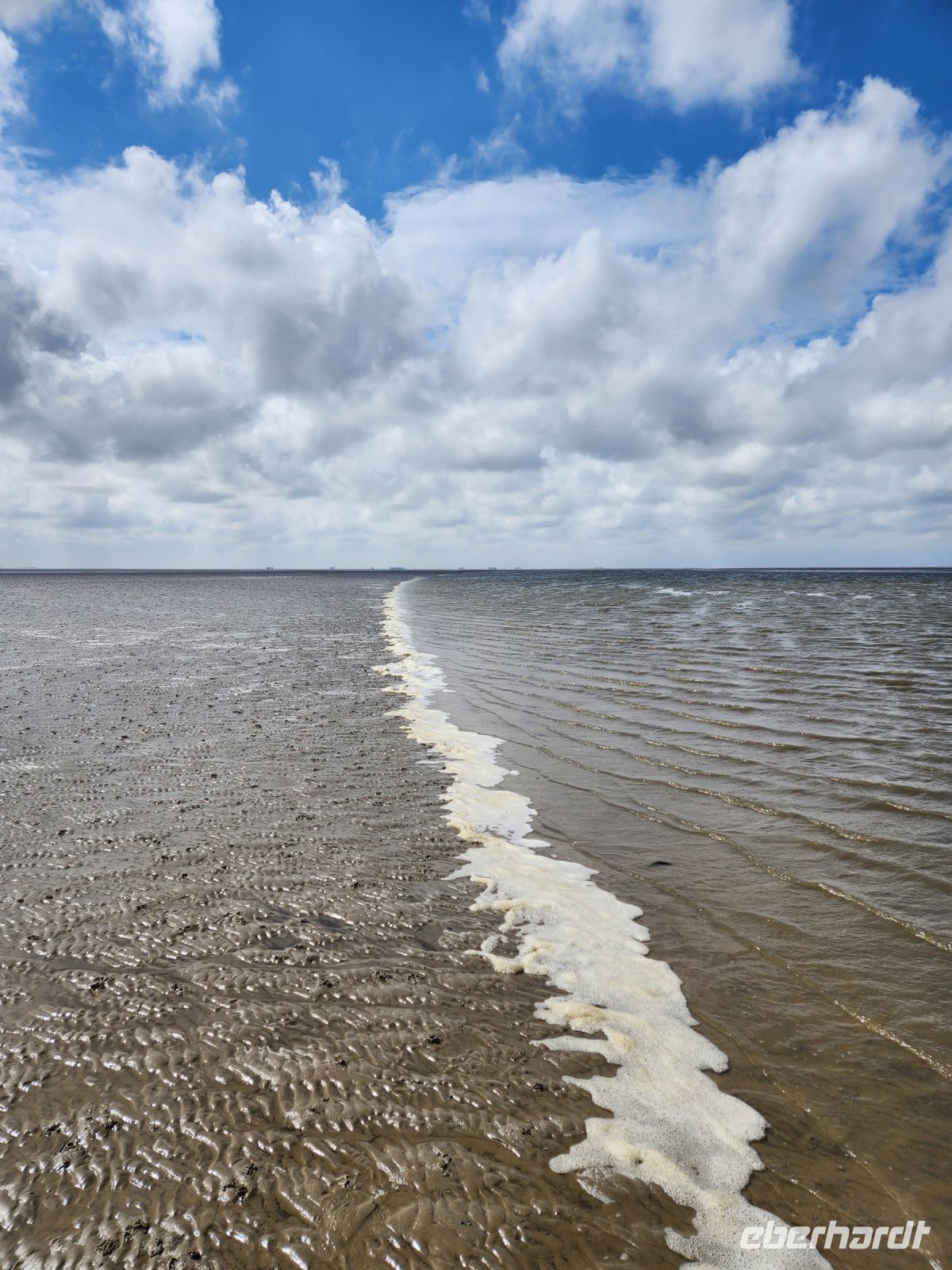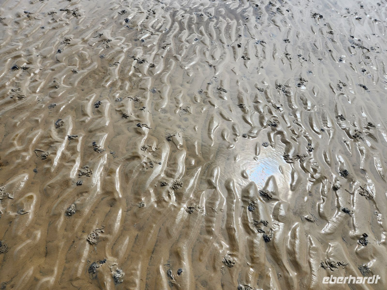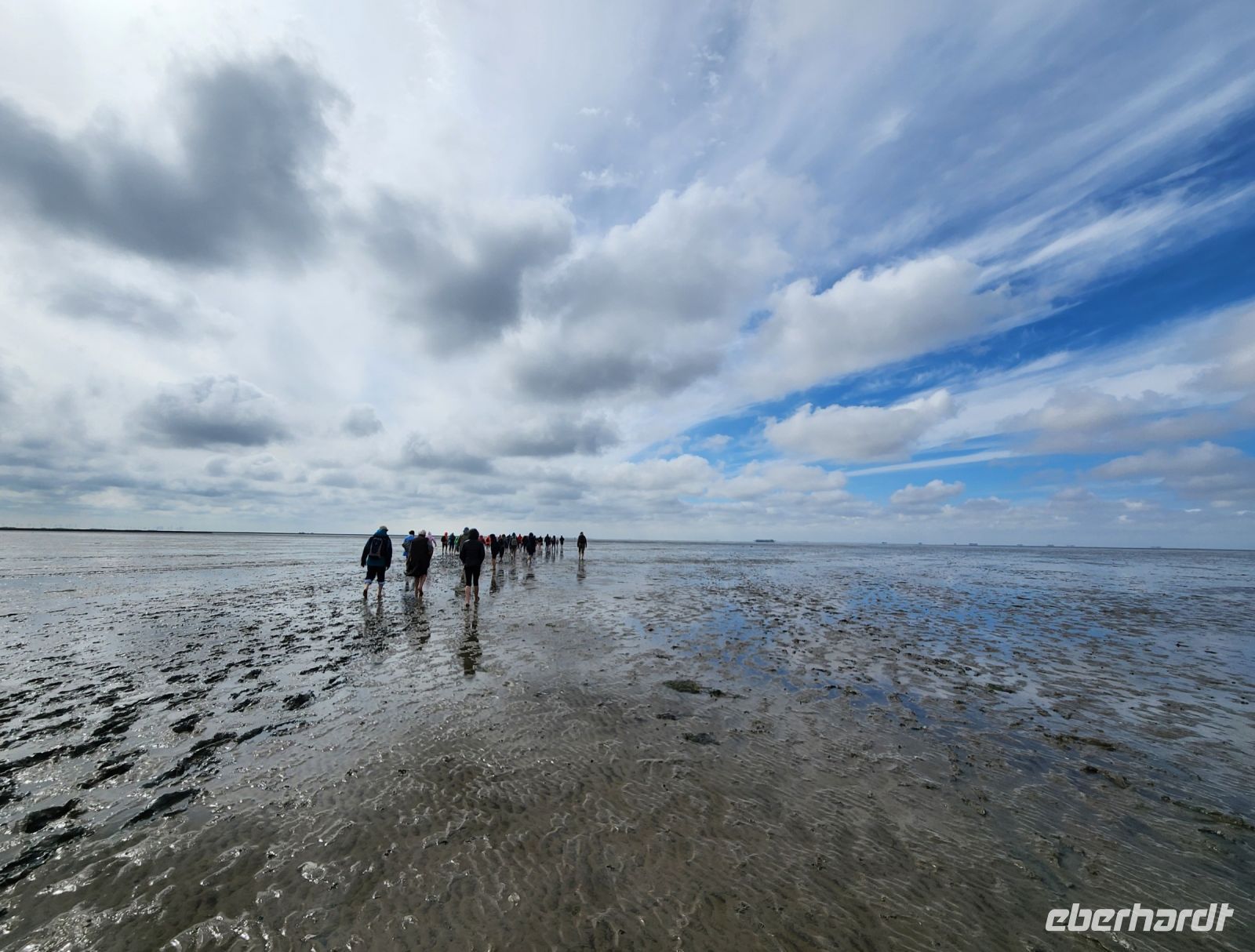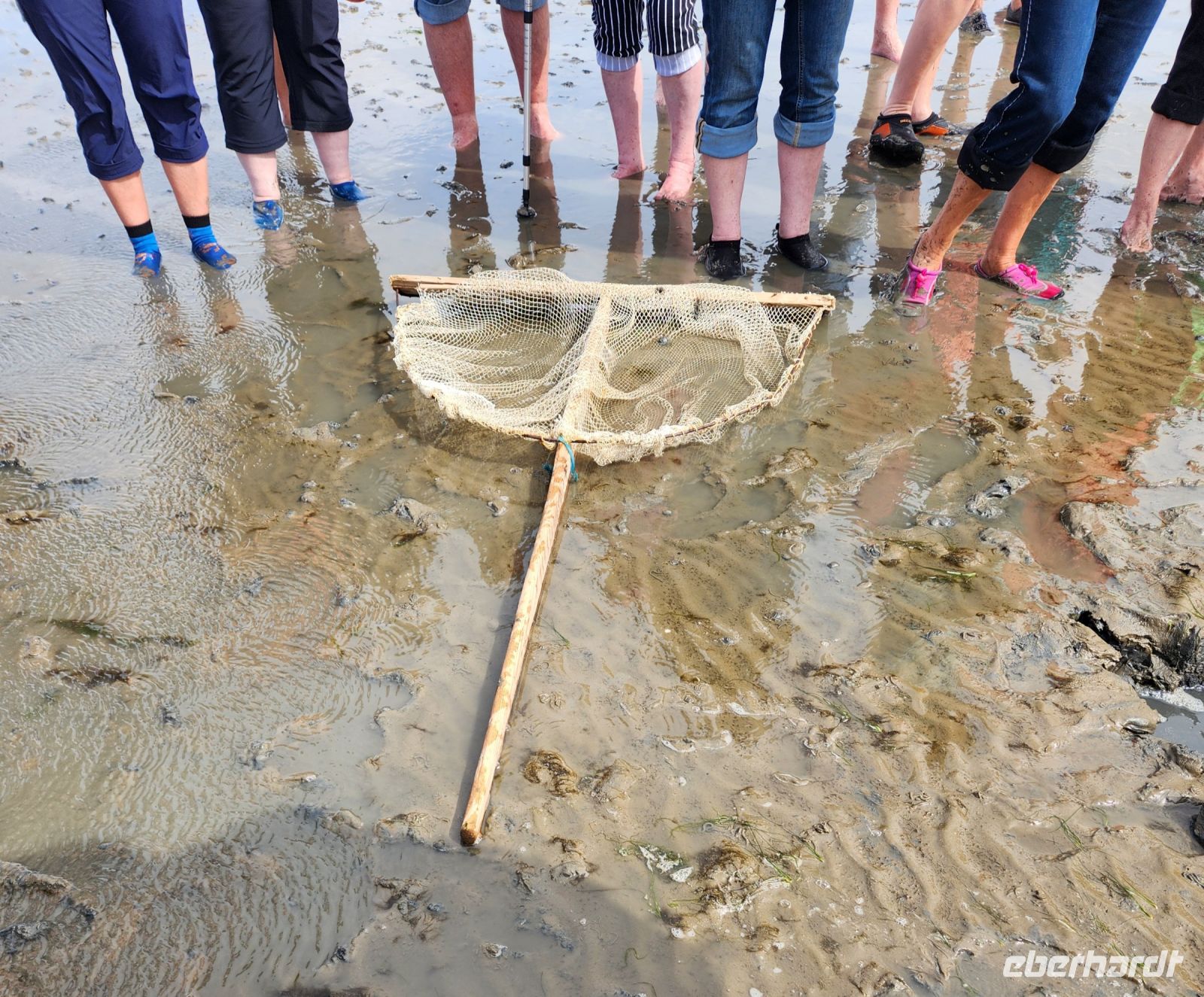 Es ist gerade Ebbe, unser Wattführer buddelt nach Wattwürmern, Krebsen und Muscheln.Wir lernen viel Wissenswertes über diese Wunderwelt, die zum UNESCO - Weltnaturerbe ernannt wurde. Wir laufen 2 km ins Meer hinaus, bis die Flut wieder einsetzt und können dann genau beobachten, wie das Wasser wieder zurückkommt.