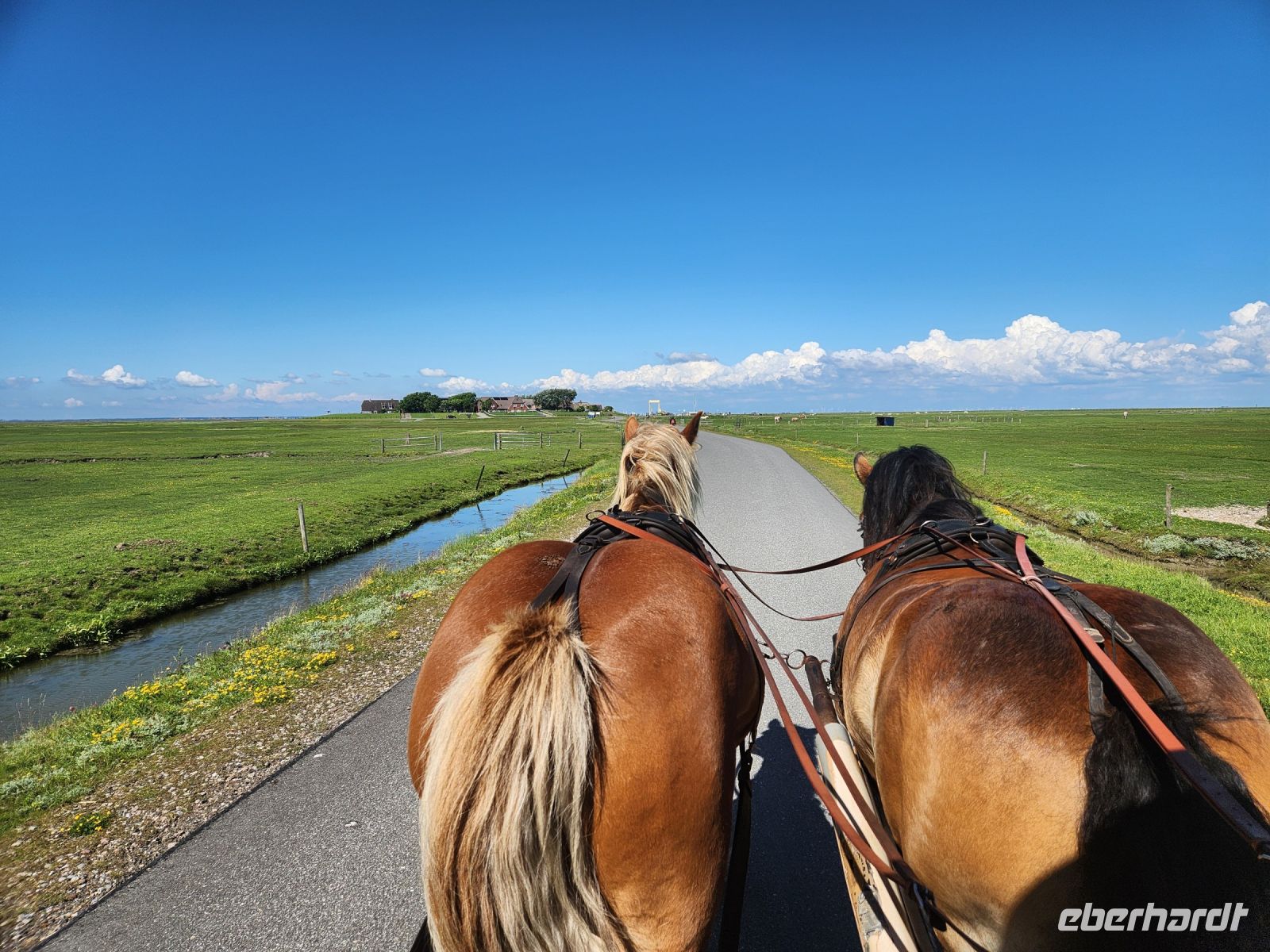 Alle anderen fahren mit der Fähre Hilligenlei zur Hallig Hooge. Dort erwartet uns eine völlig andere, friedliche Welt. Kutscher Willi erwartet uns schon am Fährhafen. Auf den vielen flachen Wiesen fühlen sich Rinder, Schafe, Ziegen und Pferde wohl. Wir besichtigen die Kirchwarft, das Sturmflutkino und das Kapitänshaus Königspesel.