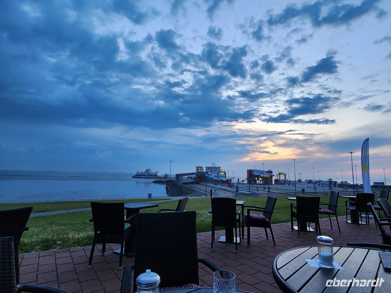 Am Abend ist unsere Wandergruppe vollzählig. In der Abendsonne sitzen wir auf der Terrasse unseres Hotels und trinken noch etwas zusammen. Unser Strandhotel liegt wunderschön direkt am Deich mit Blick auf die Nordsee.