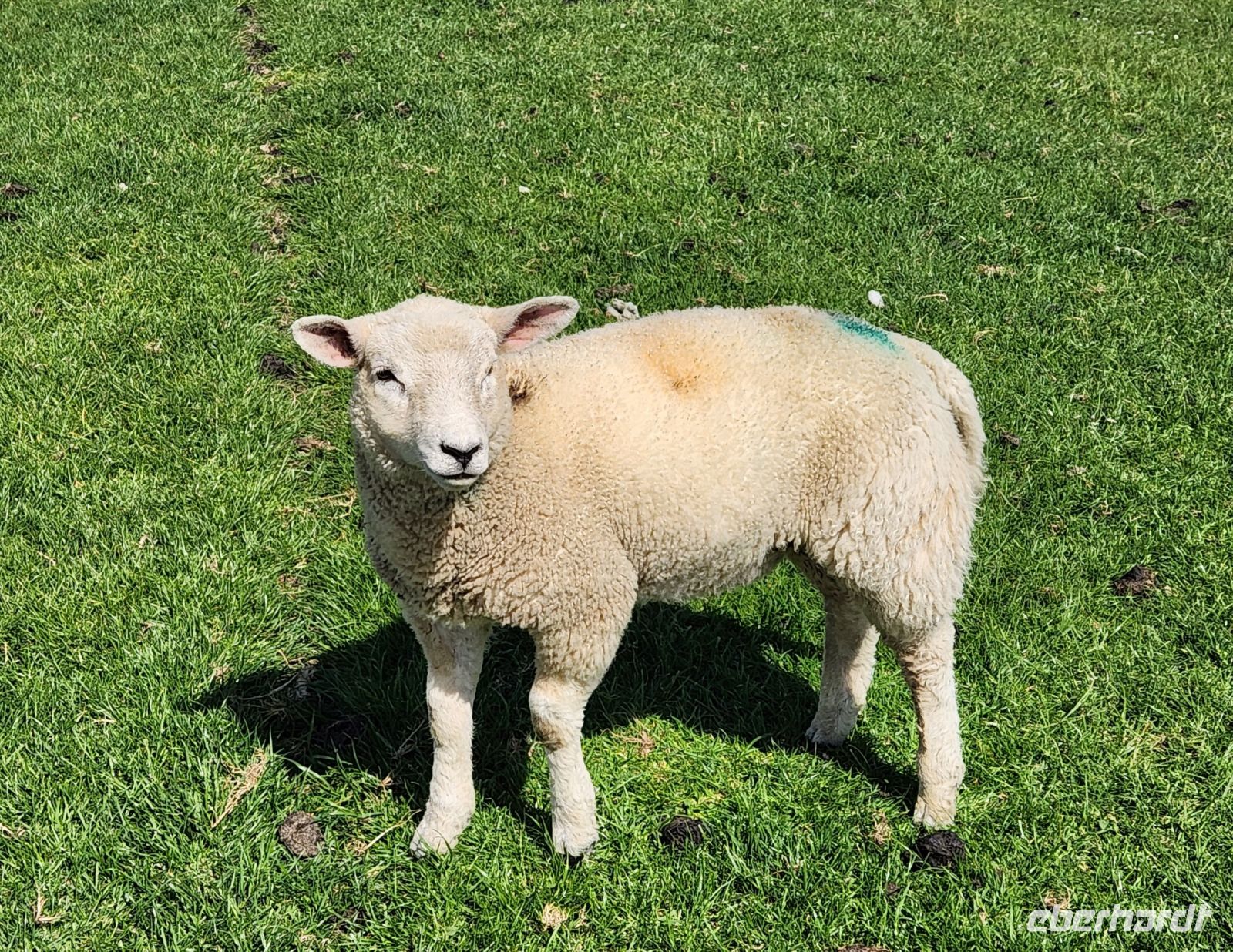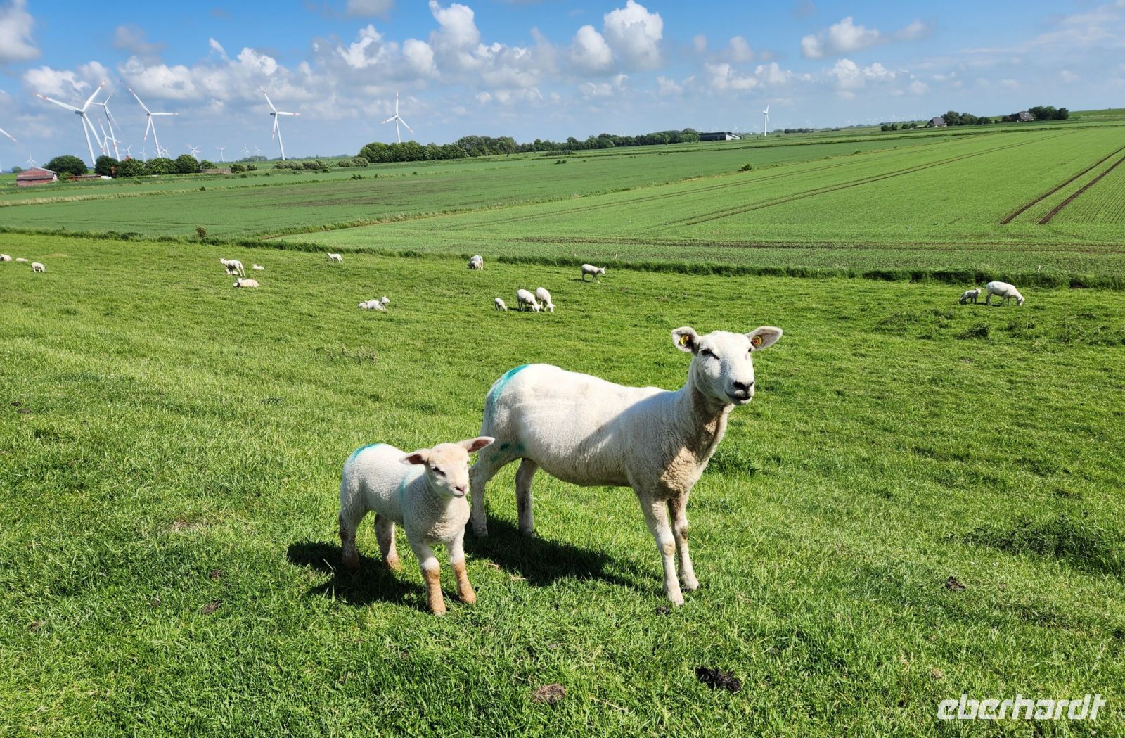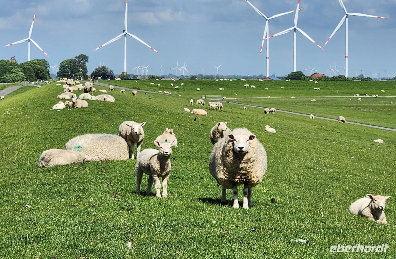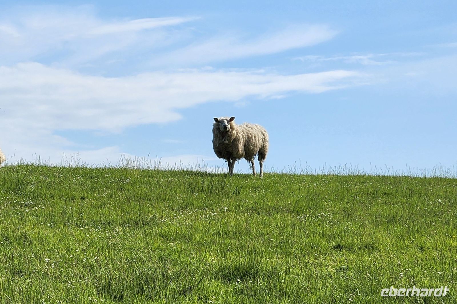 Die Sonne scheint nochmal für uns, so haben wir alle ein schönes Abschiedsbild im Kopf von Deichschafen, die auf saftig grünen Wiesen im Sonnenschein stehen.