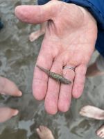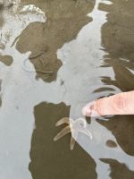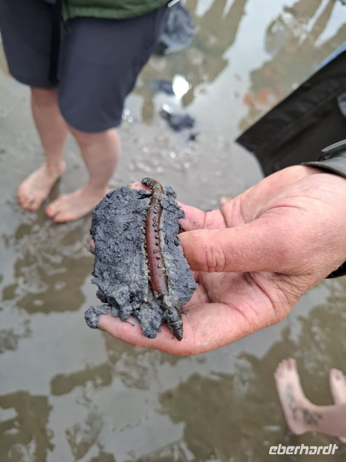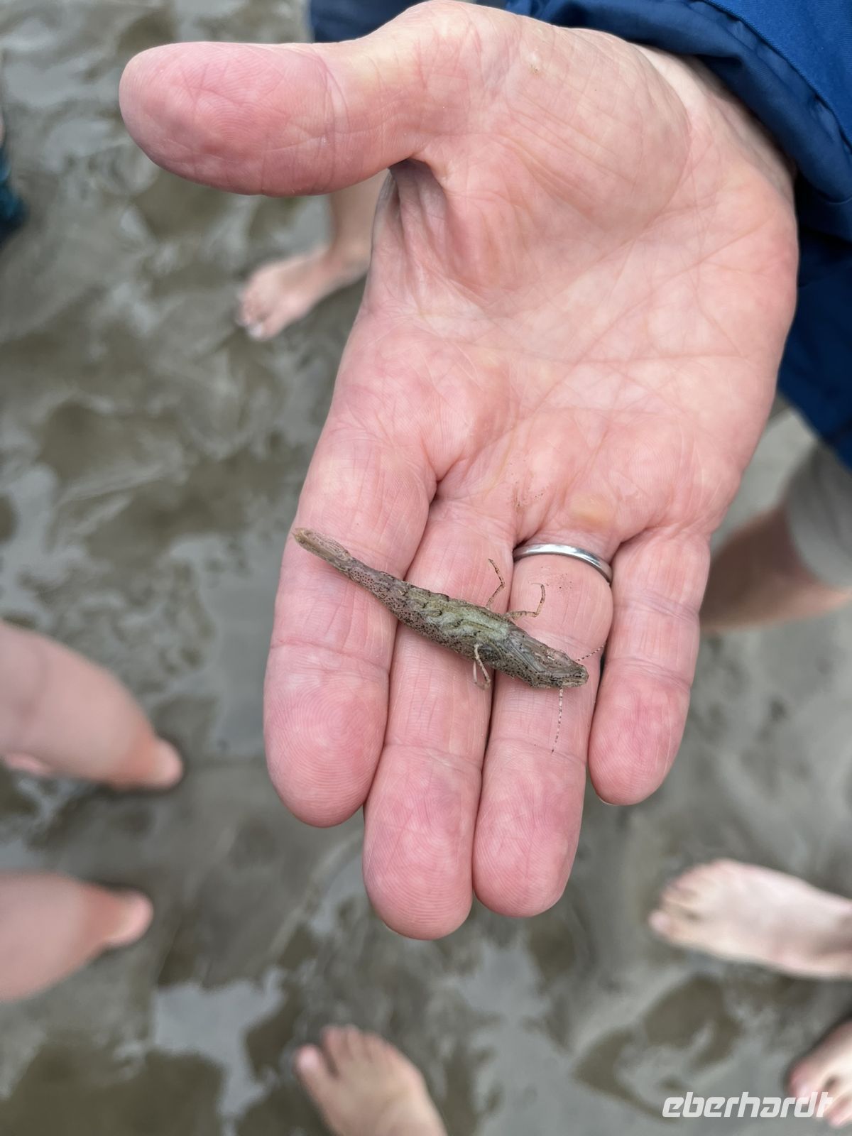 Nach einer längeren Mittagspause nahm uns der Wattführer mit und verriet uns unter anderem, wer die kleinen, spiralförmigen Häufchen auf dem Wattboden produziert. Das ist nämlich der Wattwurm. Mit einem Angelkescher wurden zahlreiche Krabben gefischt und man durfte sie auch in die Hand nehmen. Seesterne und Herzmuscheln, die sich wieder in den Sand eingruben, faszinierten uns.
