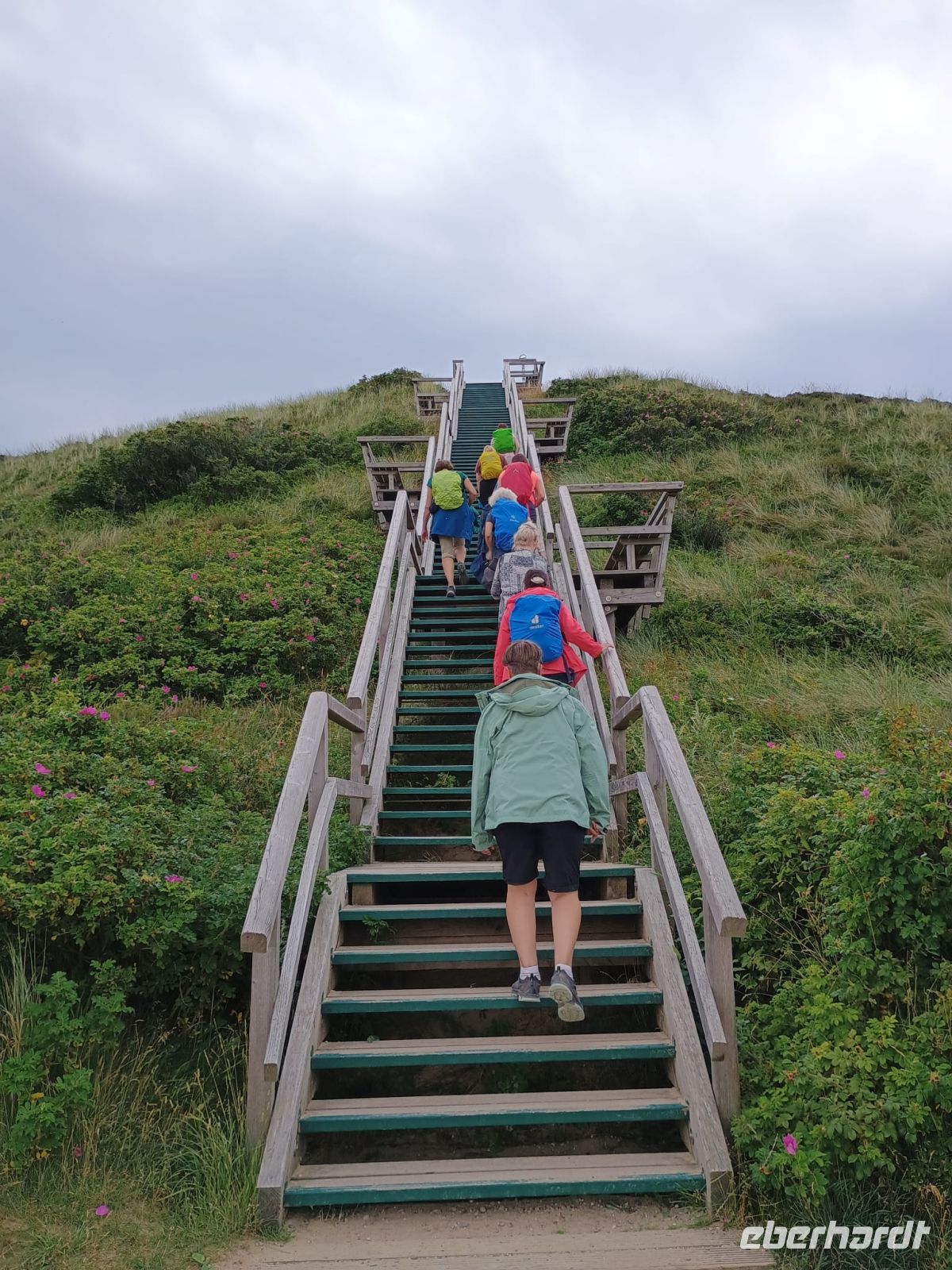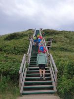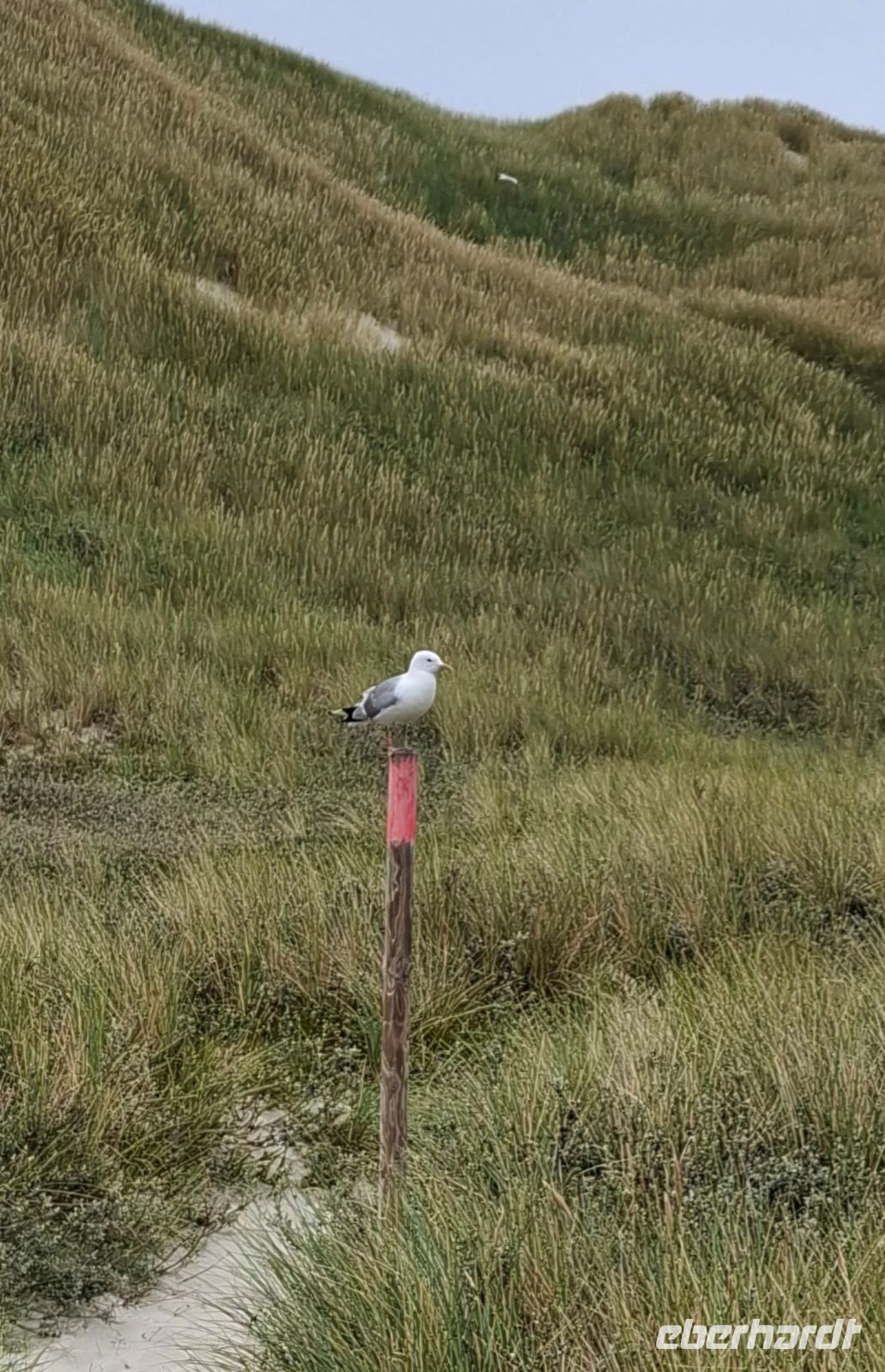 Wir lassen uns aber nicht aus der Ruhe bringen und beginnen unsere Wanderung in Wittdün Richtung Leuchtturm und erahnen nur den berühmten Kniepstrand. Die Holzstege bringen uns zum Wriakhörnsee, an dem wir eine Zeit lang den Seevögeln zuschauen. Danach geht es über eine hohe Sanddüne, um einen Blick auf das Meer zu erhaschen. Doch hier ist der Strand so tief, daß man nur einen kleinen Eindruck bekommt, wo das Wasser sein könnte.