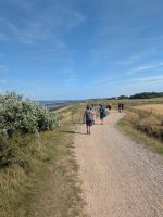 So gestärkt beginnt der Rückweg entlang des 15 km langen Sandstrandes von Föhr - ein weiter, offener Weg mit Blick über das Meer. Doch kaum sind wir unterwegs, setzt Regen ein. Spontan, plötzlich als hätte jemand über uns Eimer umgedreht. Regenjacken und -ponchos werden eilig übergezogen, Regenschirme aufgespannt und mit "norddeutscher" Gelassenheit stapfen wir weiter. Zwei Teilnehmer lassen es sich trotzdem nicht nehmen und laufen barfuss am Meeressaum entlang. Da in Wyk trotzdem alle ziemlich nass ankommen, beschliessen wir eine Fähre früher zu nehmen und die Gruppe schafft es so gerade 3 Minuten vor Abfahrt und sogar unsere beiden "Wassernixen" sind plötzlich an Bord.