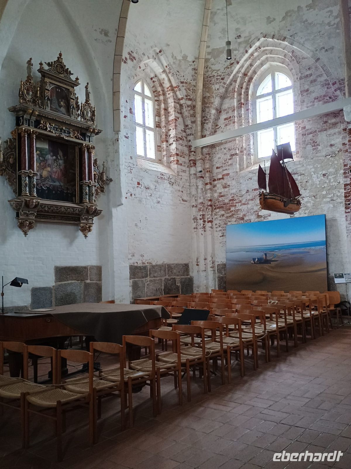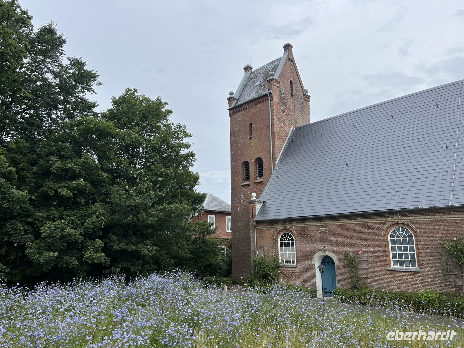 Auf dem Rückweg zum Anleger besuchen wir die Halligkirche, deren Fussboden aus einer Mischung von Sand und Muscheln besteht.
