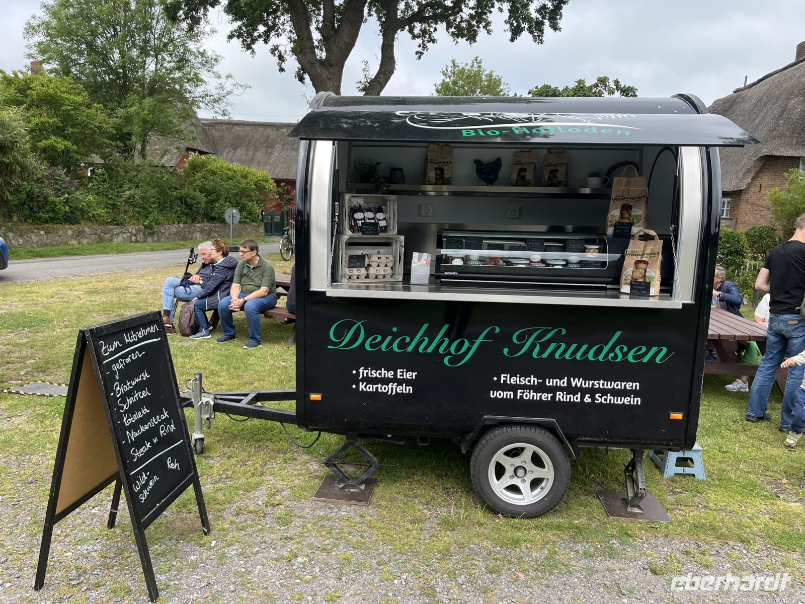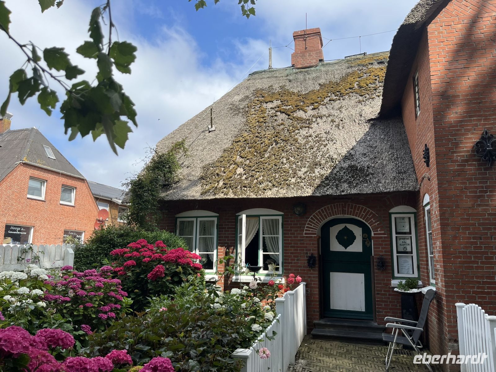 Der Tag beginnt vielversprechend: Alle sind gespannt auf den Hafen Dagebüll und das Einchecken auf dem grossen Fährschiff der W.D.R (Wyker Dampfschiffahrtsreederei). Nach der Überfahrt erreichen wir die Hauptstadt Wyk und machen uns auf den Weg an vielen reetgedeckten Klinkerhäusern vorbei durch Boldixum und Wrixum nach Oevenum. Dort treffen wir pünktlich zum kleinen, vielseitigen Wochenmarkt ein und bummeln eine halbe Stunde jeder nach seinem Interesse an den Ständen vorbei. Mancher Gast kauft eine Schafseife und eine Schafsalami, ein anderer eine Schale Erdbeeren.
