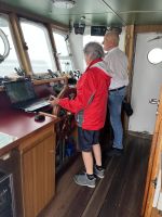 Während der Weiterfahrt darf eine Teilnehmerin Kapitän spielen und lenkt die MS Seeadler eine halbe Stunde gen Hallig Hooge, während andere am Bug den Film "Titanic" nachspielen. Angekommen an der kleinen Anlegestelle von Hallig Hooge gehen wir zu Fuß Richtung Hanswarft. Auf Halligen gibt es keine Städte, Orte oder Dörfer sondern nur Warften - künstlich aufgeschüttete Hügel, auf denen die wenigen Häuser vor den Sturmfluten geschützt stehen. So eine Hallig wird im Schnitt 30 Mal im Jahr überschwemmt.