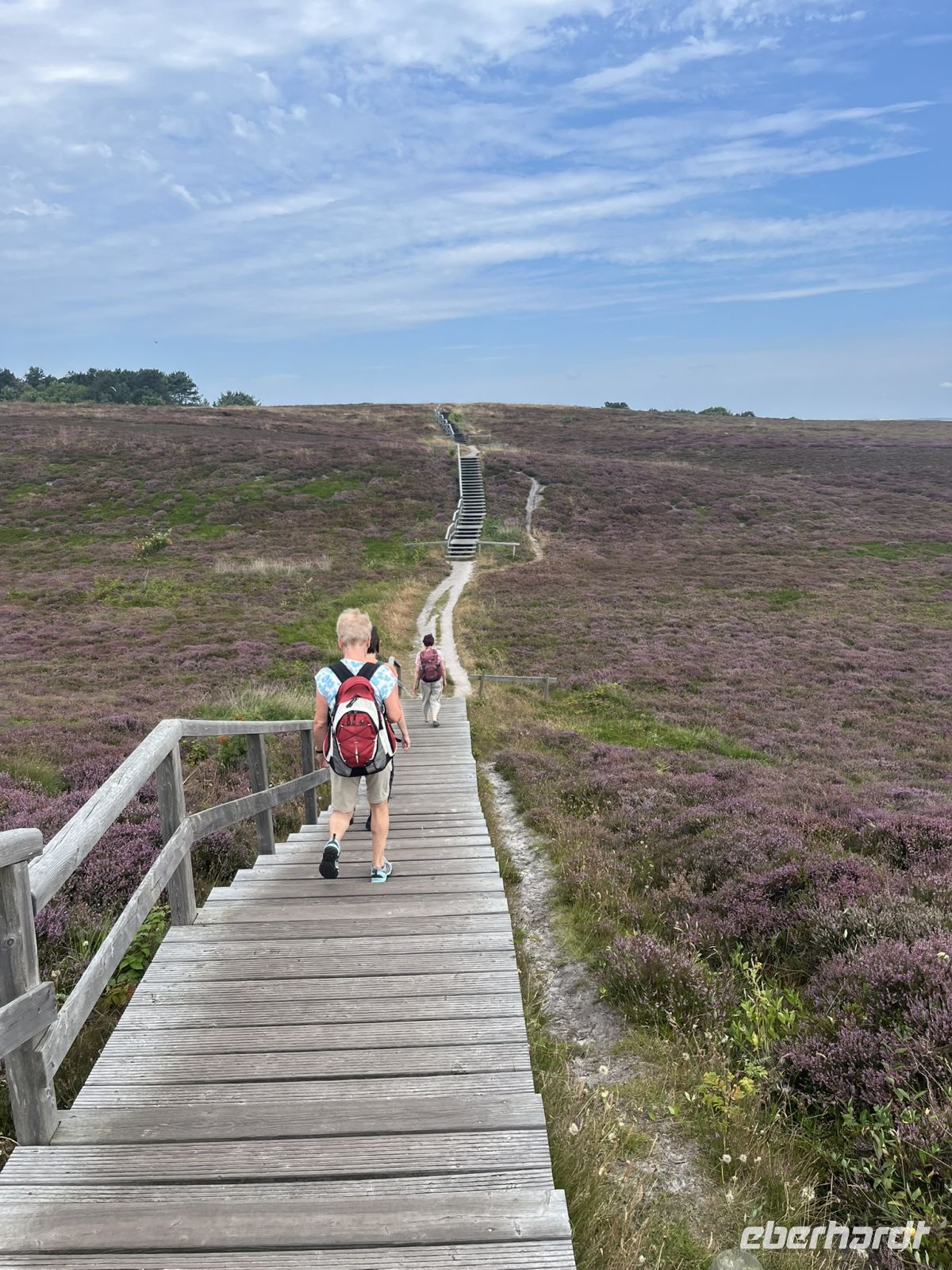 Nach der Zugfahrt ab Dagebüll nach Westerland, die uns beim Umsteigen in Niebüll eine halbe Stunde Verspätung bringt, startet unsere Wandertour in der Braderuper Heide, einem der stilleren und landschaftlich reizvollsten Orte der Insel. Das lila Blütenmeer der Glockenheide, durchzogen von kleinen Sandwegen und von der salzigen Nordseeluft umweht, schafft eine einmalige Atmosphäre.