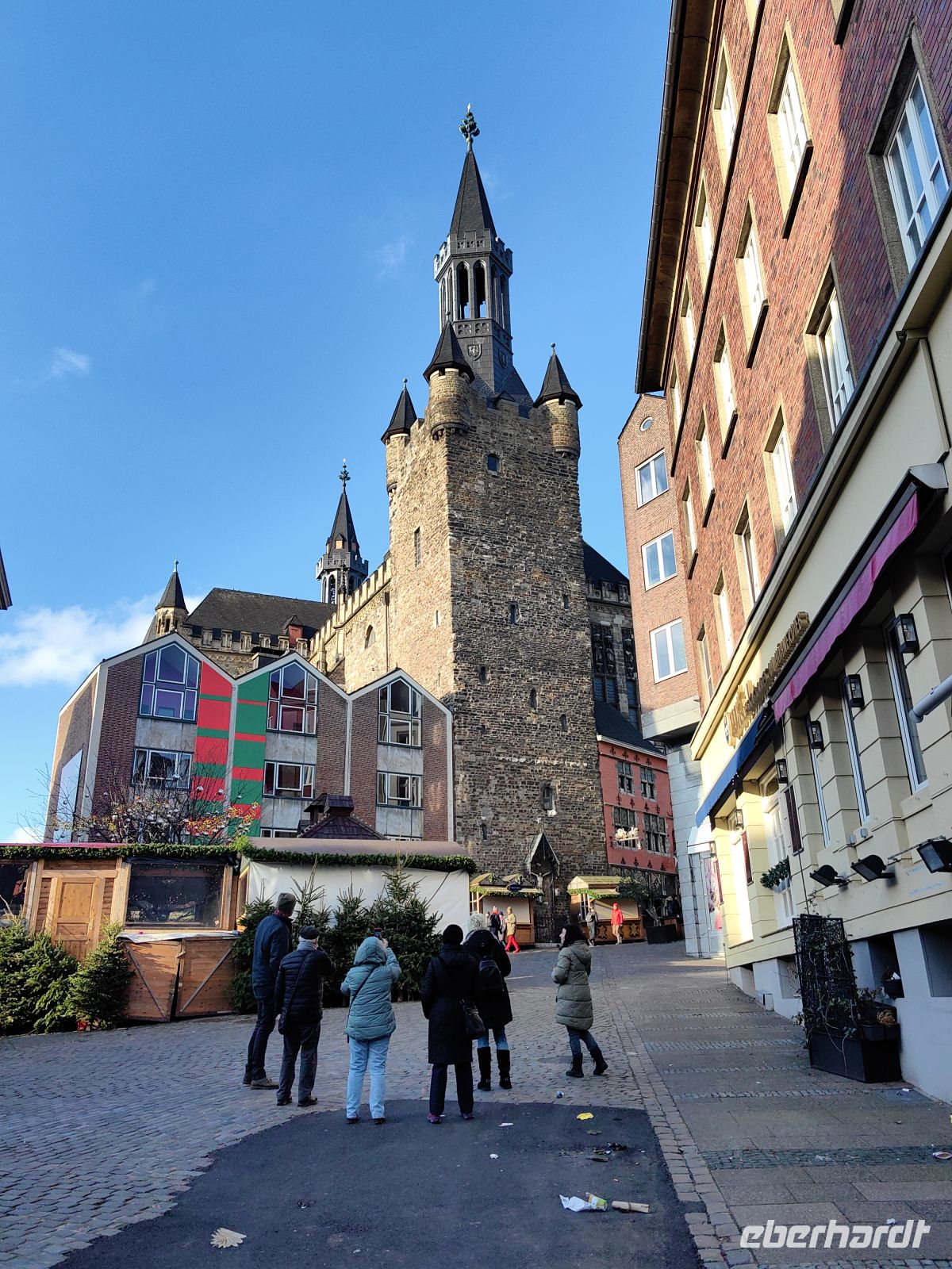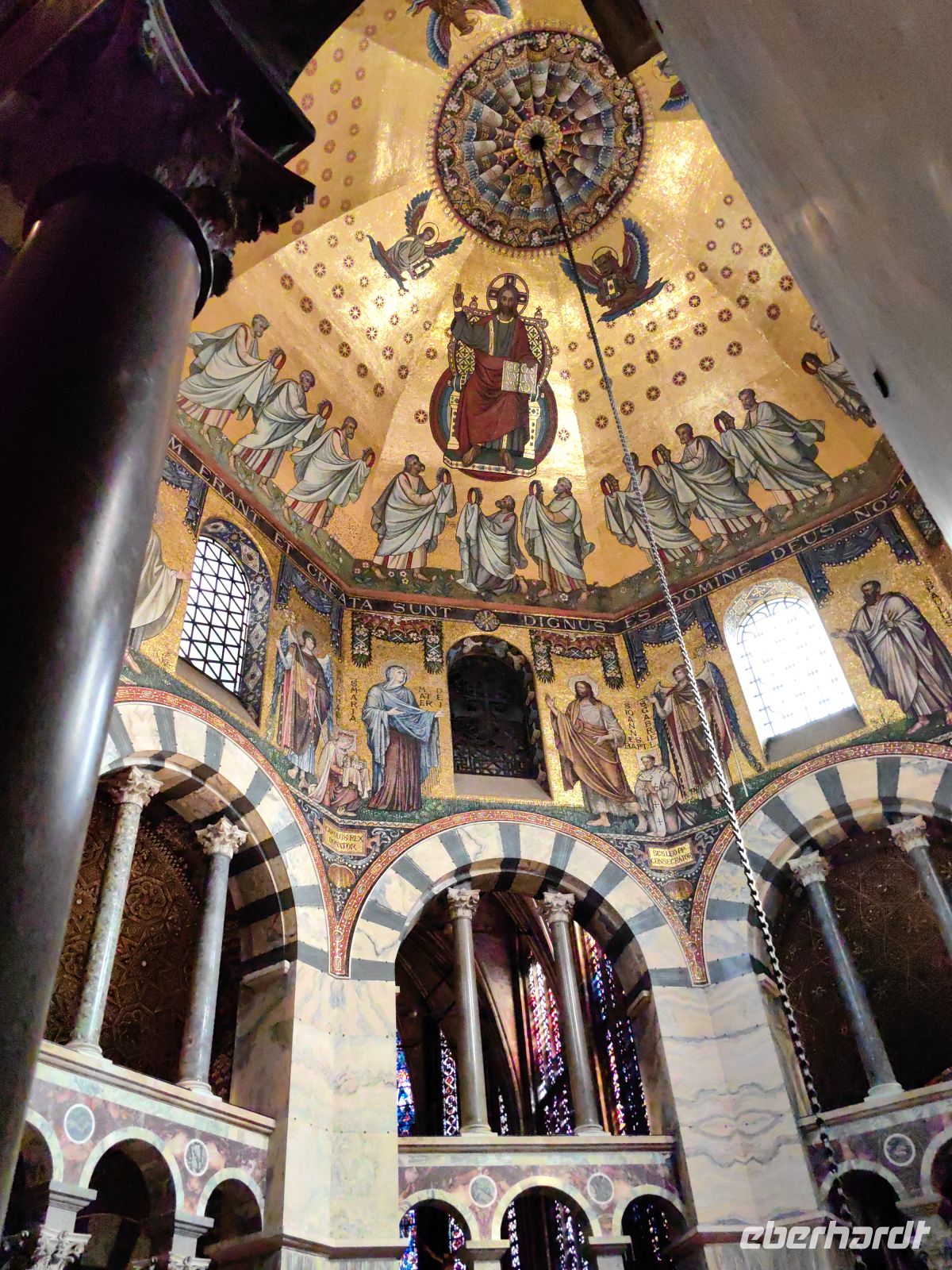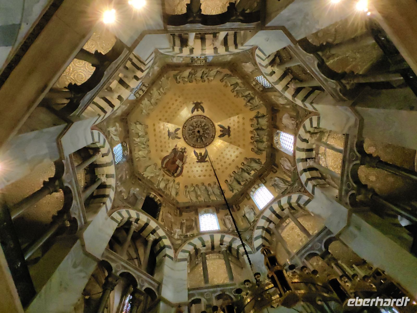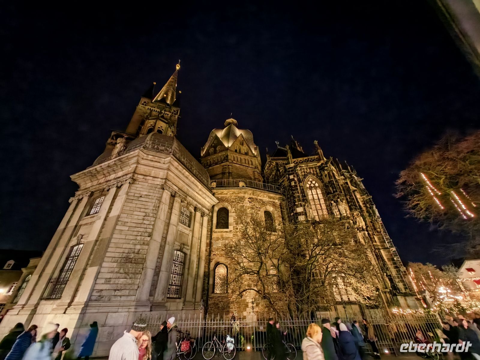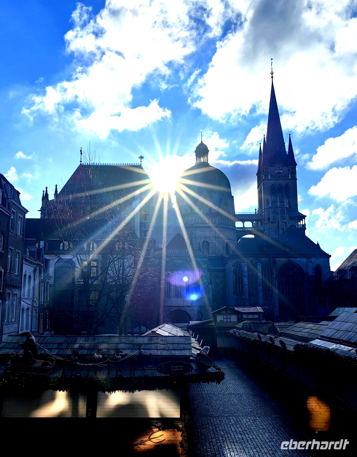 Am Nachmittag erreichen wir unser in der Innenstadt gelegenes Hotel und treffen dort auf die restlichen sechs Gäste, die individuell mit dem Zug oder dem Auto angereist sind. Nachdem wir alle unsere Zimmer bezogen haben, treffen wir uns in der Lobby wieder und machen einen gemeinsamen ersten Abstecher ins Zentrum zum berühmten Dom, in dem seit dem Jahre 813 bis 1531 die deutschen Könige allesamt gekrönt wurden. Von der einstigen karolingischen Pfalz, die Karl der Große zwischen 780 und 804 errichten ließ, sind heute nur noch der Grundriß der Marienkirche und Teile des Granusturms erhalten. Hier wo er einst residierte, genießen wir heute den Duft von Printen, Glühwein, Lichterglanz und den Blick auf den imposanten Dom. Der Weihnachtsmarkt ist allerdings so gut gefüllt, daß an ein gemeinsames Schlendern nicht zu denken ist und so fliehen wir förmlich in den Hof vor dem Dom, lauschen der Teufelslegende und gehen danach in den Dom, der ebenfalls sehr gut besucht ist. Wir bestaunen die neobyzantinischen Mosaiken im Oktagon, schauen uns den Barbarossaleuchter an und werfen einen Blick auf den Marien- und den Karlsschrein. Der einstige Thron von Karl dem Großen läßt sich vom Untergeschoß nur erahnen.
