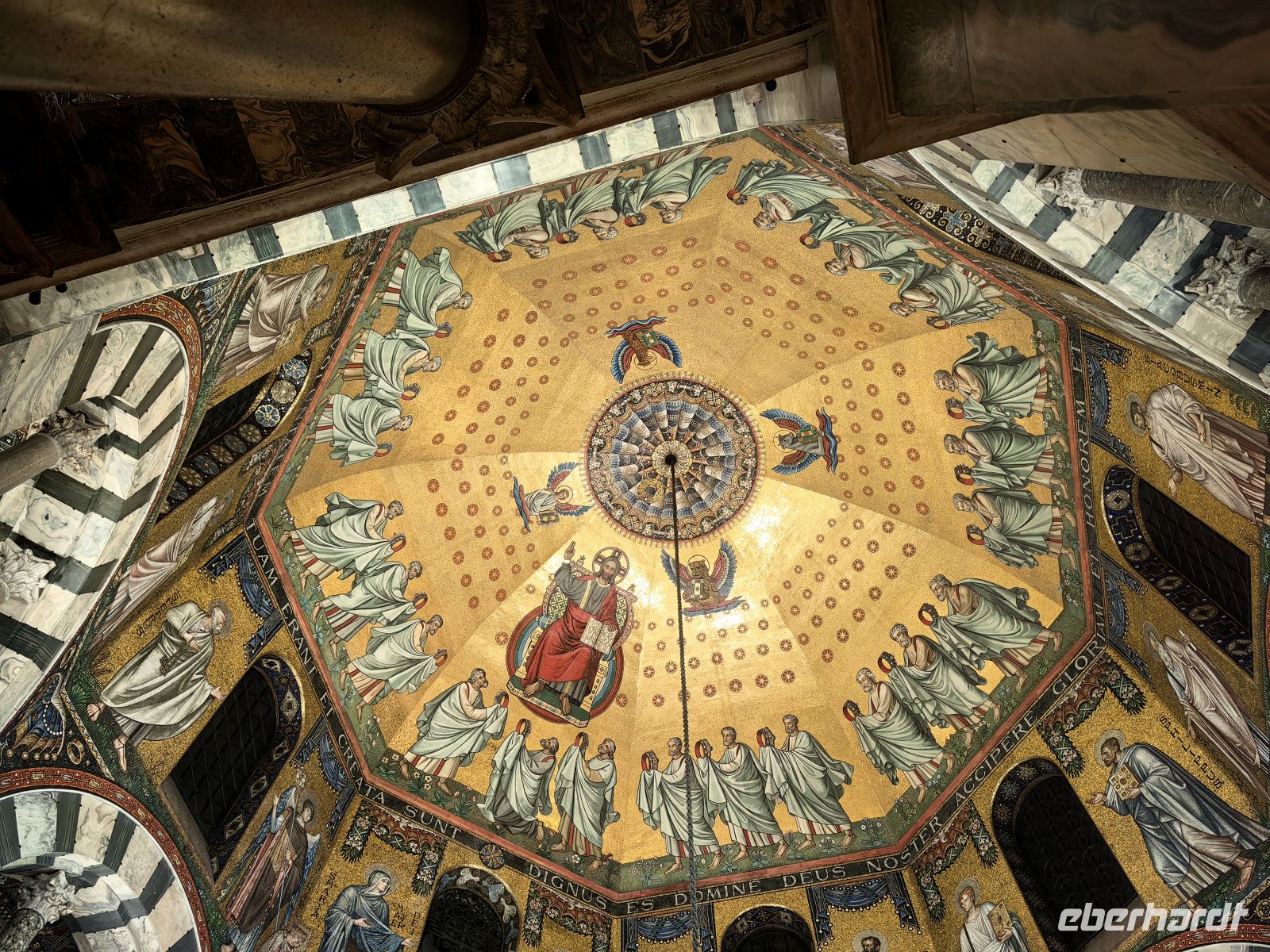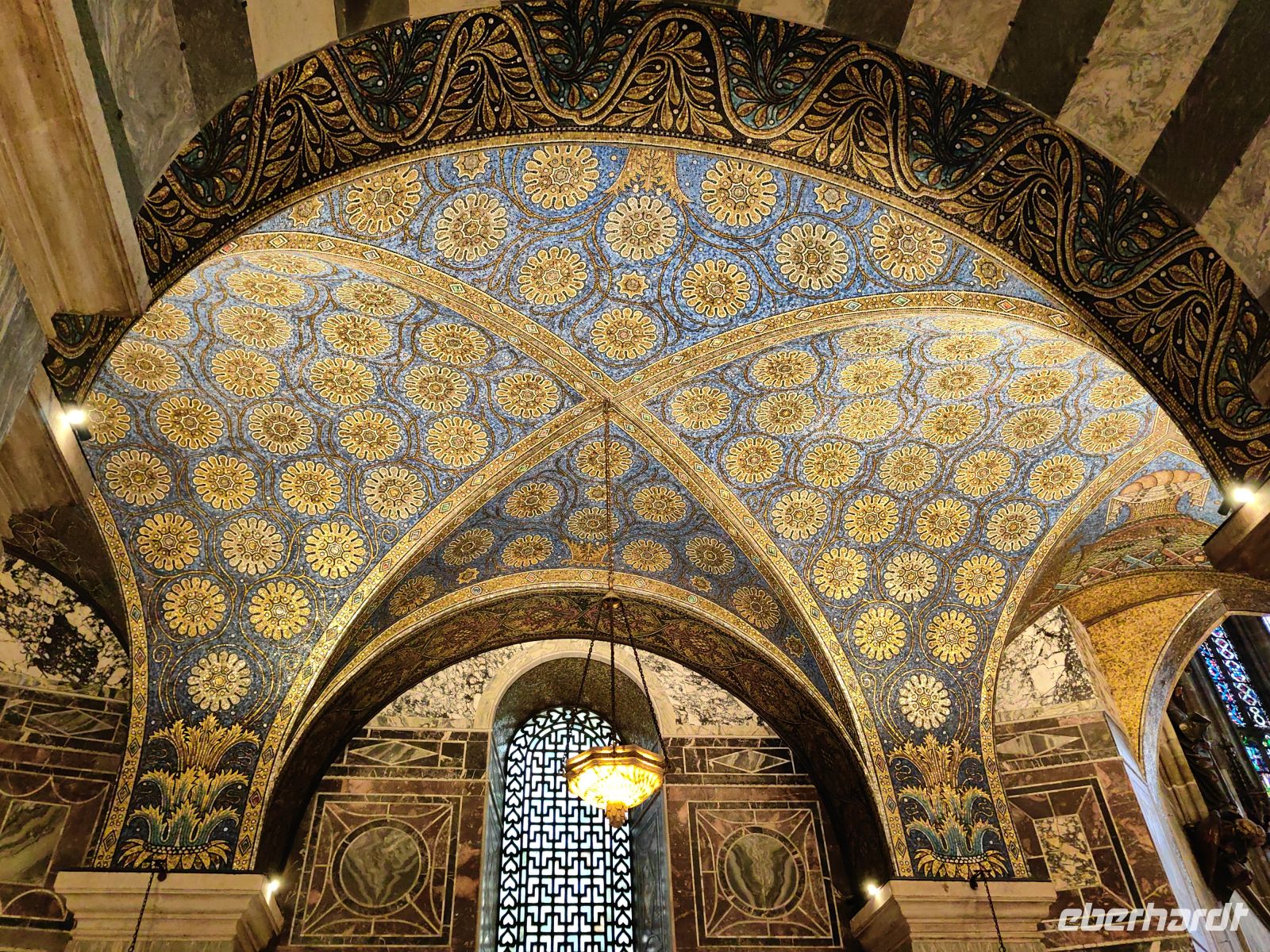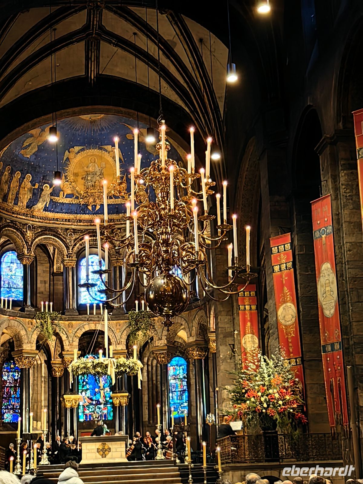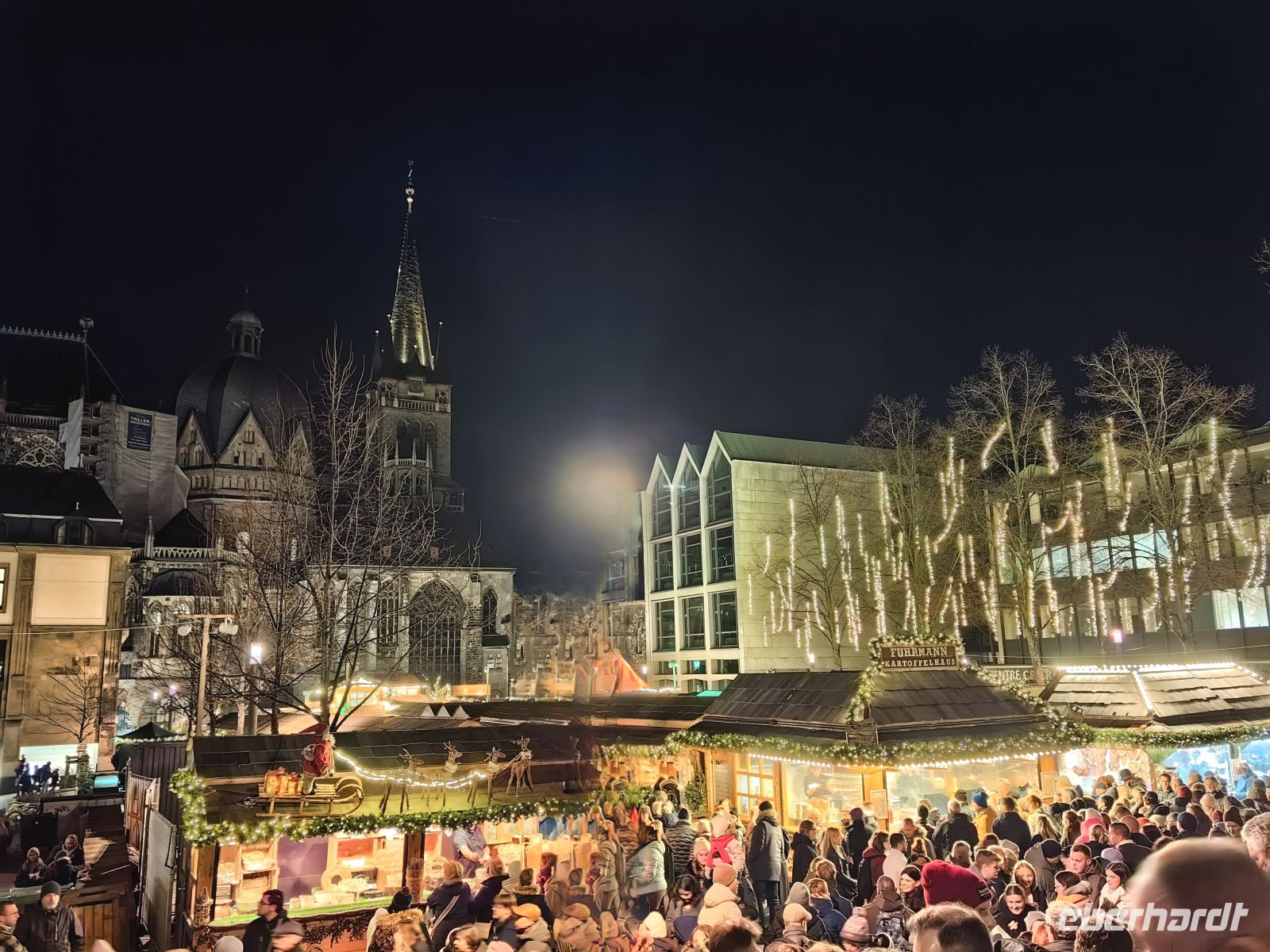 Am Nachmittag erreichen wir unser in der Innenstadt gelegenes Hotel und treffen dort auf die restlichen sechs Gäste, die individuell mit dem Zug oder dem Auto angereist sind. Nachdem wir alle unsere Zimmer bezogen haben, treffen wir uns in der Lobby wieder und machen einen gemeinsamen ersten Abstecher ins Zentrum zum berühmten Dom, in dem seit dem Jahre 813 bis 1531 die deutschen Könige allesamt gekrönt wurden. Von der einstigen karolingischen Pfalz, die Karl der Große zwischen 780 und 804 errichten ließ, sind heute nur noch der Grundriß der Marienkirche und Teile des Granusturms erhalten. Hier wo er einst residierte, genießen wir heute den Duft von Printen, Glühwein, Lichterglanz und den Blick auf den imposanten Dom. Der Weihnachtsmarkt ist allerdings so gut gefüllt, daß an ein gemeinsames Schlendern nicht zu denken ist und so fliehen wir förmlich in den Hof vor dem Dom, lauschen der Teufelslegende und gehen danach in den Dom, der ebenfalls sehr gut besucht ist. Wir bestaunen die neobyzantinischen Mosaiken im Oktagon, schauen uns den Barbarossaleuchter an und werfen einen Blick auf den Marien- und den Karlsschrein. Der einstige Thron von Karl dem Großen läßt sich vom Untergeschoß nur erahnen.
