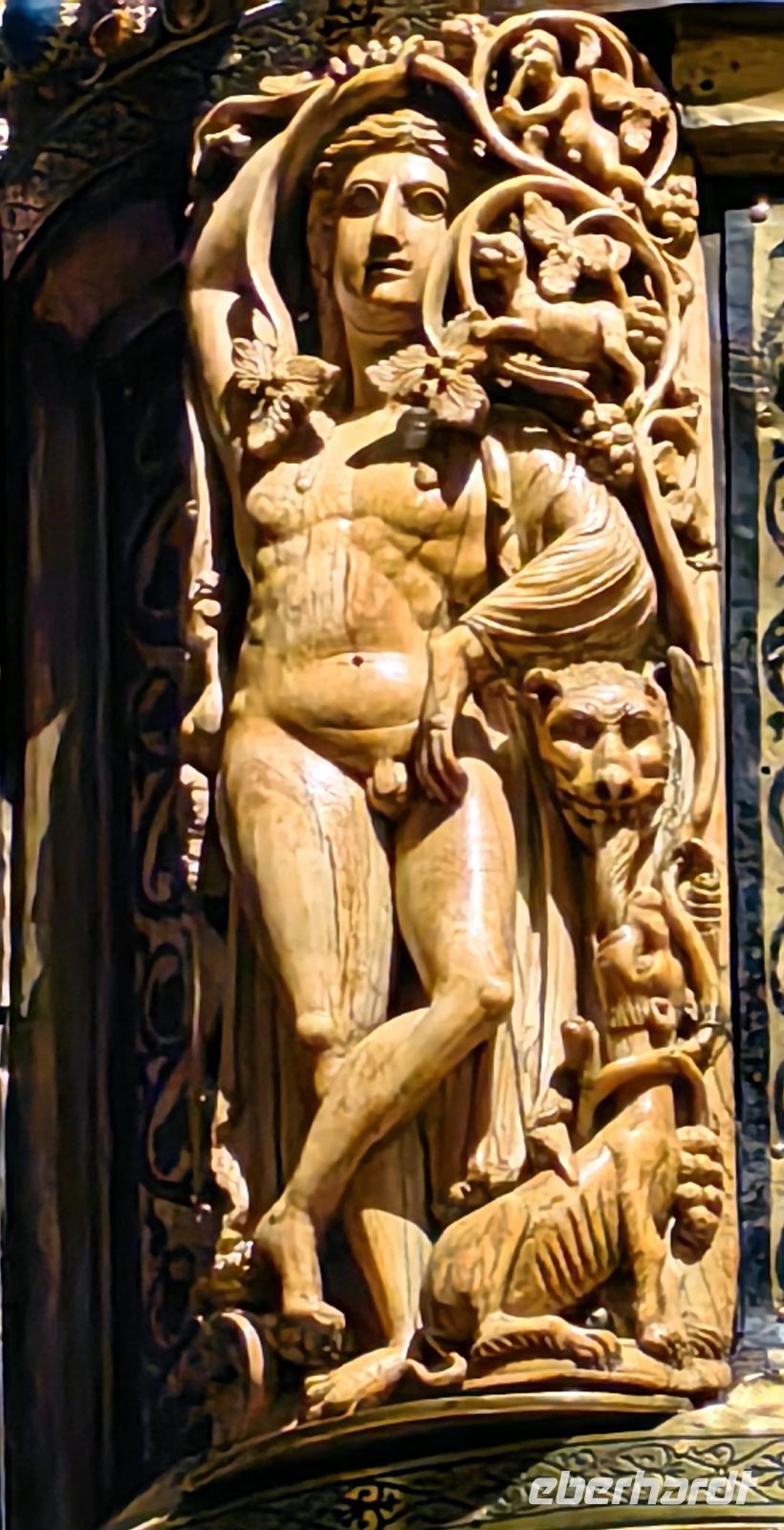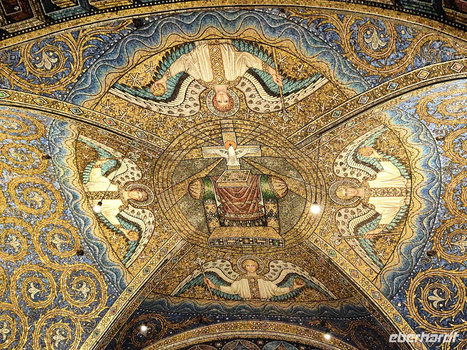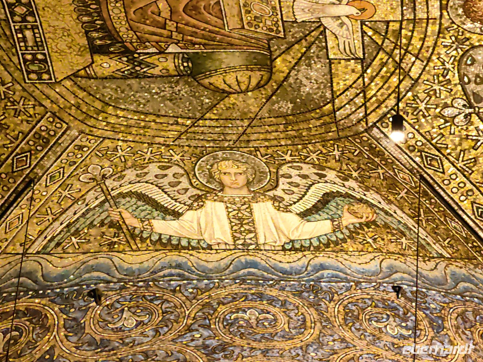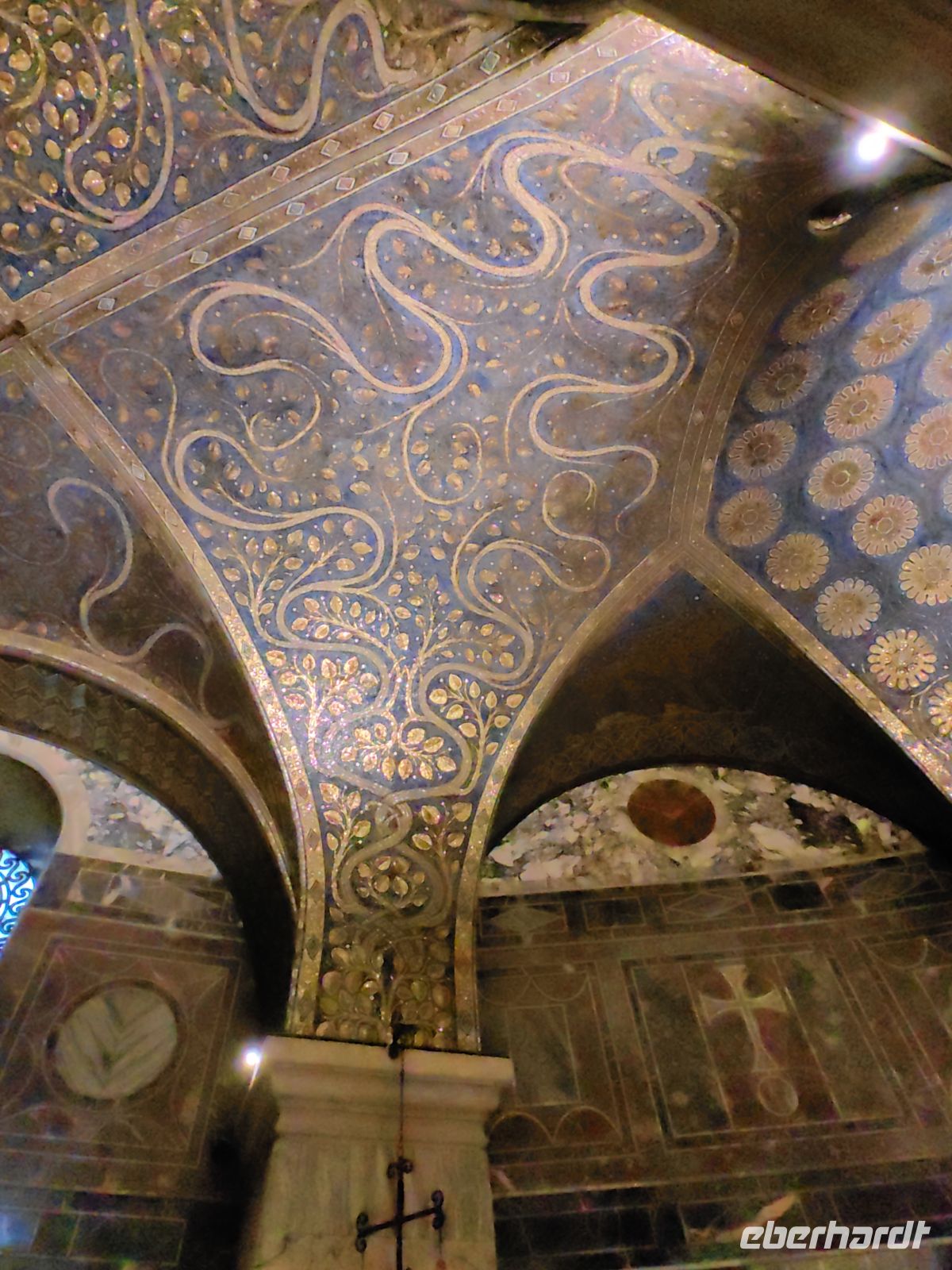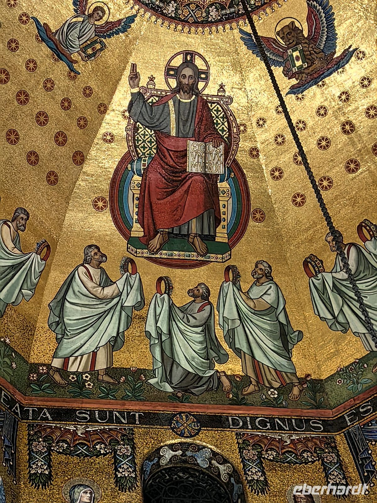 Am Nachmittag erreichen wir unser in der Innenstadt gelegenes Hotel und treffen dort auf die restlichen sechs Gäste, die individuell mit dem Zug oder dem Auto angereist sind. Nachdem wir alle unsere Zimmer bezogen haben, treffen wir uns in der Lobby wieder und machen einen gemeinsamen ersten Abstecher ins Zentrum zum berühmten Dom, in dem seit dem Jahre 813 bis 1531 die deutschen Könige allesamt gekrönt wurden. Von der einstigen karolingischen Pfalz, die Karl der Große zwischen 780 und 804 errichten ließ, sind heute nur noch der Grundriß der Marienkirche und Teile des Granusturms erhalten. Hier wo er einst residierte, genießen wir heute den Duft von Printen, Glühwein, Lichterglanz und den Blick auf den imposanten Dom. Der Weihnachtsmarkt ist allerdings so gut gefüllt, daß an ein gemeinsames Schlendern nicht zu denken ist und so fliehen wir förmlich in den Hof vor dem Dom, lauschen der Teufelslegende und gehen danach in den Dom, der ebenfalls sehr gut besucht ist. Wir bestaunen die neobyzantinischen Mosaiken im Oktagon, schauen uns den Barbarossaleuchter an und werfen einen Blick auf den Marien- und den Karlsschrein. Der einstige Thron von Karl dem Großen läßt sich vom Untergeschoß nur erahnen.