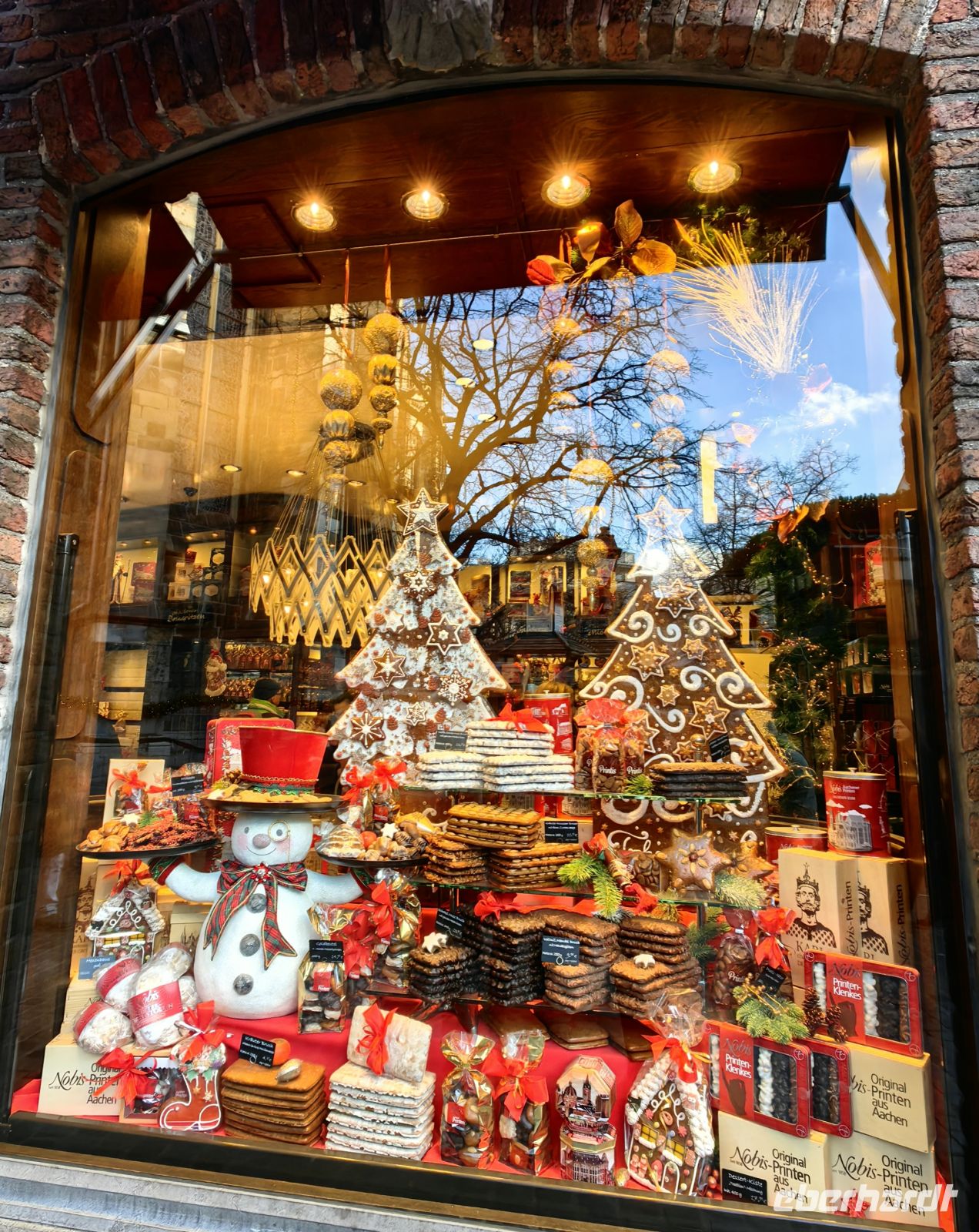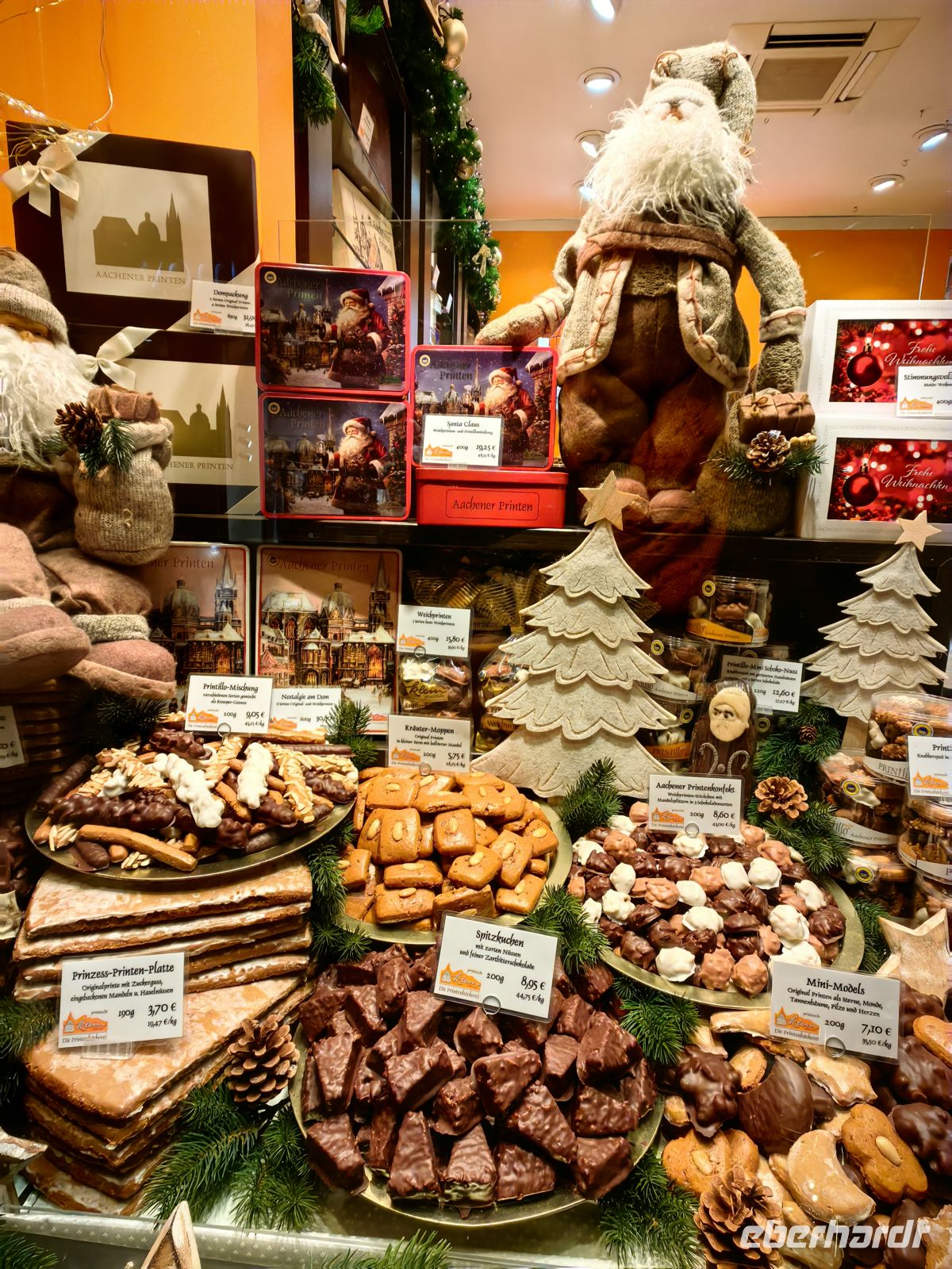 Diese Printen sind eine spezielle Sorte brauner Lebkuchen, die es seit etwa 1820 gibt. Ihr Vorgänger stammt aus Belgien, wo bereits um das Jahr 1000 eine Vorform der Printen hergestellt wurde. Der Teig für dieses sogenannte „Gebildbrot“ wurde zu religiösen Anlässen gebacken und in Gestalt von Tieren, Menschen oder anderen Figuren gepresst. So entstand auch der Name, denn „prent“ bedeutete nichts anderes als Bild oder Abdruck. Erst zwischen dem 16. und 17. Jahrhundert brachten zugewanderte Belgier Teig und Formen mit nach Aachen. Zur damaligen Zeit wurde der Teig ohne Fett und ohne Eier hergestellt und war knochenhart. Napoleon verdanken wir die heutige weichere Variante. Er verhängte 1806 eine Wirtschaftsblockade gegen England und der vorher von dort eingeführte Wildblütenhonig und der Rohrzucker waren nun nicht mehr erhältlich. So kam es, dass die Aachener Bäcker mit Rübensaft und Rübenzucker improvisieren mußten. Es soll der Traditionsbäcker Lambertz gewesen sein, der schließlich die richtige Mischung entwickelte und 1820 die erste echte Kräuterprinte herstellte. Diese viel weichere und zähere Teigmischung konnte man zwar nicht mehr in Formen pressen, sie eignete sich jedoch besser zur fabrikmäßigen Produktion und in Stücke geschnitten konnten diese Variante leichter verkauft und sogar verschickt werden und der Siegeszug der Aachener Printe begann weit über ihre Stadtgrenzen hinaus. Wurde sie früher nur zur Weihnachtszeit produziert, findet man sie heute ganzjährig in fast jeder Bäckerei in und um Aachen und wir verkosten nach unserer Stadtführung ein paar Sorten und nehmen natürlich für die Daheimgebliebenen auch welche mit.