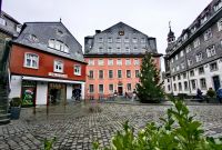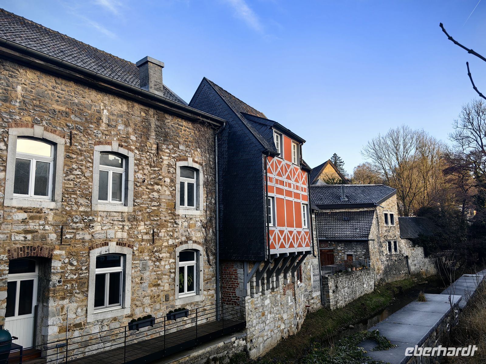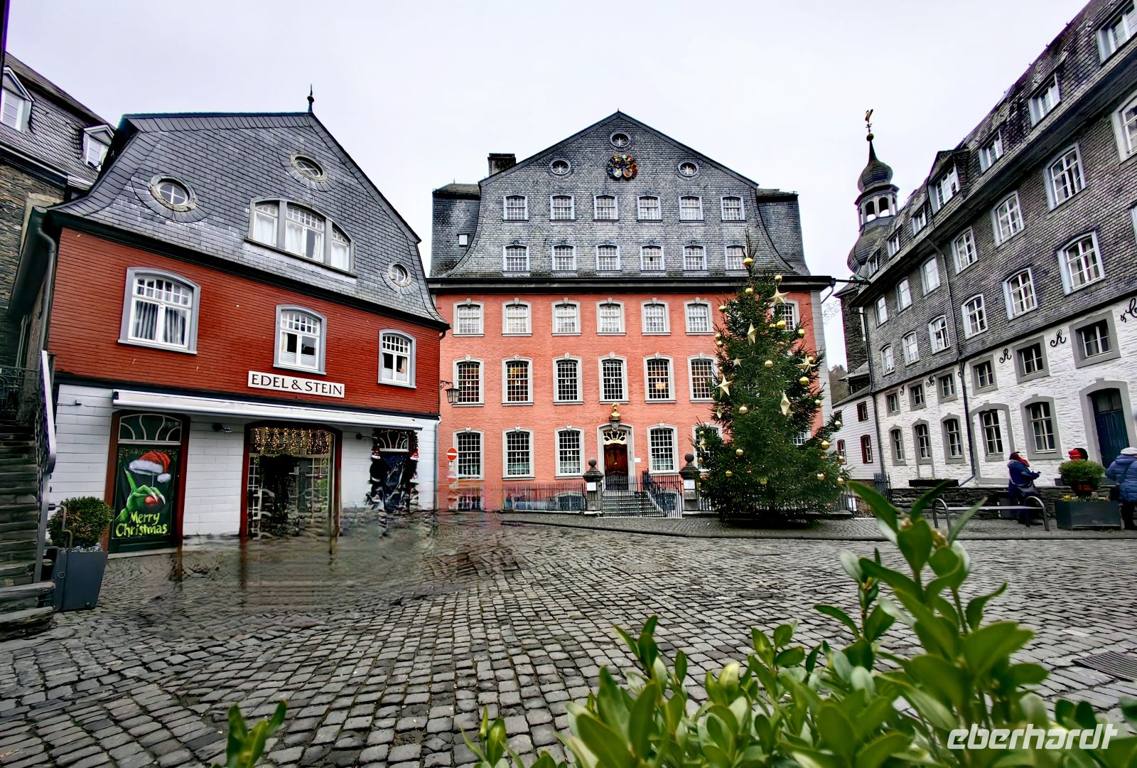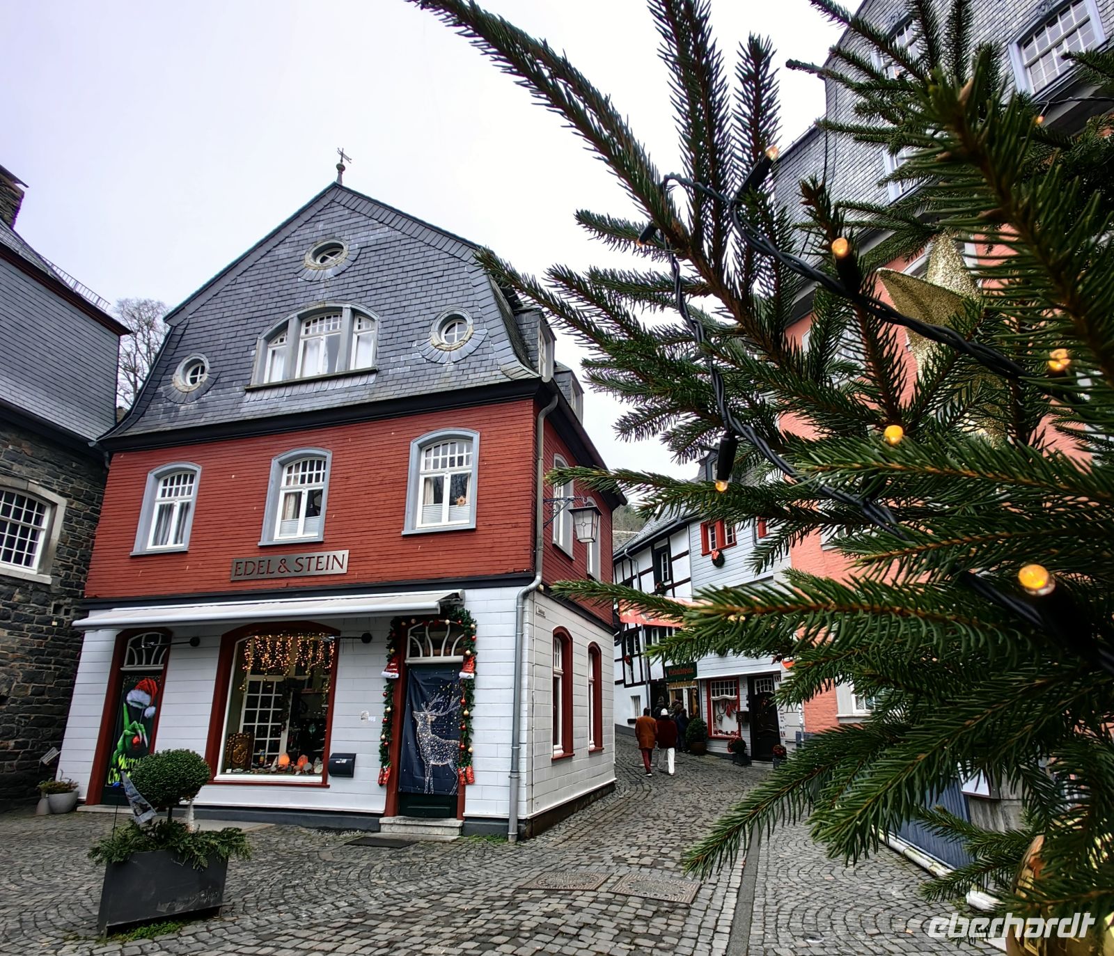 Wir erfahren viele Geschichten und Anekdoten, die alle eng mit der Tuchherstellung und Textilindustrie verbunden sind. Andächtig verweilen wir vor dem Roten Haus in Monschau, welches dem Kaufmann Johann Scheibler gehörte, dem es gelang, das aufwendig hergestellte Monschauer Tuch zu einem hochwertigen Luxusartikel zu machen und es danach europaweit zu vermarkten. Nachdem diese Vermarktung geglückt und Herr Scheibler reich geworden war, ließ er sich 1760 ein repräsentatives Wohnhaus errichten, welches ebenfalls als Handelszentrale und Kontor, Lager und Wollwäsche genutzt wurde. Heute befindet sich ein Museum mit 13 vollständig original eingerichteten Wohnräumen darin, zu Weihnachten ist es allerdings geschlossen und wir können die Pracht nur von außen bestaunen.