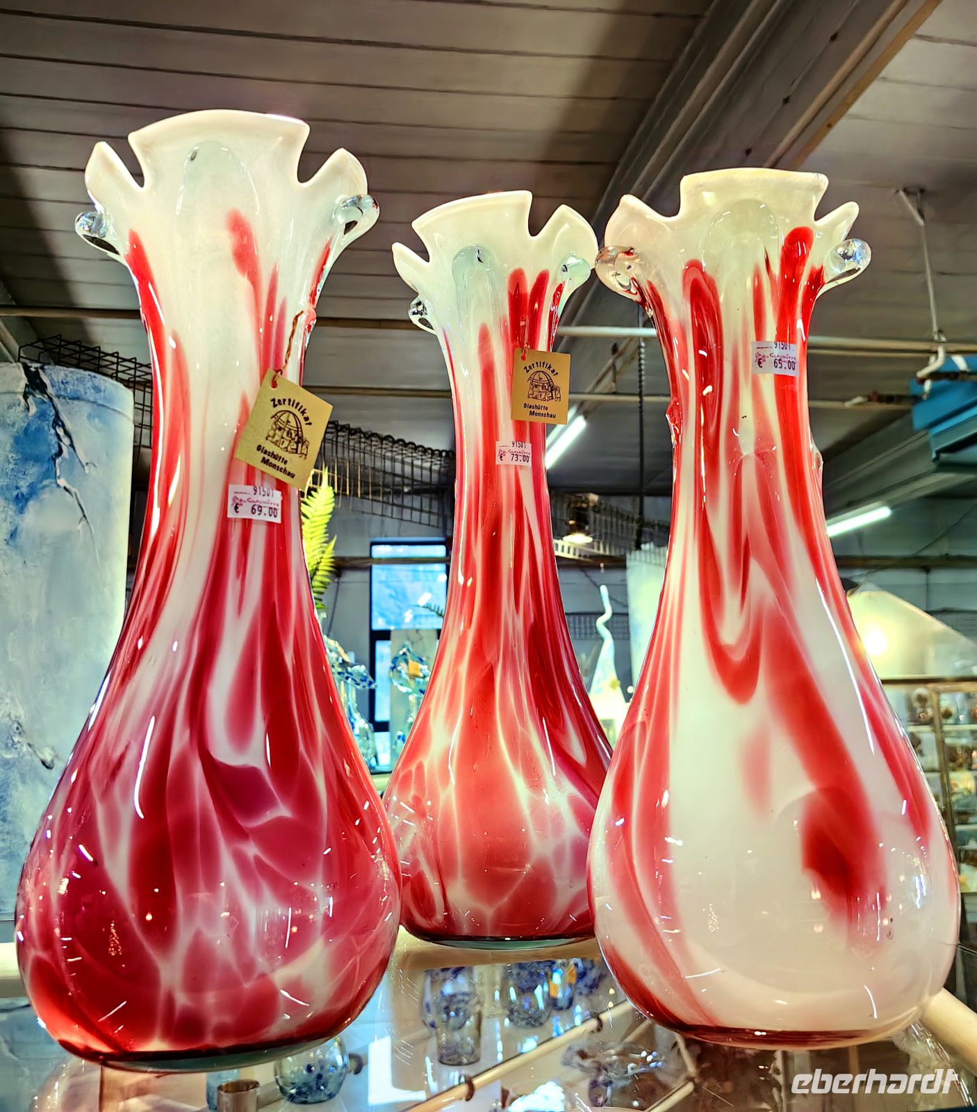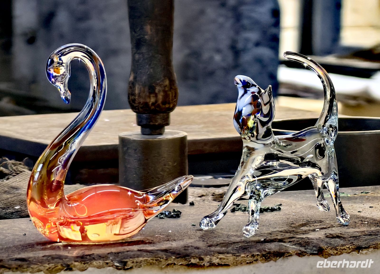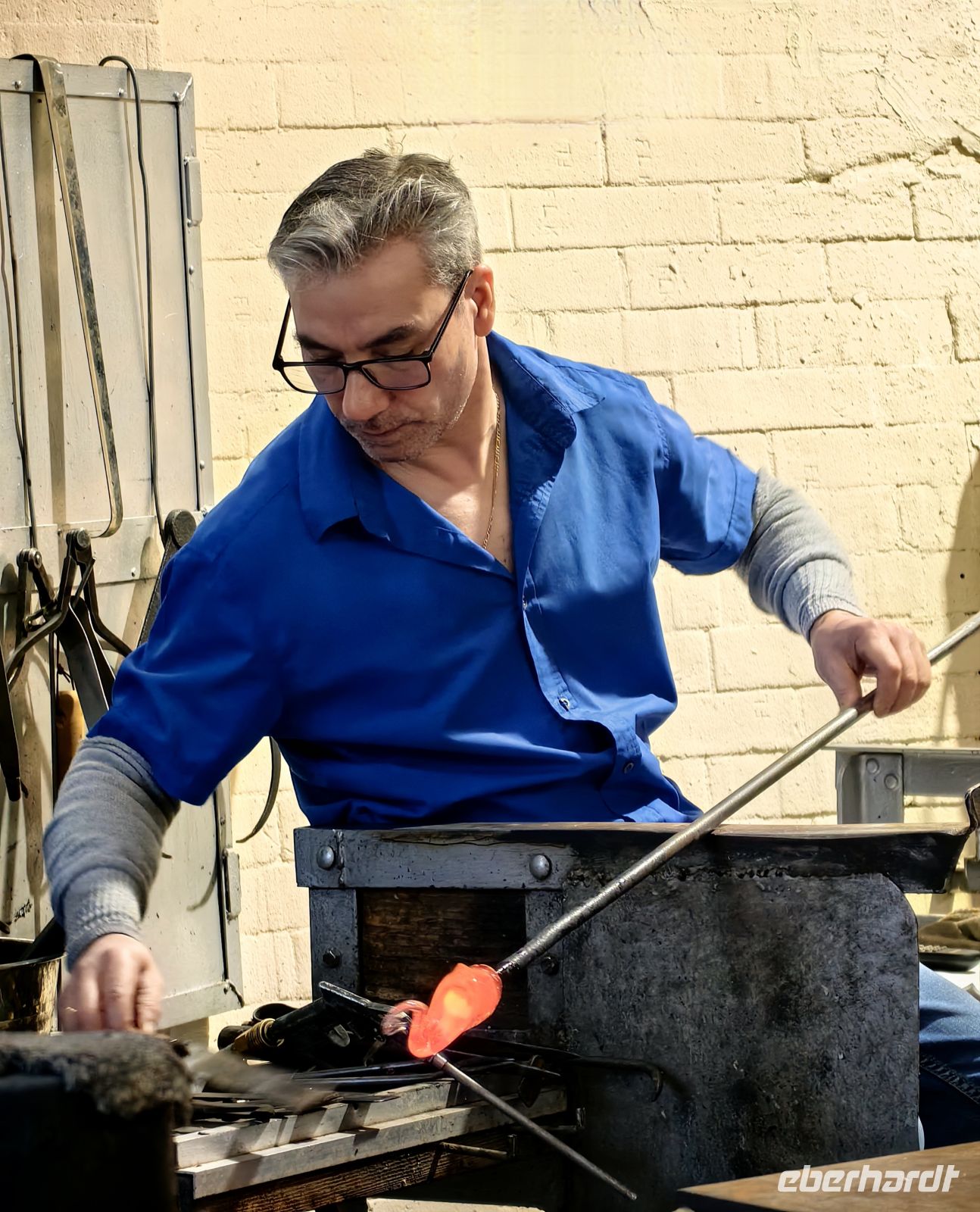 Nachdem wir alle ein wenig ausgeruht und gefrühstückt haben, brechen wir in Richtung Süden auf. Unser Ziel ist das kleine Örtchen Monschau in der Nordeifel. Nach etwa einer Fahrstunde erreichen wir unseren ersten Halt an der Glashütte in Burgau. Hier wird noch mit dem Mund Glas geblasen und wir dürfen miterleben, wie aus einer glühenden Masse, bestehend aus Sand, Pottasche und Kalk, durch geschicktes Ziehen, Kneifen und Falten kleine Katzen und Schwäne, geschwungene mehrfarbige Vasen und wunderschöne Obstschalen entstehen. Der portugiesische Glasbläser ist ein wahrer Meister und wir können es gar nicht fassen, mit welcher Schnelligkeit und vor allem mit wieviel handwerklichem Geschick diese Kunstwerke entstehen. Ein Gast darf sich sogar selbst eine Vase blasen und natürlich mitnehmen.
