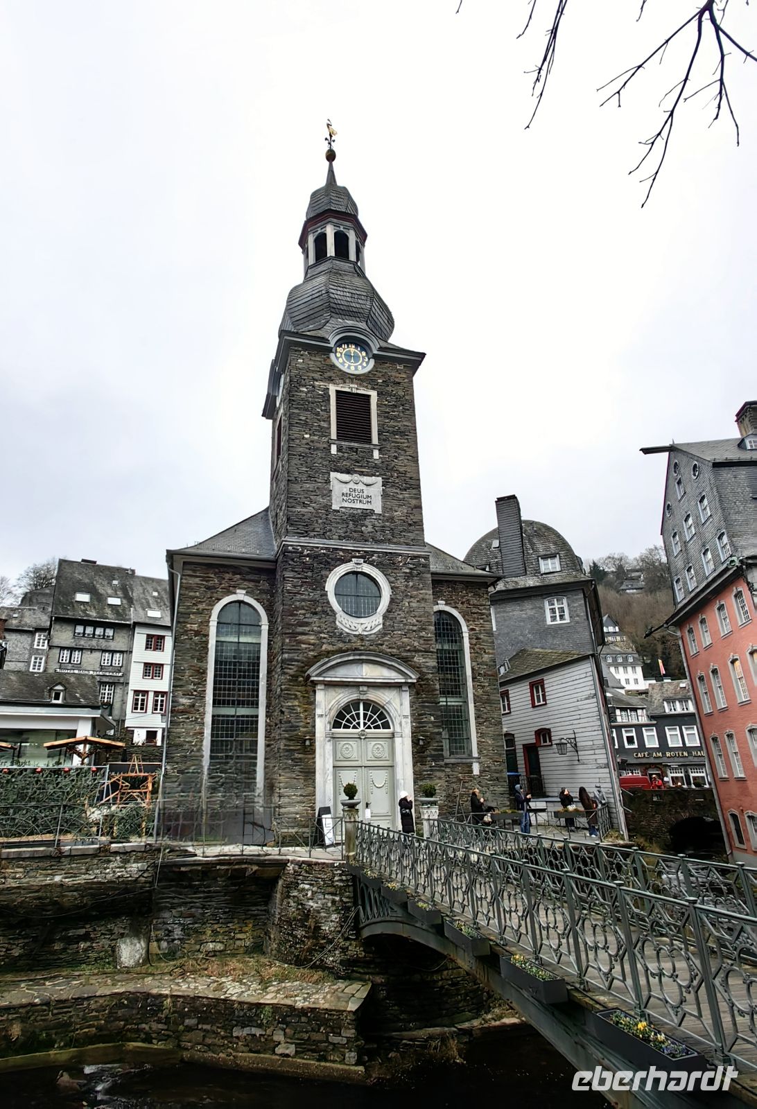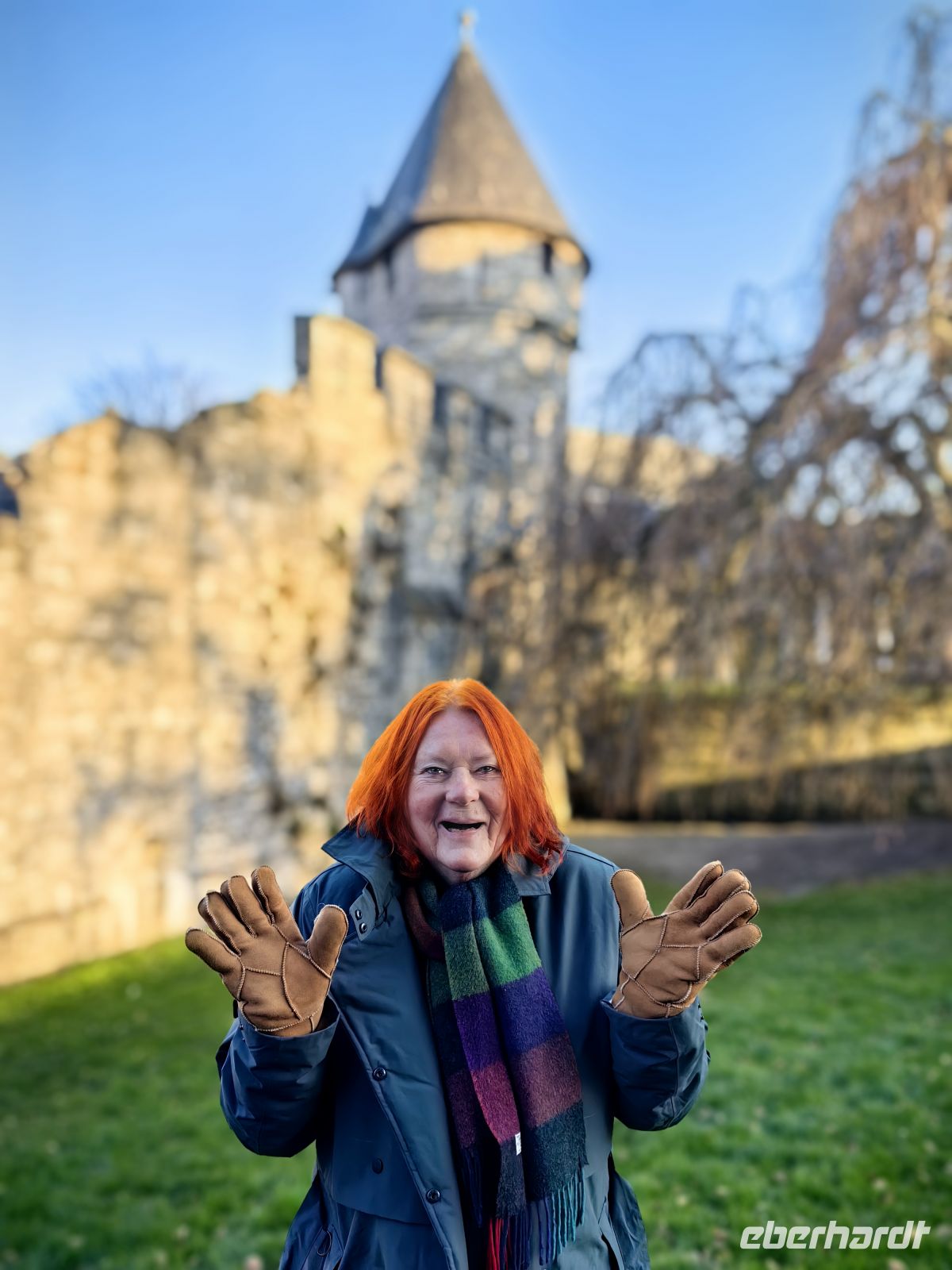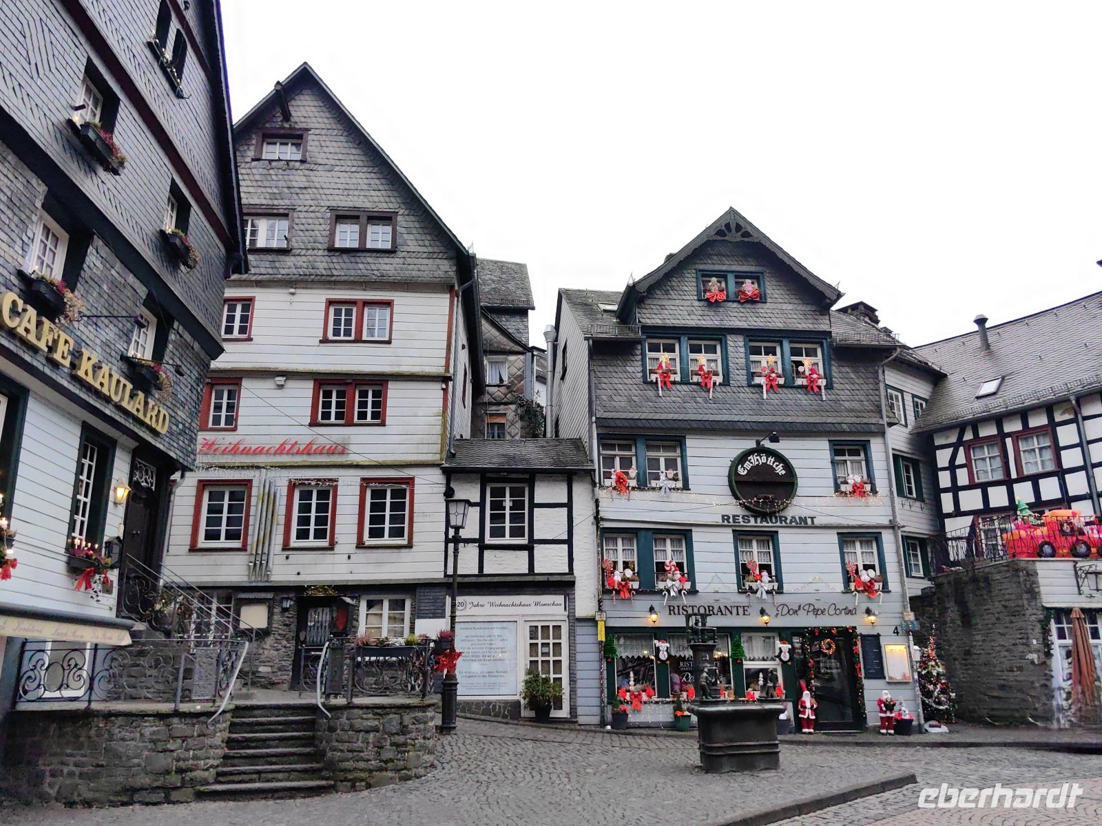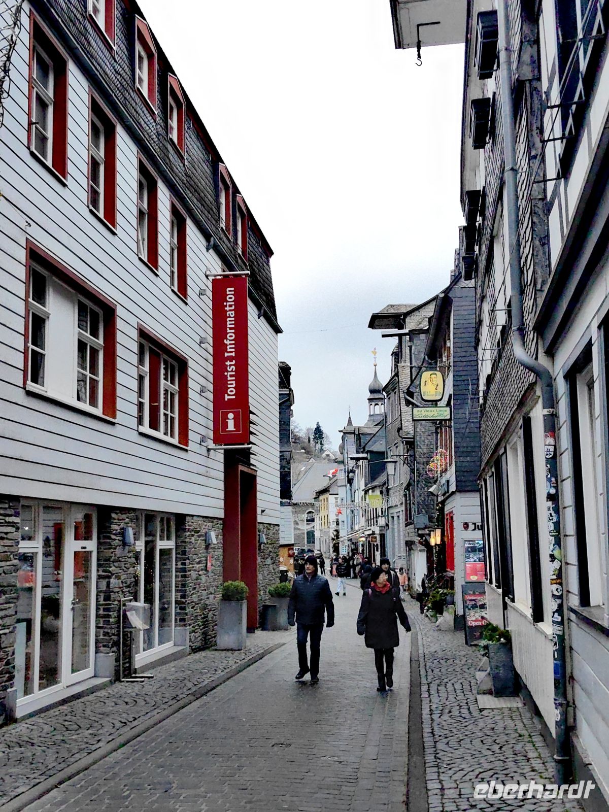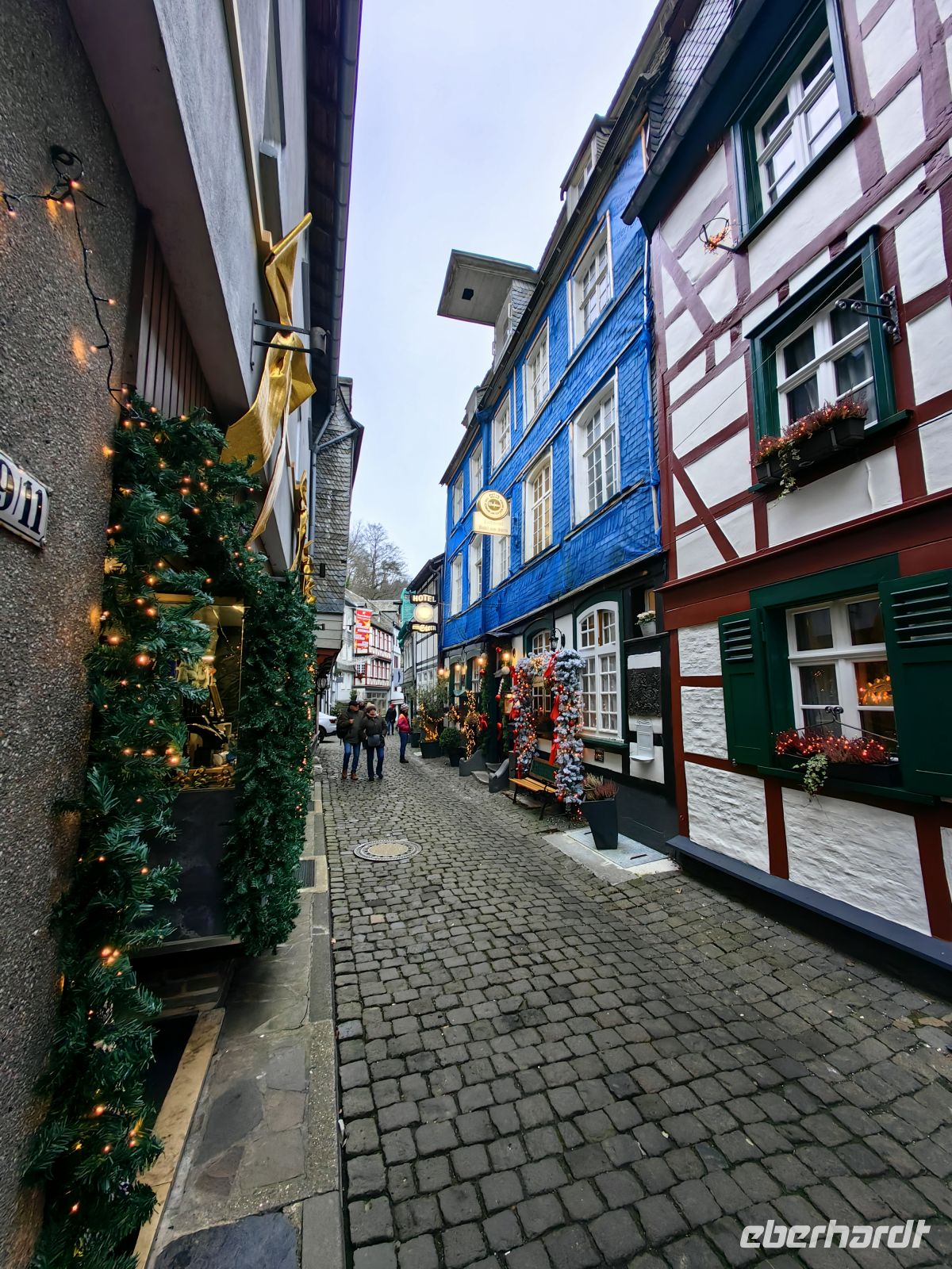 Wir schauen uns im angrenzenden Verkaufsraum ein wenig um, einige kaufen ein gläsernes Souvenir und am Bus wartet bereits unser heutiger Stadtführer Frank auf uns, der uns auf einen Spaziergang durch die von wunderschönen Fachwerkhäusern gesäumten Gassen von Monschau mitnimmt.