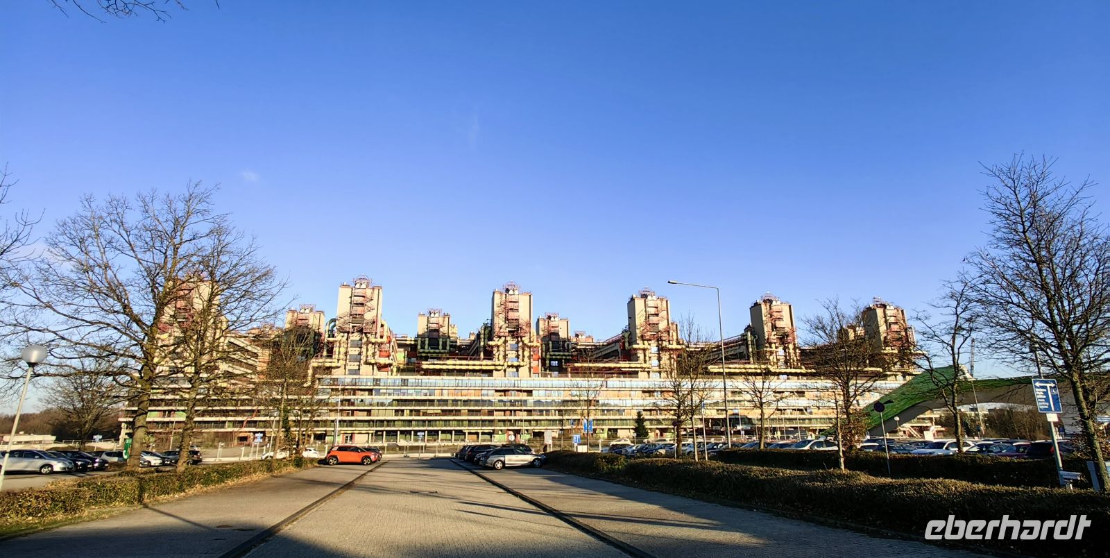 Wir drehen eine Runde um das futuristisch aussehende Uniklinikum RWTH, es ist eines der größten Krankenhausgebäude Europas und beschäftigt immerhin 9.000 Mitarbeiter. Der Hubschrauberlandeplatz vor dem Krankenhaus sieht aus wie eine Landestation für Außerirdische.
