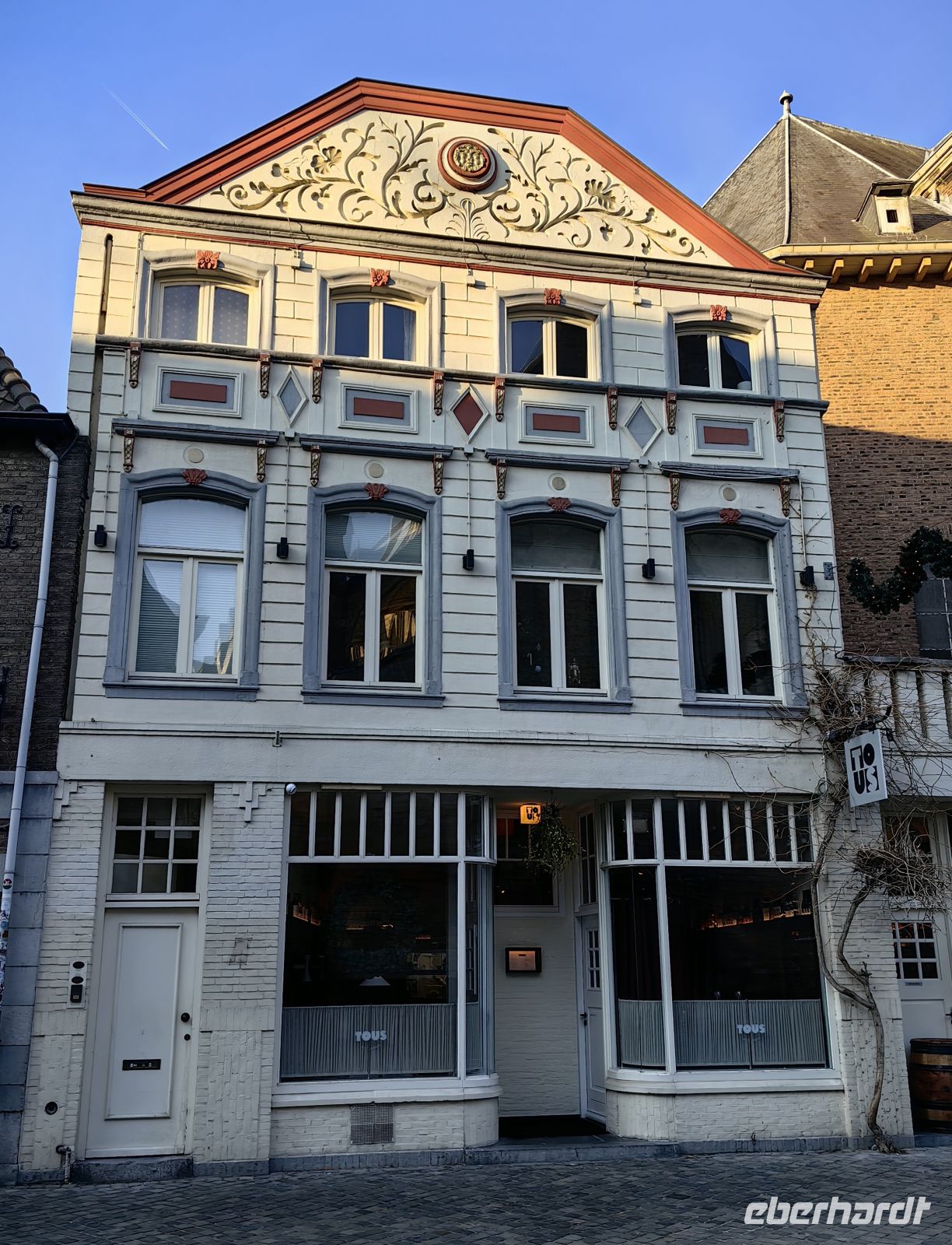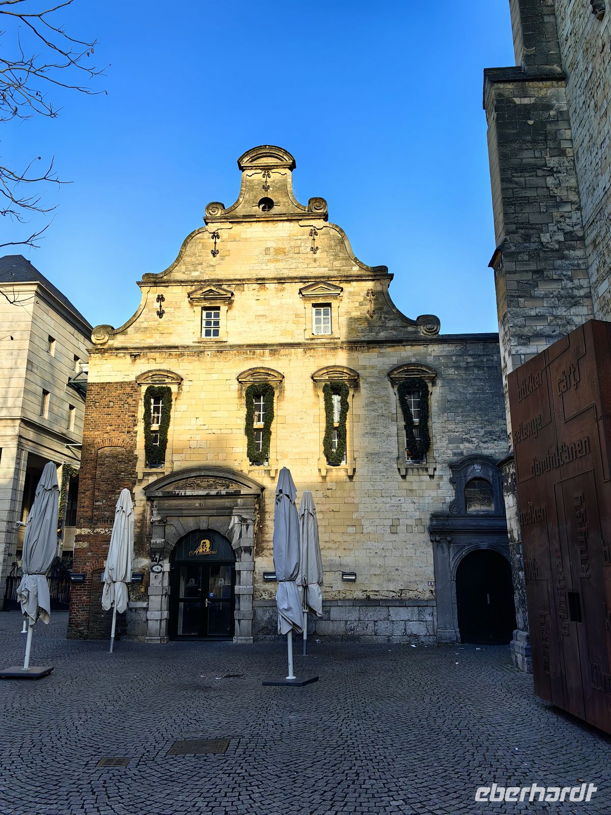 Wir erwärmen uns bei einem Kaffee am Vritjof und spazieren danach noch zum Rathaus auf dem Marktplatz, auf dem im Sommer regelmäßig der Wochenmarkt mit seinen Angeboten lockt. Zur Mittagszeit füllen sich die engen Gassen langsam mit Menschen und auf dem Weihnachtsmarkt verabschieden wir uns von unseren beiden Reiseführern und nutzen die anschließende Freizeit für eigene Erkundungen. Einige Gäste probieren die regionale Spezialität Maastrichs, den Limburger Vlaai, einen Hefeteigkuchen mit einer Füllung aus angedicktem Fruchtkompott mit Schlagsahne. Nicht ganz kalorienarm, aber Weihnachten wollen wir an so etwas gar nicht denken.