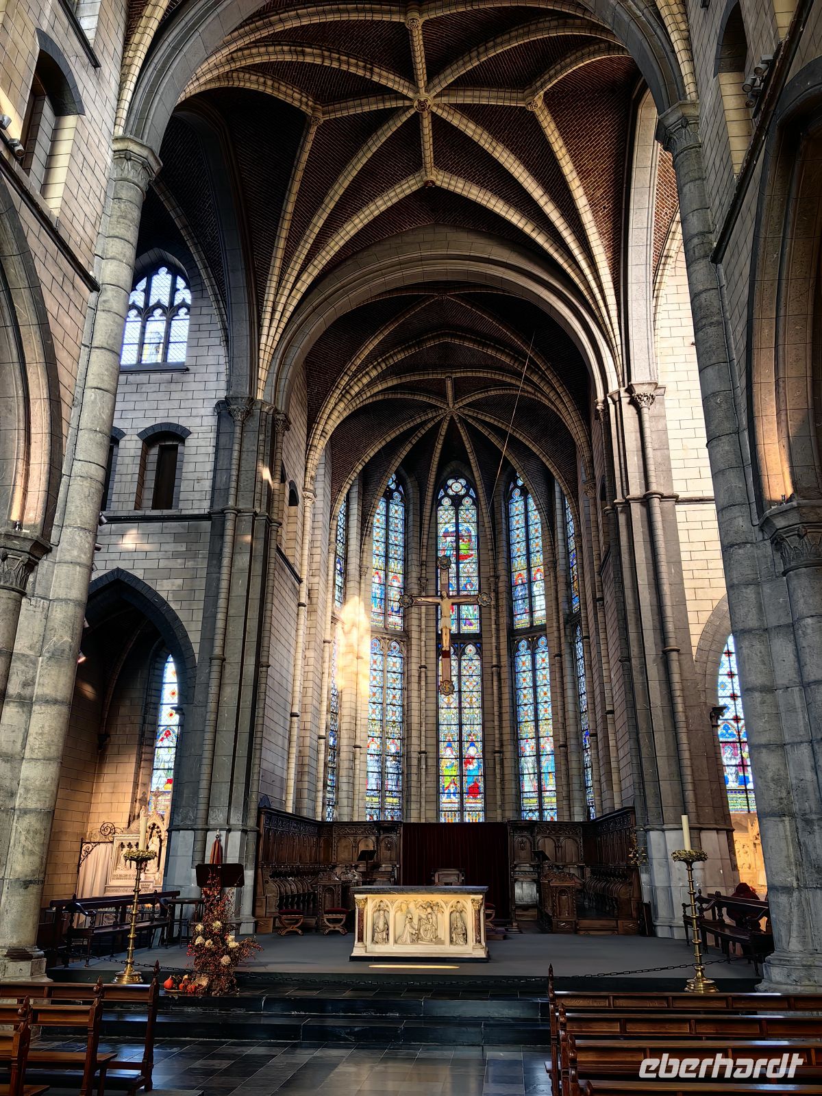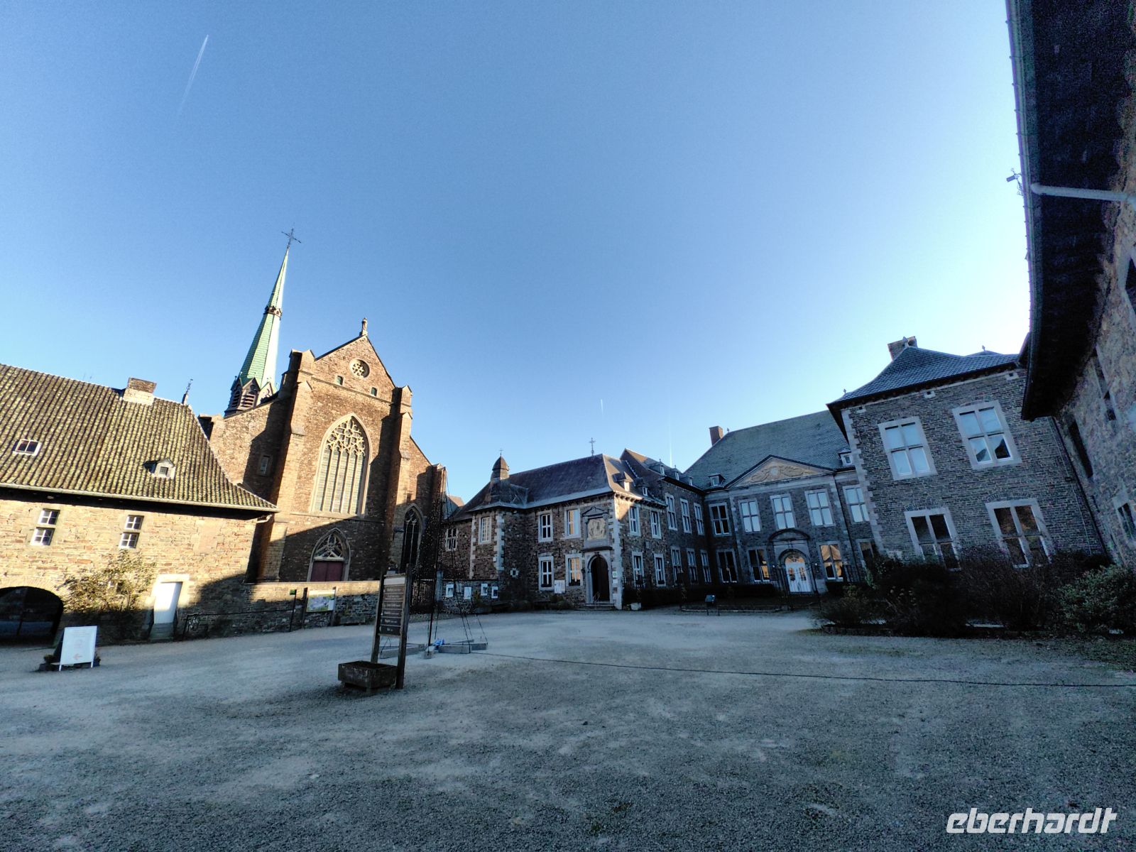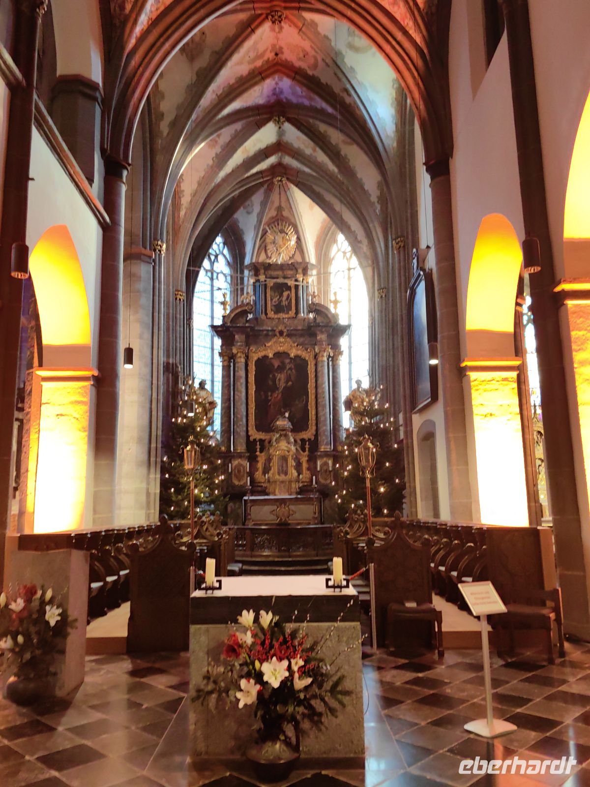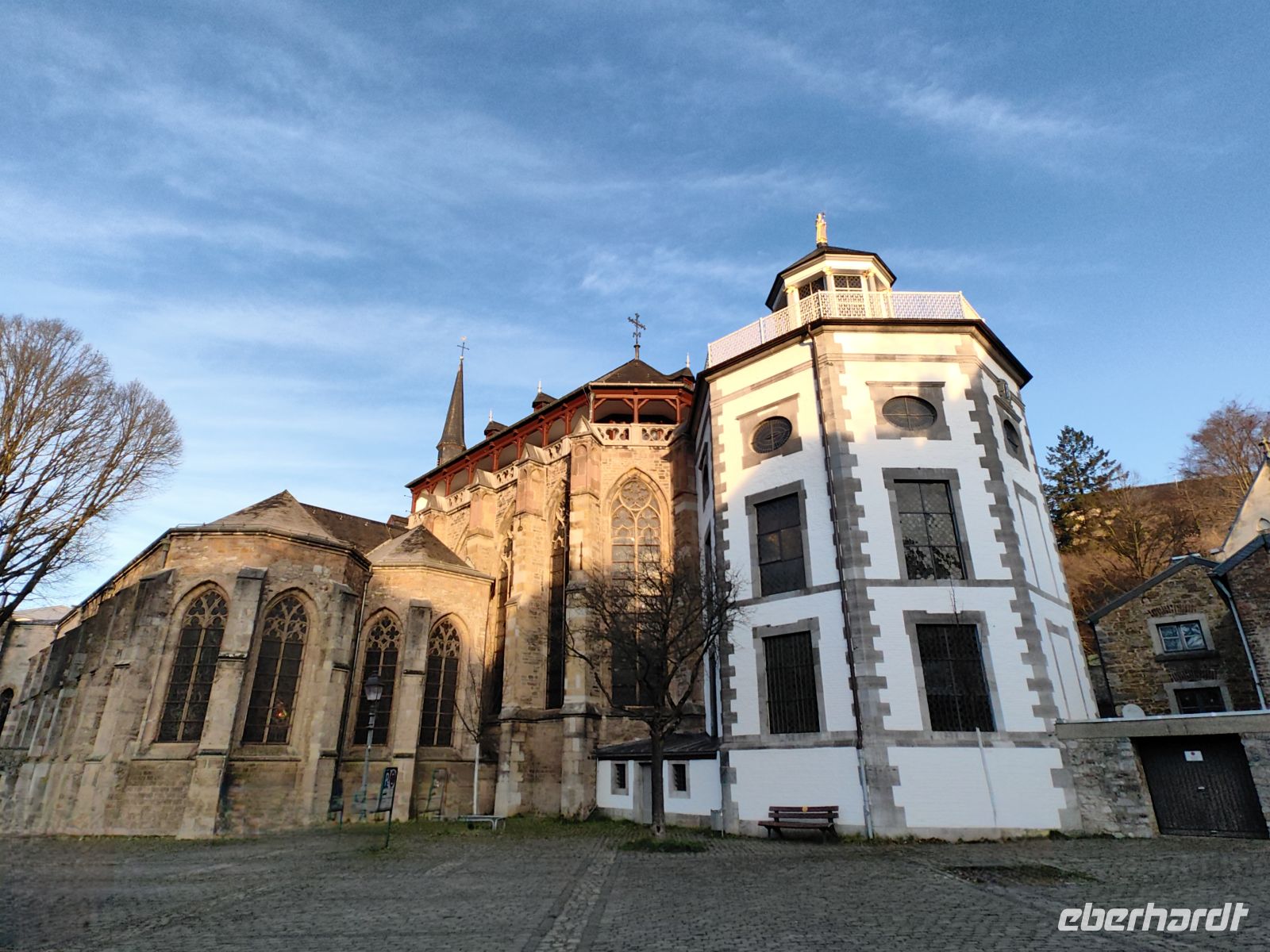 Wir fahren durch eine leicht hügelige offene Landschaft mit vereinzelten Baumbeständen, die Sonne taucht alles in gleißendes Licht und wenn wir nicht sehen würden, daß das Busthermometer minus zwei Grad anzeigt, würden wir denken, es sei ein sonniger Maitag. Unseren ersten Halt machen wir in Kornelimünster. Wir überqueren die kleine Inde, die um das Städtchen herum fließt und stehen sogleich vor der Kirche Sankt Kornelius. An der Stelle wurde bereits 814 von einem Nachfolger Karls des Großen ein Kloster gegründet. Da man in der Mitte des 9. Jahrhunderts wichtige Reliquien wie beispielsweise das Grabtuch Jesu erhielt, entwickelte sich dieses Kloster zu einem wichtigen Pilgerziel. 1802 fiel das Gebiet an Frankreich, die Mönche mußten das Kloster verlassen und erst 1906, als die Anlage an Preußen ging, fanden sich erneut Mönche, die hierher kamen.