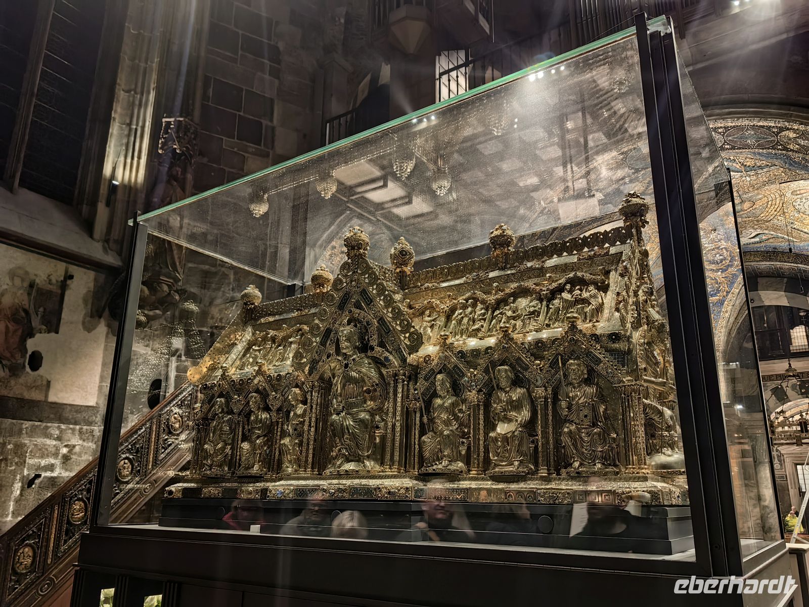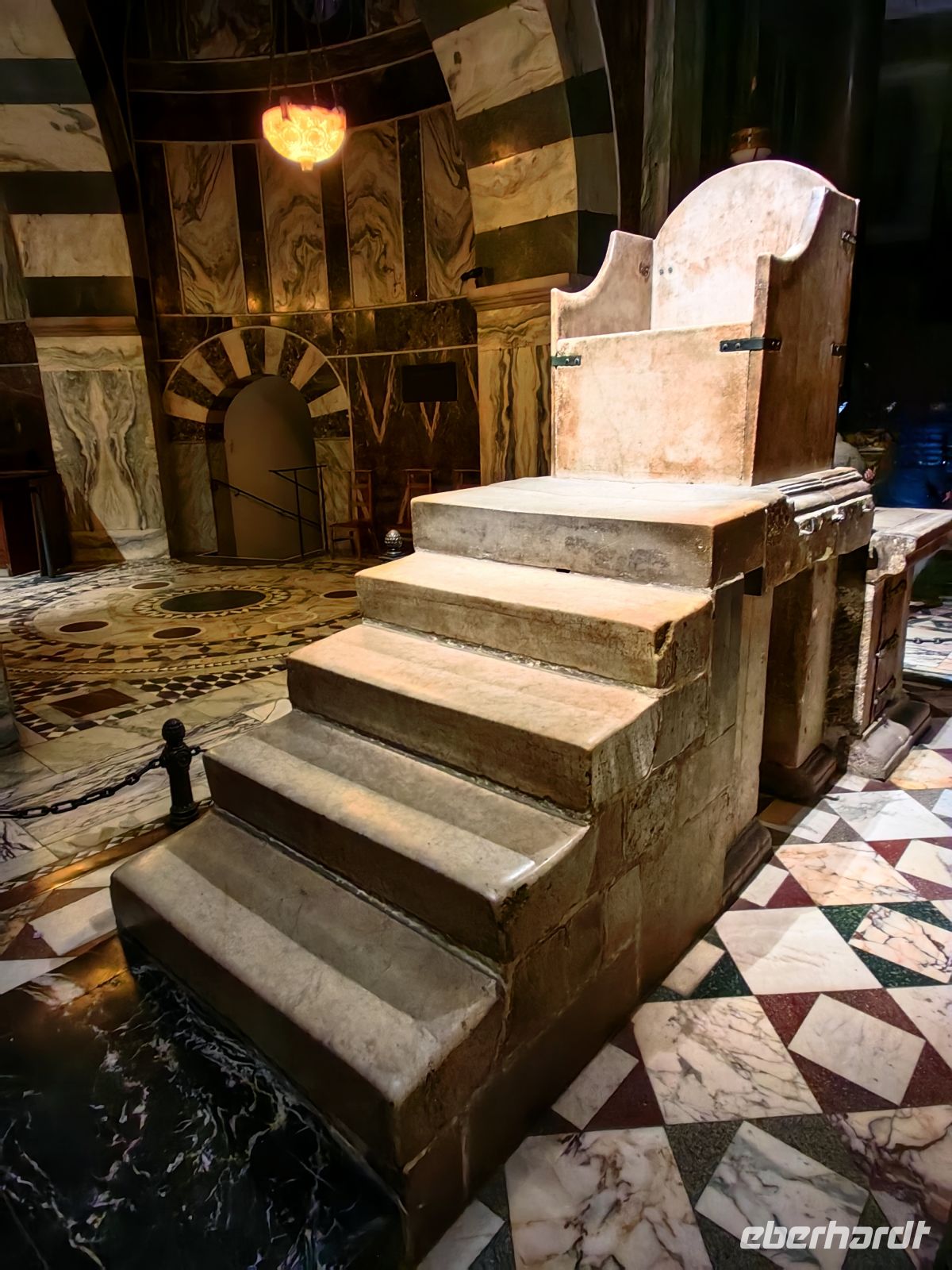 Zwei junge Studenten nehmen uns mit, zeigen uns die berühmte Heinrichskanzel, den Marienschrein mit den vier Tuchreliquien, den Karlsschrein, der von Friedrich II. für die Gebeine Karls des Großen gestiftet wurde. Andächtig stehen wir unter dem Barbarossaleuchter und dem goldenen Kuppelmosaik und ganz am Ende der Führung ist es endlich soweit: Wir stehen neben dem einstigen Thron Karls des Großen. Auf diesem Thron wurden sage und schreibe 30 Könige und 12 Königinnen von 813 bis 1531 gekrönt. Daher ist der Aachener Dom 1978 als allererstes Objekt auf deutschem Boden in die UNESCO-Liste aufgenommen worden.