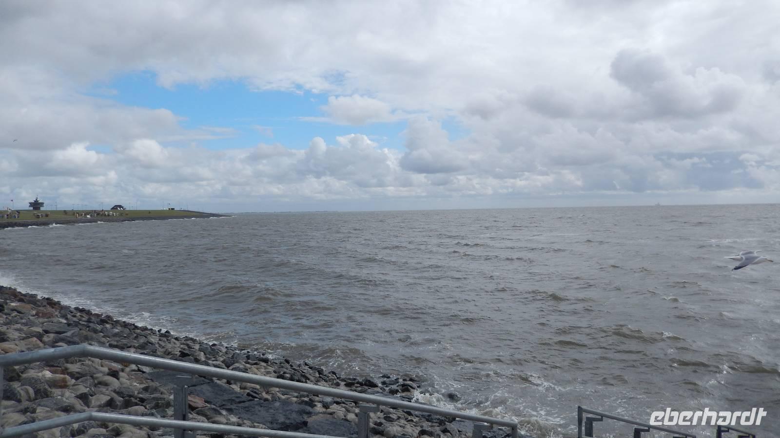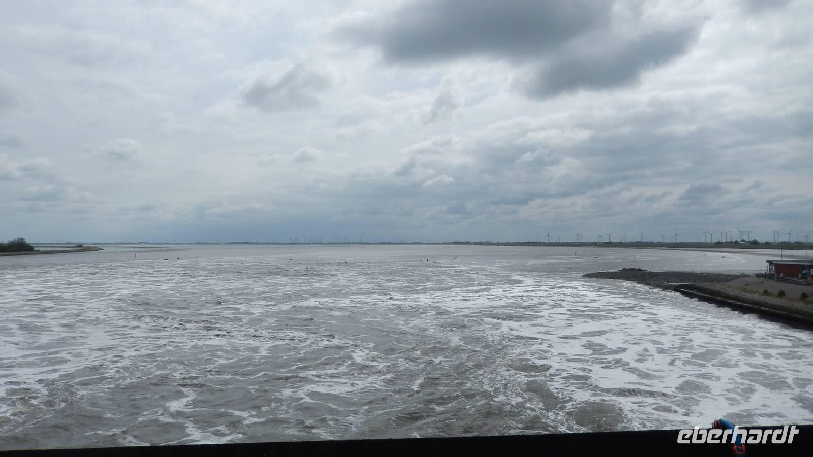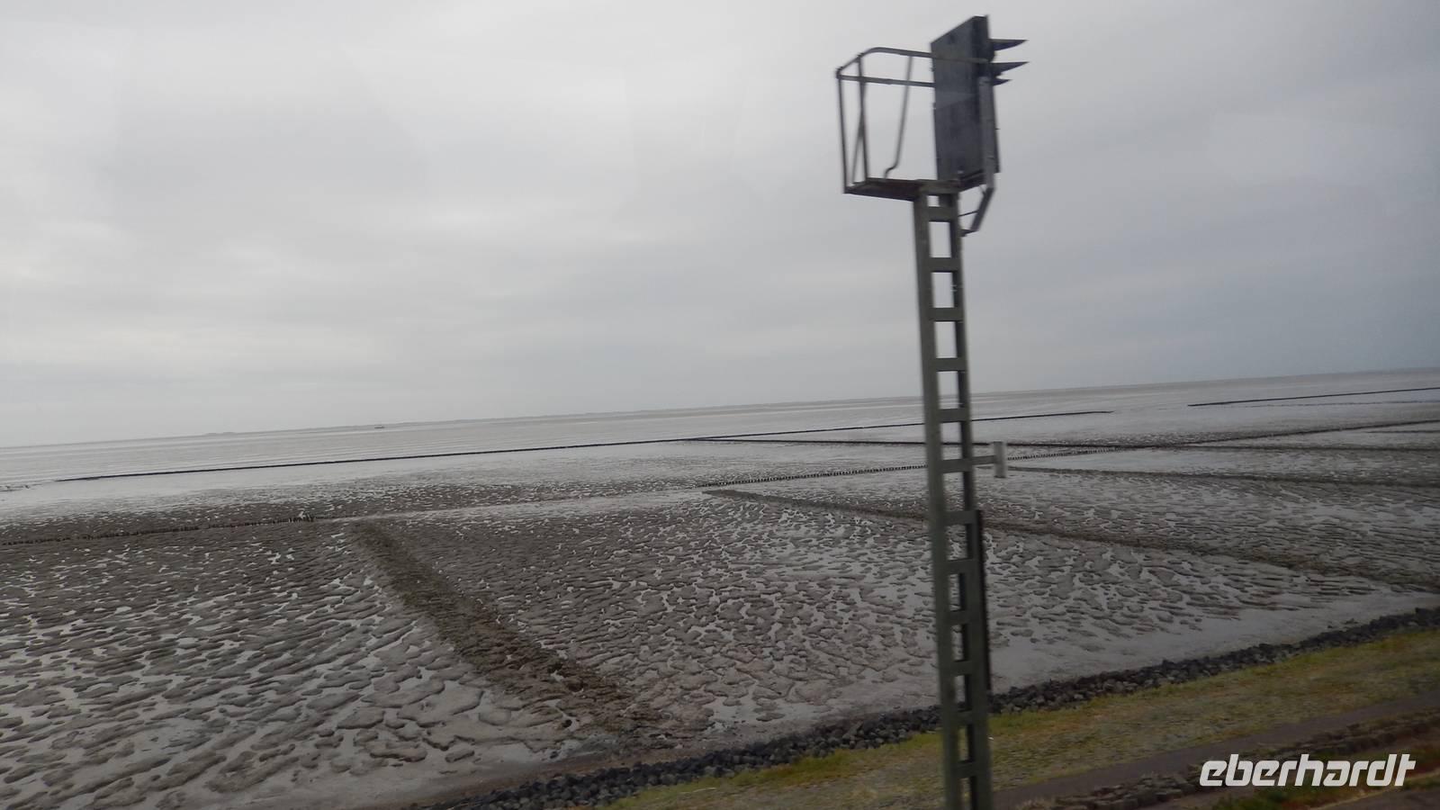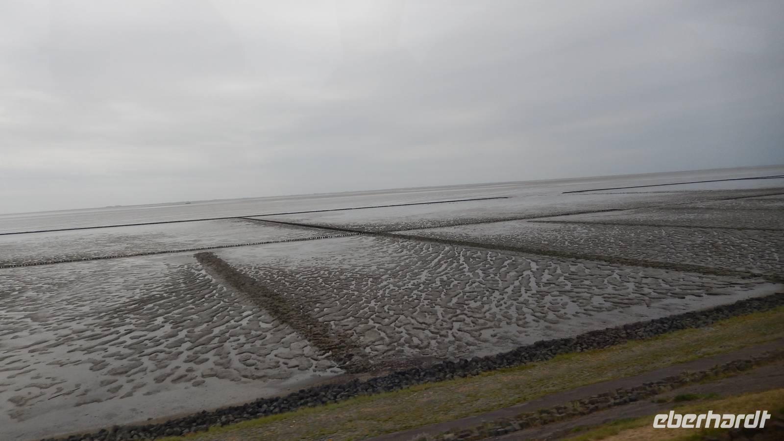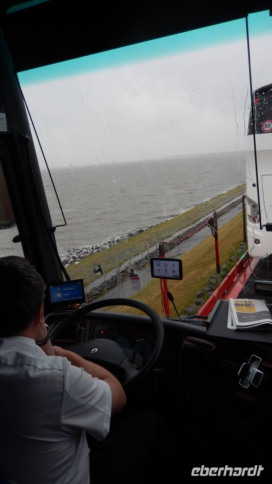Als nächstes besuchten wir St. Peter Ording. Leider stürmte es auch diesmal stark. Dennoch trauten wir uns über die Seebrücke, bis an den Strand. Der lange Sandstrand läd sonst zum baden ein. Aber bei 12° war keinem danach. Nach einer Mittagspause setzten wir unsere Fahrt fort. Mehrmals hielten wir für kurze Fotostopps und blickten über den Deich.